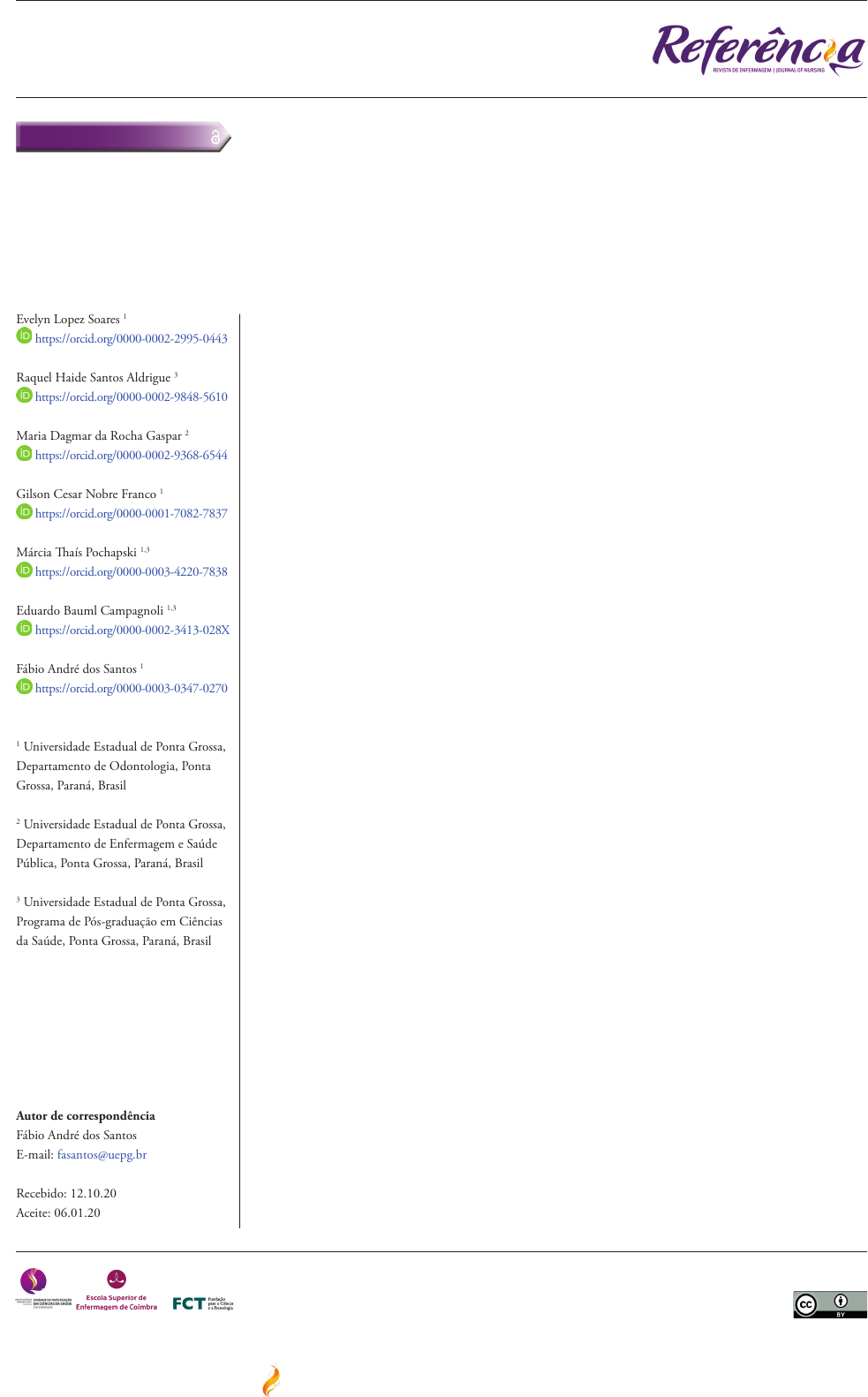 pp. 1 - 8Revista de Enfermagem Referência 2020, Série V, nº6: e20162 DOI: 10.12707/RV20162 Efeito da clorexidina em microrganismos na saliva de doentes internados em unidade de terapia intensiva Effects of chlorhexidine on the salivary microorganisms of patients in intensive care units Efecto de la clorhexidina en los microorganismos de la saliva de pacientes ingresa- dos en una unidad de cuidados intensivos REVISTA DE ENFERMAGEM REFERÊNCIA homepage: https://rr.esenfc.pt/rr/ ISSNe: 2182.2883 ARTIGO DE INVESTIGAÇÃO (ORIGINAL) Como citar este artigo: Soares, E. L., Aldrigue, R. H., Gaspar, M. D., Franco, G. C., Pochapski, M. T., Cam- pagnoli, E. B., & Santos, F. A. (2021). Efeito da clorexidina em microrganismos na saliva de doentes internados em unidade de terapia intensiva. Revista de Enfermagem Referência, 5(6), e20162. https://doi.org/10.12707/RV20162 Resumo Enquadramento: O controlo do biofilme oral com anti-sépticos deve ser adequado aos protocolos elaborados para os doentes na unidade de terapia intensiva (UTI). Objetivo: Avaliar o efeito da solução de clorexidina 0,12% na redução de microrganismos na saliva de doentes de UTI. Metodologia: Estudo coorte com 45 voluntários divididos em: Clínica Médica (controlo, auto higiene oral), UTI não-entubado e UTI entubado. A higiene oral na UTI foi realizada com clorexidina. A análise microbio- lógica foi realizada com a contagem de microrganismos na saliva. A análise dos dados foi feita com ANOVA. Resultados: Houve uma redução dos microrganismos após higiene oral. O controlo apresentou diferença significativa com UTI entubado nos períodos imediato e após 30 min. Doentes entubados apresentaram redução dos microrganismos até 12 horas após higiene com clorexidina. Conclusão: A higiene com clorexidina reduz em até 12 horas os microrganismos bucais de doentes entubados. Estes resultados podem contribuir para elaboração de protocolos de higiene oral em UTI, além de sustentar estratégias como redução nos custos e efeitos colaterais associados à clorexidina. Palavras-chave: higiene oral; clorexidina; contagem de colônia microbiana; pneumonia associada à ventilação mecânica; unidades de terapia intensiva Abstract Background: The control of oral biofilm with antiseptics should follow the protocols designed for patients in intensive care units (ICUs). Objective: To assess the effects of using 0.12% chlorhexidine solution in reducing the number of micro- organisms in the saliva of ICU patients. Methodology: Cohort study with 45 volunteers divided into Medical Clinic (control group, oral self-care), non-intubated ICU, and intubated ICU. Oral hygiene in the ICU was performed with chlorhexidine. Microbiological analysis was performed through salivary bacterial count. Data were analyzed using ANOVA. Results: The number of microorganisms decreased after oral hygiene. A significant difference was found between the control and the ICU intubated groups in the immediate period and after 30 minutes. The number of microorganisms in intubated patients decreased 12 hours after oral hygiene with chlorhexidine. Conclusion: The number of oral microorganisms decreases in intubated patients 12 hours after oral hy- giene with chlorhexidine. These results may contribute to elaborating oral hygiene protocols for ICUs and planning strategies, for example, to reduce the costs and the side effects associated with chlorhexidine use. Keywords: oral hygiene; chlorhexidine; colony count, microbial; pneumonia, ventilator-associated; intensive care units Resumen Marco contextual: El control de la biopelícula oral con antisépticos debe ser adecuado a los protocolos elaborados para los pacientes de una unidad de cuidados intensivos (UCI). Objetivo: Evaluar el efecto de la solución de clorhexidina al 0,12% en la reducción de los microorganismos en la saliva de los pacientes en una UCI. Metodología: Estudio de cohorte con 45 voluntarios divididos en Clínica Médica (control, autohigiene bucal), UCI no intubados y UCI intubados. La higiene bucal en la UCI se realizó con clorhexidina. El análisis microbiológico se realizó con el recuento de microorganismos en la saliva. El análisis de los datos se realizó con ANOVA. Resultados: Hubo una reducción de los microorganismos después de la higiene bucal. El control mostró una diferencia significativa con los pacientes intubados en la UCI en el momento y después de 30 minutos. Los pacientes intubados mostraron una reducción de los microorganismos hasta 12 horas después de la higiene con clorhexidina. Conclusión: La higiene con clorhexidina reduce en un máximo de 12 horas los microorganismos bucales en pacientes intubados. Estos resultados pueden contribuir a la elaboración de protocolos de higiene bucal en las UCI, además de apoyar estrategias como la reducción de costes y los efectos secundarios asociados a la clorhexidina. Palabras clave: higiene bucal; clorhexidina; recuento de colonia microbiana; neumonía asociada al ventilador; unidades de cuidados intensivos Evelyn Lopez Soares 1 https://orcid.org/0000-0002-2995-0443 Raquel Haide Santos Aldrigue 3 https://orcid.org/0000-0002-9848-5610 Maria Dagmar da Rocha Gaspar 2 https://orcid.org/0000-0002-9368-6544 Gilson Cesar Nobre Franco 1 https://orcid.org/0000-0001-7082-7837 Márcia Thaís Pochapski 1,3 https://orcid.org/0000-0003-4220-7838 Eduardo Bauml Campagnoli 1,3 https://orcid.org/0000-0002-3413-028X Fábio André dos Santos 1 https://orcid.org/0000-0003-0347-0270 1 Universidade Estadual de Ponta Grossa, Departamento de Odontologia, Ponta Grossa, Paraná, Brasil 2 Universidade Estadual de Ponta Grossa, Departamento de Enfermagem e Saúde Pública, Ponta Grossa, Paraná, Brasil 3 Universidade Estadual de Ponta Grossa, Programa de Pós-graduação em Ciências da Saúde, Ponta Grossa, Paraná, Brasil Autor de correspondência Fábio André dos Santos E-mail: fasantos@uepg.br Recebido: 12.10.20 Aceite: 06.01.20 https://orcid.org/