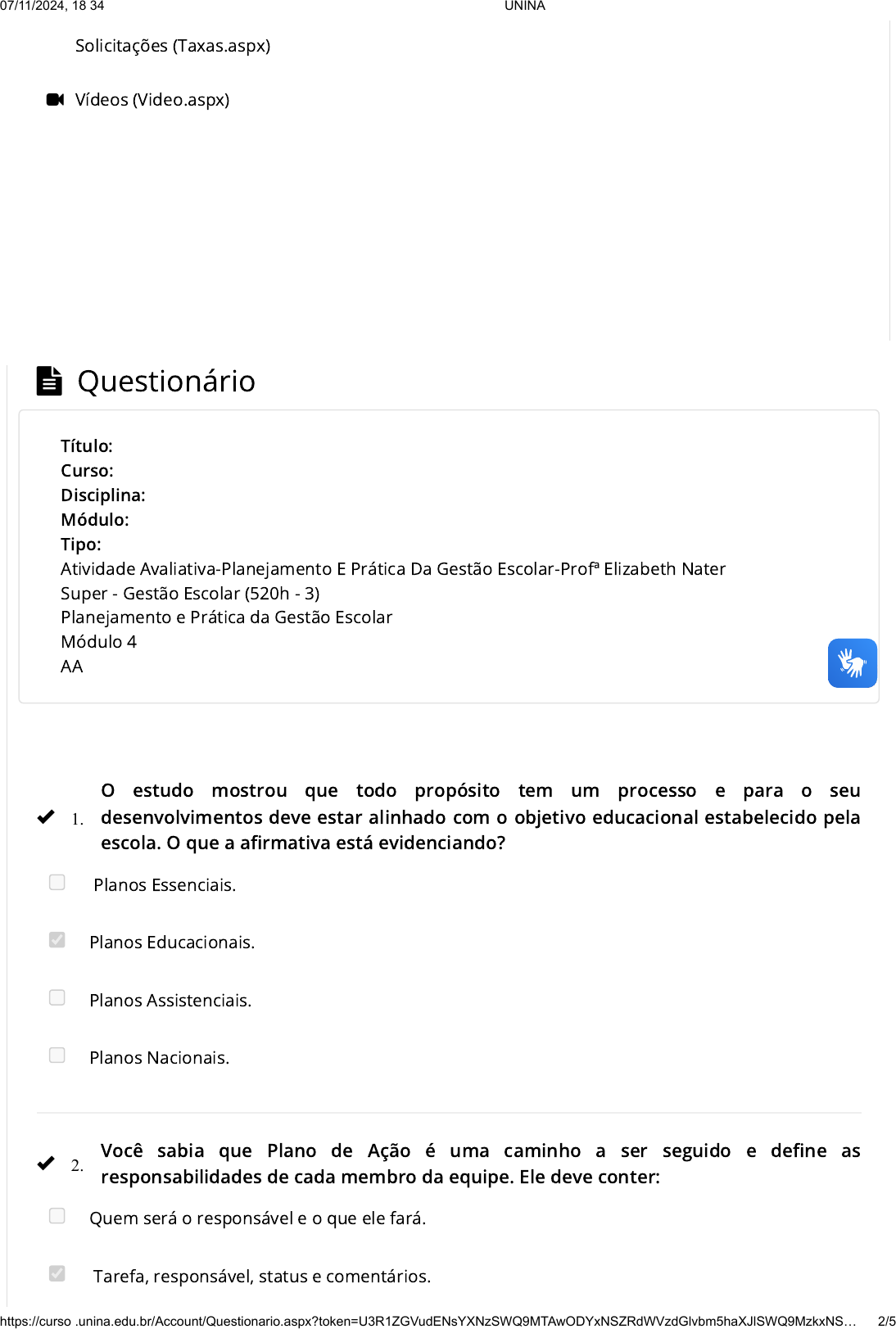 7,2 mil pessoas curtiram isso. Cadastre-se para ver do que seus amigos gostam. Curtir Solicitações (Taxas.aspx) Vídeos (Video.aspx) Questionário O estudo mostrou que todo propósito tem um processo e para o seu desenvolvimentos deve estar alinhado com o objetivo educacional estabelecido pela escola. O que a a�rmativa está evidenciando? Planos Essenciais. Planos Educacionais. Planos Assistenciais. Planos Nacionais. Você sabia que Plano de Ação é uma caminho a ser seguido e de�ne as responsabilidades de cada membro da equipe. Ele deve conter: Quem será o responsável e o que ele fará. Tarefa, responsável, status e comentários. Título: Curso: Disciplina: Módulo: Tipo: Atividade Avaliativa-Planejamento E Prática Da Gestão Escolar-Profª Elizabeth Nater Super - Gestão Escolar (520h - 3) Planejamento e Prática da Gestão Escolar Módulo 4 AA 1. 2. 07/11/2024, 18:34 UNINA https://cursor.unina.edu.br/Account/Questionario.aspx?token=U3R1ZGVudENsYXNzSWQ9MTAwODYxNSZRdWVzdGlvbm5haXJlSWQ9MzkxNS… 2/5 https://www.facebook.com/ad_campaign/landing.php?campaign_id=137675572948107&partner_id=cursor.unina.edu.br&placement=like_plugin&extra_1=https%3A%2F%2Fcursor.unina.edu.br%2F&extra_2=BR https://cursor.unina.edu.br/Account/Taxas.aspx https://cursor.unina.edu.br/Account/Video.aspx Quem será o responsável e quando ele deve atuar. Tarefa, responsável, comentários. O planejamento refere-se a um começo, meio e �m. A participação de mais membros envolvidos na educação possibilita decisões. Um contribuinte sobre o tema planejamento é Vasconcelos, que segundo a sua visão em (2011), aponta ter ele 4 fases. Assinale quais são elas. Planejar, preparar, realizar e modi�car. Planejar, realizar, aguardar e modi�car. Planejar, ajustar, esperar e realizar. Planejar, preparar, acompanhar e revisar. Quando uma instituição escolar não apresenta um planejamento para conduzir sua caminhada, tem grande propensão para: Acertar com o imprevisto. Resolver todas as situações e necessidades apresentadas. Se desgastar. Ser autêntica. Identi�que quais são os níveis de planejamento, que um gestor pode usar em sua prática educativa. Planejamento Tático, Planejamento Operacional, apenas. Planejamento Estratégico, Planejamento Tático, apenas. Planejamento Estratégico, Planejamento Tático, Planejamento Operacional. Planejamento Operacional, Planejamento Utilitário, apenas. O PNE foi sancionado em 25/06 de 2014 e contou com a Campanha Nacional pelo Direito à Educação, cuja sua contribuição signi�cativa é: 3. 4. 5. 6. 07/11/2024, 18:34 UNINA https://cursor.unina.edu.br/Account/Questionario.aspx?token=U3R1ZGVudENsYXNzSWQ9MTAwODYxNSZRdWVzdGlvbm5haXJlSWQ9MzkxNS… 3/5 Tornar o ensino rígido. Redirecionar a educação. Qualidade de ensino. Oferecer dinheiro para criar mais escola particular. Planejar é elaborar um roteiro de ações para se atingir um determinado �m, conforme de�nição do dicionário Aurélio. Com base no conceito lido localize a resposta que diz no que ele auxilia o professor. O planejamento auxilia o professor a elaborar a aula e manter a qualidade da mesma. O planejamento auxilia o professor a seguir uma trajetória, pois ele não antecede decisões. O planejamento auxilia o professor a evitar desa�os. O planejamento auxilia o professor a seguir um caminho sem alteração. Para gerir com um propósito e entender como chegar ao alvo o gestor escolar utiliza uma ferramenta chamada de: Organização. Ritual. Planejamento. Corporação. No século XIX surgiu a escola com um per�l diferenciado, qual NÃO era uma característica dela? Gratuita. Visando Deus. Obrigatória. Universal. 7. 8. 9. 07/11/2024, 18:34 UNINA https://cursor.unina.edu.br/Account/Questionario.aspx?token=U3R1ZGVudENsYXNzSWQ9MTAwODYxNSZRdWVzdGlvbm5haXJlSWQ9MzkxNS… 4/5 UNINA Copyright © 2011 - 2024. Todos direitos reservados. Para que uma instituição de ensino desenvolva suas ações com assertividade ele conta com a presença do Gestor Escolar. Localize a resposta que menciona qual a função do gestor escolar. Gerir, governar, manipular, repreender. Avaliar, controlar, manipular. Comandar, gerenciar, normatizar, punir. Administrar, comandar, gerir, governar. 10. 07/11/2024, 18:34 UNINA https://cursor.unina.edu.br/Account/Questionario.aspx?token=U3R1ZGVudENsYXNzSWQ9MTAwODYxNSZRdWVzdGlvbm5haXJlSWQ9MzkxNS… 5/5