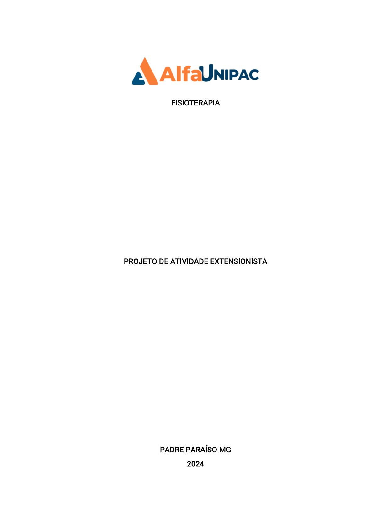 1 FISIOTERAPIA Selma Ribeiro Nepomuceno Camila Dias Thaís Gonçalves Sabrina Vieira Sthefany Lopes Érica Batista Maria Eduarda Colares Taís Dutra PROJETO DE ATIVIDADE EXTENSIONISTA PADRE PARAÍSO-MG 2024 Selma Ribeiro Nepomuceno Camila Dias Thaís Gonçalves Sabrina Vieira Sthefany Lopes Érica Batista Maria Eduarda Colares Taís Dutra PROJETO DE ATIVIDADE EXTENSIONISTA Projeto apresentado como requisito parcial para aprovação na disciplina Prática Extensionista do curso de gradação em Fisioterapia da faculdade AlfaUnipac Professora: Mariana Leal Oliveira Tutora: Wenny Mota PADRE PARAÍSO-MG 2024 3 SUMÁRIO INTRODUÇÃO...........................................................................................................05 OBJETIVO.................................................................................................................05 PÚBLICO/ALVO........................................................................................................05 METODOLOGIA........................................................................................................05 CRONOGRAMA.........................................................................................................05 FICHA DE IDENTIFICAÇÃO DO ACADÊMICO DADOS PESSOAIS Nome: Sabrina Vieira Miranda Endereço Residencial: Comunidade Duas Barras Bairro: Zona Rural Cidade: Padre Paraíso Estado:Minas Gerais CEP: 39818000 Telefone: (33)98427-5735 DADOS PROFISIONAIS (Caso não haja vínculo empregatício excluir esse tópico do documento) Profissão: Local de serviço: Endereço: Telefone: Cargo e/ou função: Horário de trabalho/turnos: Outras experiências: 5 INTRODUÇÃO O uso de copos descartáveis é prejudicial ao meio ambiente e à saúde por vários motivos, incluindo tempo de decomposição, acúmulo de resíduos, emissão de gases poluentes, dentre outros. O projeto de intervenção visa levar a conscientização e mudança no uso de descartáveis na comunidade. A proposta é substituir os copos descartáveis por copos reutilizáveis, e o objetivo é a preservação do meio ambiente. OBJETIVO O objetivo é gerar a conscientização de hábitos ambientais saudáveis maximizando a importância do uso de materiais orgânicos recicláveis que não degradem o meio ambiente. PÚBLICO ALVO O público alvo são pessoas de todas as idades, crianças, adolescentes, adultos e idosos que frequentam as celebrações dominicais. METODOLOGIA Ofertaremos um café da manhã onde utilizaremos copos reutilizados para que possam ser usados em substituição dos copos descartáveis de plástico que são geralmente utilizados, e distribuição de panfletos educativos. CRONOGRAMA A ação de intervenção será realizada em 10 de novembro de 2024, na Igreja Católica da comunidade rural Barra Nova I, às 09h da manhã.