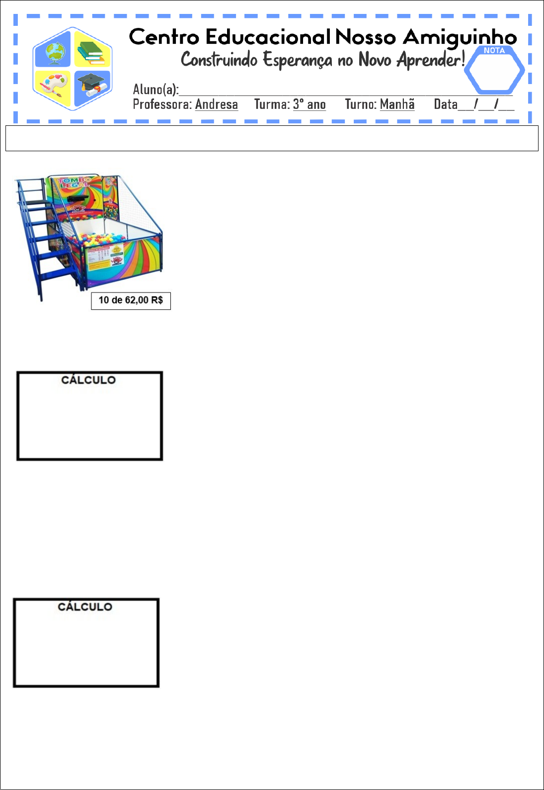 AVALIAÇÃO BIMESTRAL DE MATEMÁTICA 1. Observe o brinquedo que está em promoção: Qual o valor total do brinquedo acima? Resposta: _______________________________ 2. Em um campeonato de futebol, cada vitória vale oito pontos. Quantos pontos tem um time que já possui cinco vitórias? Resposta: _______________________________ 3. Na escola de Caio, começaram os preparativos para as Olimpíadas. A cerimônia acontecerá no ginásio da escola, dividido em 4 setores. Em cada setor cabem 50 pessoas. Quantas pessoas poderão assistir à cerimônia? 4. Para um passeio de uma escola, foram contratados 2 ônibus. Cada ônibus tem a capacidade para transportar 23 alunos. Quantos alunos esses ônibus conseguem transportar? a) 46 alunos. b) 40 alunos. c) 32 alunos. d) 23 alunos. 5. Resolva as multiplicações abaixo: a) 260 X 2 = _____ b) 360 X 3 = _____ c) 300 X 4= _____ d) 260 X 5 = _____ 6. Pedro fabricou uma tonelada de ração. Quantos quilogramas corresponde a essa tonelada? a) 10 kg b) 100 kg c) 500 kg d) 1.000 kg 7. Relacione as siglas abaixo com suas unidades de medida correspondentes. 8. Marque um X na alternativa que mostra o instrumento usado para medir o comprimento de uma parede. 9. Observe a imagem abaixo e responda. Sabendo que os abacaxis têm o mesmo peso, quantos gramas cada um deles possui? ( ) 10 gramas. ( ) 100 gramas. ( ) 200 gramas. ( ) 250 gramas. 10. Sabe-se que uma jarra de 2 litros de suco enche 10 copos. Desse modo, cada copo possui quantos mililitros? a) 200 ml. b) 250 ml. c) 350 ml. d) 500 ml. BOA PROVA! COM CARINHO, TIA ANDRESA. AVALIAÇÃO BIMESTRAL DE PORTUGUÊS Leia o texto e responda a pergunta: 1. A mãe pede ao filho para não esquecer o casaco porque a) é uma mãe zelosa. b) é uma mãe desatenta. c) seu filho é atencioso. d) seu filho é cuidadoso. Leia e responda: 2. No texto, o uso da palavra “irmão” indica a) consideração. b) desprezo. c) ironia. d) humor. Leia e responda: 3. O padrão de linguagem usada no texto é a) técnica. b) regional. c) religiosa. d) informal. Leia e responda: 4. Na mensagem, a palavra “luta” indica a) briga. b) disputa. c) esforço. d) zanga. Leia o texto abaixo e responda às questões: 5. Para quem esse texto foi escrito? __________________________________ 6. Quem escreveu esse bilhete? ___________________________________ 7. Observe as palavras listadas na tabela abaixo. Reescreva as palavras acima no lugar correto, de acordo com a sua classificação. 8. Circule as palavras abaixo que podem ser classificadas como proparoxítona. Leia o texto e resolva às questões 4 e 5: Gatos podem ser engraçados Um dos comportamentos mais curiosos desses bichanos ocorre quando eles se deparam com uma planta esverdeada de nome de erva-gateira. Este arbusto é capaz de levar gatos domésticos e outros felinos, como leões e linces, a um estado intrigante de total euforia. Basta uma cheiradinha nas folhas da erva-gateira para esses animais fofinhos começarem a rolar, se esfregar, lamber e morder suas folhas, numa euforia que pode durar vários minutos. Ciências Hoje (Texto adaptado por TSA) 4. Leia o título para responder às questões: a) Qual palavra do título é um adjetivo? ___________________________ b) Qual palavra esse adjetivo está qualificando? ___________________________ 10. Localize no texto os adjetivos dos seguintes substantivos: a) Gatos: ___________________ b) Animais: __________________ c) Planta: ___________________ BOA PROVA! COM CARINHO, TIA ANDRESA. AVALIAÇÃO BIMESTRAL DE CIÊNCIAS 1. Observe a imagem: O solo é uma camada da superfície terrestre chamada chão ou terra. É sobre o solo que caminhamos, construímos nossas casas, estradas, entre outras atividades. Geralmente o solo é composto de: a) Matéria orgânica e rochas decompostas. b) Asfalto e matéria orgânica. c) Concreto e piso de cerâmica. d) Petróleo e rochas decompostas. 2. Um dos aspectos que afetam o solo é a poluição. Marque a alternativa que só possui elementos que poluem o solo. a) Folhas secas e lixo. b) Cascas de frutas e folhas. c) Chuva e Sol. d) Agrotóxicos e lixo. 3. Observe: O solo __________________ é formado por partículas pequenas e leves, por isso, tem a tendência de sofrer erosão (desgaste ou arrastamento da terra por ação da água, do vento, de transporte ou de outros agentes). A opção que completa o texto acima é: a) arenoso. b) calcário. c) humoso. d) argiloso. 4. Veja a imagem abaixo. Água, sua linda A imagem se relaciona ao uso excessivo de que produto? a) Combustíveis fósseis. b) Agrotóxicos. c) Recursos naturais. d) Minerais. 5. Relacione cada imagem ao seu sistema correspondente. 6. Marque no caça-palavras funções que desempenhamos através dos sistemas muscular e esquelético. 7. O sistema circulatório é o responsável pelo transporte de sangue, oxigênio e nutrientes para todo o corpo humano. Qual o órgão que bombeia o sangue em nosso organismo? a) Pulmão. b) Fígado. c) Coração. d) Intestino. 8- O que aconteceria se as cartilagens protetoras das articulações não existissem? 9- Se os joelhos não tivessem articulações, como nós andaríamos? Quais atividades não conseguiríamos executar? 10- Apesar de serem muito resistentes, os ossos podem se curvar levemente quando uma força é aplicada sobre eles. Nos casos em que essa força é muito intensa, ocasionando: a) fraturas b) leves lesões c) boa postura d) sustentação BOA PROVA! COM CARINHO, TIA ANDRESA AVALIAÇÃO BIMESTRAL DE HISTÓRIA 1. Sobre patrimônio cultural, assinale a alternativa FALSA: a) A conservação da cultura de um povo depende da proteção de seus bens importantes. b) A proteção da cultura material e imaterial depende exclusivamente dos governantes. c) O patrimônio histórico é um legado deixado pelos mais velhos para as novas gerações. d) Nem todo imóvel ou tradição pode ser considerado (a) um patrimônio histórico cultural. 2. Com suas palavras, defina o que é Patrimônio Histórico Cultu