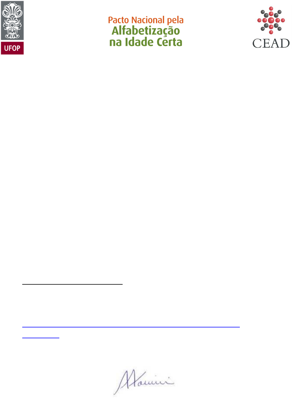 CAMPUS UNIVERSITÁRIO, S/Nº – MORRO DO CRUZEIRO – CEP: 35400-000 – OURO PRETO – MG – BRASIL www.cead.ufop.br – secretaria.pacto.ufop@gmail.com – Fone: (31) 3559.1461 Ofício: 010 /2014 Ouro Preto, 02 de Junho de 2014. De: Coordenação PNAIC – CEAD / UFOP Para: Coordenadores Locais e Orientadores de Estudo Assunto: Alteração da data da 3ª viagem a Poços de Caldas – MG Prezados Coordenadores Locais e Orientadores de Estudo: Informamos que a data do 2º Encontro de Formação de Orientadores de Estudo, que seria realizado em julho, no período de 22 a 25/07/2014, foi alterada para o período de 26 a 29 de agosto de 2014 . Fomos informados que no período que estava prevista a formação, tanto os Servidores e quanto a Autarquia Municipal de Ensino de Poços de Caldas-MG estarão em férias regulamentares e, por esse motivo, não poderemos utilizar as instalações da Autarquia. Outro fator que nos levou a realizar a alteração foi a consulta que realizamos na rede de hotéis de Poços de Caldas, cuja resposta foi que não haveria disponibilidade para hospedagem de todos os Orientadores de Estudo, em virtude de ser período de férias escolares, época em que o turismo aumenta consideravelmente na cidade. A data do segundo encontro de formação passa, assim para agosto, o terceiro para setembro (de 23 a 26/09/2014) e o quarto para novembro (de 25 a 28/11/2014). As alterações de datas e o novo calendário PNAIC – CEAD / UFOP 2014 seguem em anexo e também se encontram disponíveis no site do Pacto: http://www.cead.ufop.br/index.php/cursos-de-aperfeicoamento/pacto-nacional- alfabetizacao Atenciosamente, Profa. Adriana Maria Tonini Coordenação Geral do PNAIC-CEAD-UFOP
