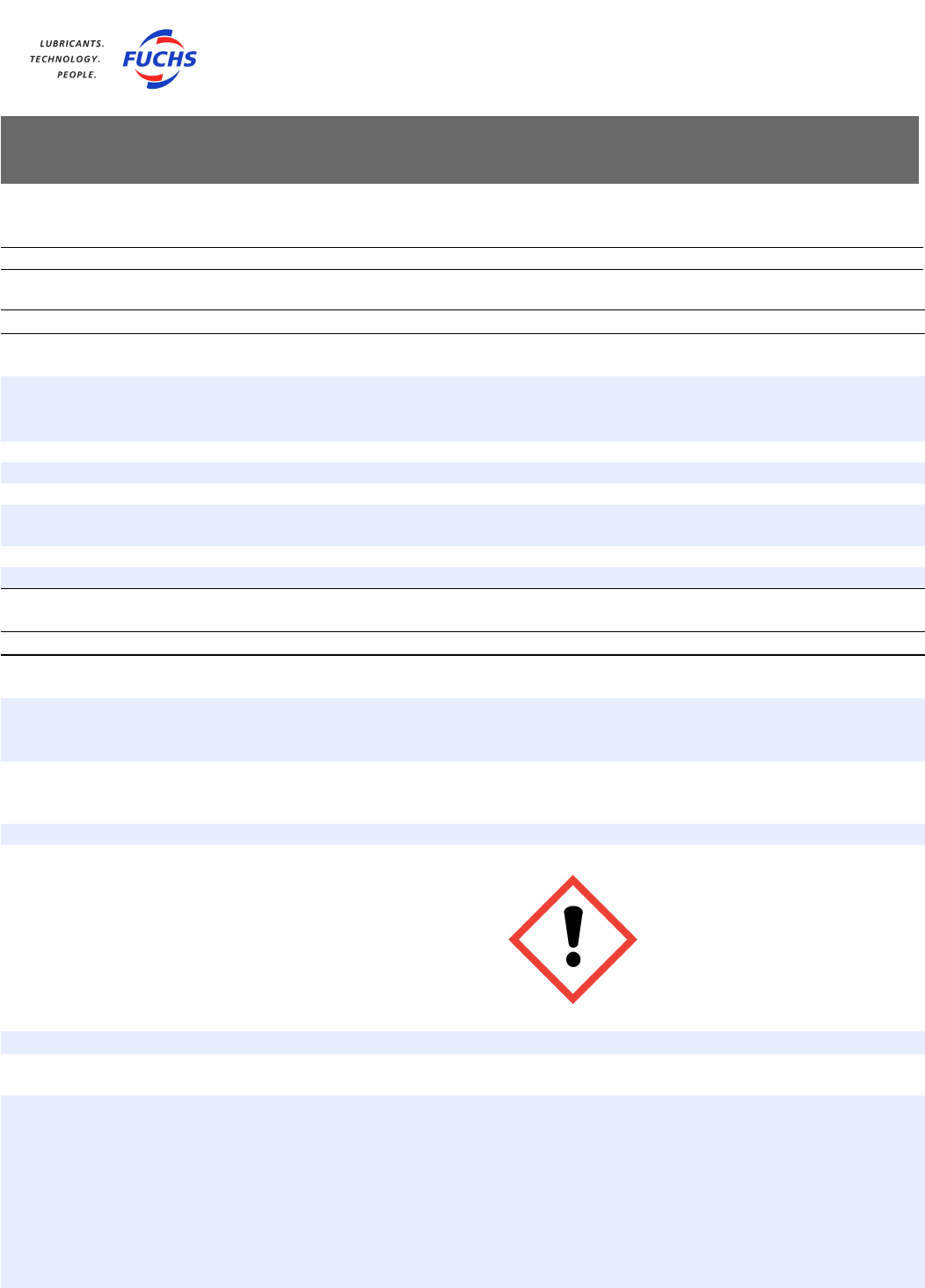 FISPQ Em conformidade com NBR 14725:2014 FICHA DE INFORMAÇÕES DE SEGURANÇA DE PRODUTOS QUÍMICOS Produto: RENOLIN B 5 VG 22 Revisão: 01 Data: 05/12/2017 Página: 1/ 7 1 - IDENTIFICAÇÃO Nome do produto (nome comercial): RENOLIN B 5 VG 22 Principais usos recomendados para substância ou mistura: ÓLEO HIDRÁULICO E LUBRIFICANTE. Nome da empresa: FUCHS LUBRIFICANTES DO BRASIL LDTA. Endereço: Via de acesso João de Góes, 1110, CEP: 06422-150, Barueri - SP - Brasil Telefone para contato: (11) 4789-2311 Telefone para emergências: (11) 4789-2311 Fax: (11) 4789-2670 E-mail: fuchs@fuchsbr.com.br 2 - IDENTIFICAÇÃO DE PERIGOS Classificação de perigo do produto qúımico: Sensibilização à pele - Categoria 1 Sistema de classificação utilizado: Norma ABNT-NBR 14725-2:2009 - versão corrigida 2:2010. Sistema Globalmente Harmonizado para a Classificação e Rotulagem de Produtos Qúımicos, ONU. Outros perigos que não resultam em uma classificação: O produto não possui outros perigos. Elementos apropriados da rotulagem Pictogramas: Palavra de advertência: ATENÇÃO Frases de perigo: H317 Pode provocar reações alérgicas na pele. Frases de precaução: PREVENÇÃO: P261 Evite inalar névoas ou vapores aerossóis. P272 A roupa de trabalho contaminada não pode sair do local de trabalho. P280 Use luvas de proteção, roupa de proteção, proteção ocular e proteção facial. RESPOSTA À EMERGÊNCIA: P302 + P352 EM CASO DE CONTATO COM A PELE: Lave com água e sabão em abundância. P321 Tratamento espećıfico. FISPQ Em conformidade com NBR 14725:2014 FICHA DE INFORMAÇÕES DE SEGURANÇA DE PRODUTOS QUÍMICOS Produto: RENOLIN B 5 VG 22 Revisão: 01 Data: 05/12/2017 Página: 2/ 7 P333 + P313 Em caso de irritação ou erupção cutânea: Consulte um médico. P362 + P364 Retire a roupa contaminada. Lave-a antes de usá-la novamente. DISPOSIÇÃO: P501 Descarte o conteúdo e o recipiente em conformidade com as regulamentações locais. 3 - COMPOSIÇÃO E INFORMAÇÕES SOBRE OS INGREDIENTES MISTURA Ingredientes ou impurezas que contribuem para o perigo: Óleo lubrificante (petróleo), c24-c50, desaromatizado por solvente, desparafinado, hidro- genado (CAS 101316-72-7): 70,0 - 80,0% Óleo lubrificante básico (CAS 74869-22-0): 20,0 - 30,0% Segredo industrial 1:dos constituintes do produto, abaixo dos limites de exposição ocupacional indicados. Medidas de proteção pessoal Proteção dos olhos/face: Óculos de proteção. Proteção da pele e do corpo: Sapatos fechados e vestimenta de proteção adequada. Luvas de proteção adequadas. Proteção respiratória: Uma avaliação de risco deve ser realizada para adequada definição da proteção respiratória tendo em vista as condições de uso do produto. Siga orientação do Programa de Proteção Respiratória (PPR), Fundacentro. Perigos térmicos: Não apresenta perigos térmicos. 9 - PROPRIEDADES FÍSICAS E QUÍMICAS Aspecto (estado f́ısico, forma e cor): Ĺıquido levemente amarelado Odor e limite de odor: Caracteŕıstico pH: Não dispońıvel Ponto de fusão/ponto de congelamento: Não dispońıvel. Ponto de ebulição inicial e faixa de temperatura de ebulição: Não dispońıvel. Ponto de fulgor: 200◦C (vaso fechado) Taxa de evaporação: Não dispońıvel. Inflamabilidade (sólido; gás): Não aplicável. Limite inferior/superior de inflamabilidade ou explosividade: Não dispońıvel. Pressão de vapor: Não dispońıvel Densidade de vapor: Não dispońıvel Densidade relativa: 0,863 (água a 4◦C=1) a 20◦C Solubilidade(s): Imisćıvel em água. Coeficiente de partição - n-octanol/água: Não dispońıvel. FISPQ Em conformidade com NBR 14725:2014 FICHA DE INFORMAÇÕES DE SEGURANÇA DE PRODUTOS QUÍMICOS Produto: RENOLIN B 5 VG 22 Revisão: 01 Data: 05/12/2017 Página: 5/ 7 Temperatura de autoignição: Não dispońıvel. Temperatura de decomposição: Não dispońıvel. Viscosidade: Cinemática: 22 mm2/s a 40◦C Outras informações: Ponto de fluidez: -27◦C 10 - ESTABILIDADE E REATIVIDADE Estabilidade e reatividade: Produto estável em condições normais de temperatura e pressão. Possibilidade de reações perigosas: Não são conhecidas reações perigosas com relação ao produto. Condições a serem evitadas: Temperaturas elevadas. Contato com materiais incompat́ıveis. Materiais incompat́ıveis: Ácido ńıtrico, ácidos, agentes oxidantes fortes e agentes redutores. Produtos perigosos da decomposição: Quando em combustão, poderá liberar o monóxido de carbono além do dióxido de carbono 11 - INFORMAÇÕES TOXICOLÓGICAS Toxicidade aguda: Não é esperado que o produto apresente toxicidade aguda. Corrosão/irritação à pele: Não é esperado que o produto provoque irritação da pele. Lesões oculares graves/irritação ocular: Não é esperado que o produto provoque irritação ocular. Sensibilização respiratória ou à pele: Pode provocar reações alérgicas na pele. Não é esperado que o produto apresente sensibilização respiratória. Mutagenicidade em células germinativas: Não é esperado que o produto apresente mutagenicidade em células germinativas. Carcinogenicidade: Não é esperado que o produto apresente carcinogenicidade. Toxicidade à reprodução: Não é esperado que o produto apresente toxicidade à reprodução. Toxicidade para órgãos-alvo espećıficos - exposição única: Não é esperado que o produto apresente toxicidade ao órgão-alvo espećıfico por exposição única. Toxicidade para órgãos-alvo espećıficos - exposição repetida: Não é esperado que o produto apresente toxicidade ao órgão-alvo espećıfico por exposição repetida. Perigo por aspiração: Não é esperado que o produto apresente perigo por aspiração. 12 - INFORMAÇÕES ECOLÓGICAS Efeitos ambientais, comportamento e impactos do produto Ecotoxicidade: Não é esperado que o produto apresente ecotoxicidade. Persistência e degradabilidade: É esperado que o produto apresente persistênc