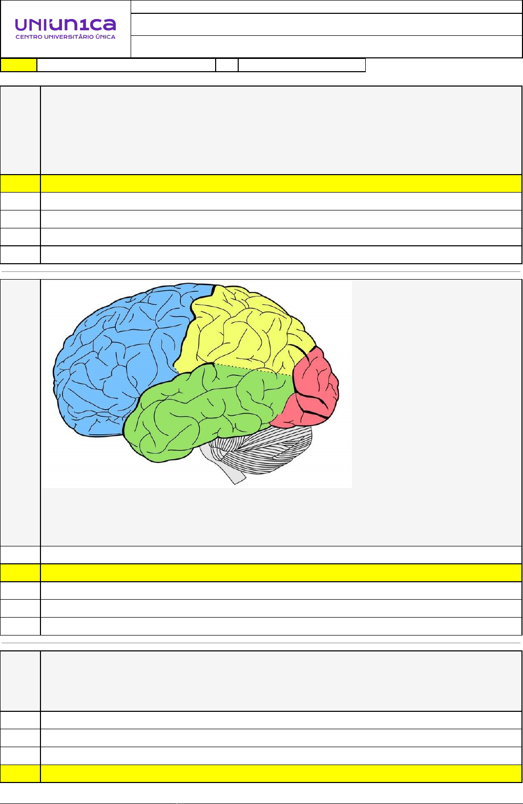08/11/2024 10:53:18 1/3 REVISÃO DE SIMULADO Nome: SULAMITA DE CÁSSIA NEVES DE SOUZA Disciplina: Fundamentos Psicopedagógicos Respostas corretas são marcadas em amarelo X Respostas marcardas por você. Questão 001 A aprendizagem humana ocorre dentro do sistema nervoso central, o órgão cérebro coloca nossos sentidos para trabalhar onde as informações serão processadas, compreendidas e armazenadas. Fonte: http://www.criacionismo.com.br/2018/04/cerebro-humano-e-capaz-de-trabalhar-com.html Assinale a alternativa que se refere a capacidade de aprendizado. X A) Plasticidade Cerebral. B) Atenção. C) Axônios. D) Emoção. E) Motivação. Questão 002 Fonte: https://www.educamaisbrasil.com.br/enem/biologia/cerebro A imagem acima demonstra a estrutura do cérebro humano, este órgão tem 80% da massa total do encéfalo. Em nossos estudos aprendemos que ele é formado por dois hemisférios que são unidos pelo: A) lobo occipital. X B) corpo caloso. C) sulco. D) giro. E) lobo parietal. Questão 003 Os estímulos direcionados aos órgãos dos sentidos ocorrem a partir de impulsos nervosos que saem dos receptores da periferia do corpo e acabam atingindo os neurônios sensitivos, motores e de associação. Que se encontram tanto no sistema nervoso periférico e: A) na hipófise X B) no córtex cerebral C) no sulco cingulado D) na medula espinhal 08/11/2024 10:53:18 2/3 E) no cerebelo Questão 004 Sabemos que o cérebro humano é uma estrutura fundamental para o funcionamento do nosso corpo. Ele é responsável pelas atividades mais essenciais de nosso organismo e, influencia, também, no nosso comportamento. A partir dos estudos realizados nesta unidade, a partir da função relatada, qual não pode ser associada ao desempenho cerebral? A) Consciência. B) Memória. X C) Equilíbrio. D) Linguagem. E) Comportamento Emocional. Questão 005 Analise a imagem a seguir: A partir da imagem acima nomeie, as funções cerebrais: A) Lobo Occipital, Lobo Temporal e Lobo Parietal. B) Córtex Cerebral, Sulco Cingulado e Corpo Caloso. C) Diencéfalo, Comissura anterior e Lobo Temporal X D) Hemisfério Esquerdo, Fissura Longitudinal e Hemisfério Direito. E) Mesencéfalo, Ponto de Varólio e Cerebelo. Questão 006 As lesões cerebrais ocasionadas por acidentes são mais fáceis de serem recuperadas em crianças do que em adultos, isso porque seus neurônios tem uma maior capacidade de lançar mão de alguns mecanismos adaptativos. As lesões normalmente acontecem em quais regiões? A) Lobo central e occipital do hemisfério sublingual. B) Lobo parietal e insular do hemisfério craniano. C) Lobo frontal e insular do hemisfério esquerdo. D) Lobo occipital e frontal do hemisfério direito. X E) Lobo temporal e parietal do hemisfério dominante. 08/11/2024 10:53:18 3/3 Questão 007 É fato que os profissionais da educação têm presenciado cada vez mais crianças que não conseguem atingir a aprendizagem esperada; com isso surge alguns sentimentos, como: preocupação, incapacidade, frustração, decepção e, às vezes, aversão ao aluno. Na era da modernidade inúmeros especialistas tem procurado entender como as crianças se apropriam do saber, um desses conceitos tem sido amplamente discutido, que conceito é esse? A) Redirecionamento social. X B) Dimensão cognitiva. C) Dimensão motora. D) Dimensão afetiva. E) Plasticidade cerebral. Questão 008 É fundamental que o Psicopedagogo tenha conhecimento acerca da natureza das condições tanto normais quanto patológicas do desenvolvimento neural da criança. Isso porque, uma boa evolução de um feto depende de alguns fatores externos, como forma de evitar distúrbios, deficiências mentais e doenças neurodegenerativas. Quando uma criança desenvolve alguns destes quadros, podemos associá-lo a: A) hereditariedade na aquisição deste quadro. B) um desenvolvimento do sistema nervoso central com defeitos. C) carência emocional e afetiva por parte dos pais. D) desenvolvimento neural precoce. X E) a má nutrição do cérebro devido a hábitos alimentares.