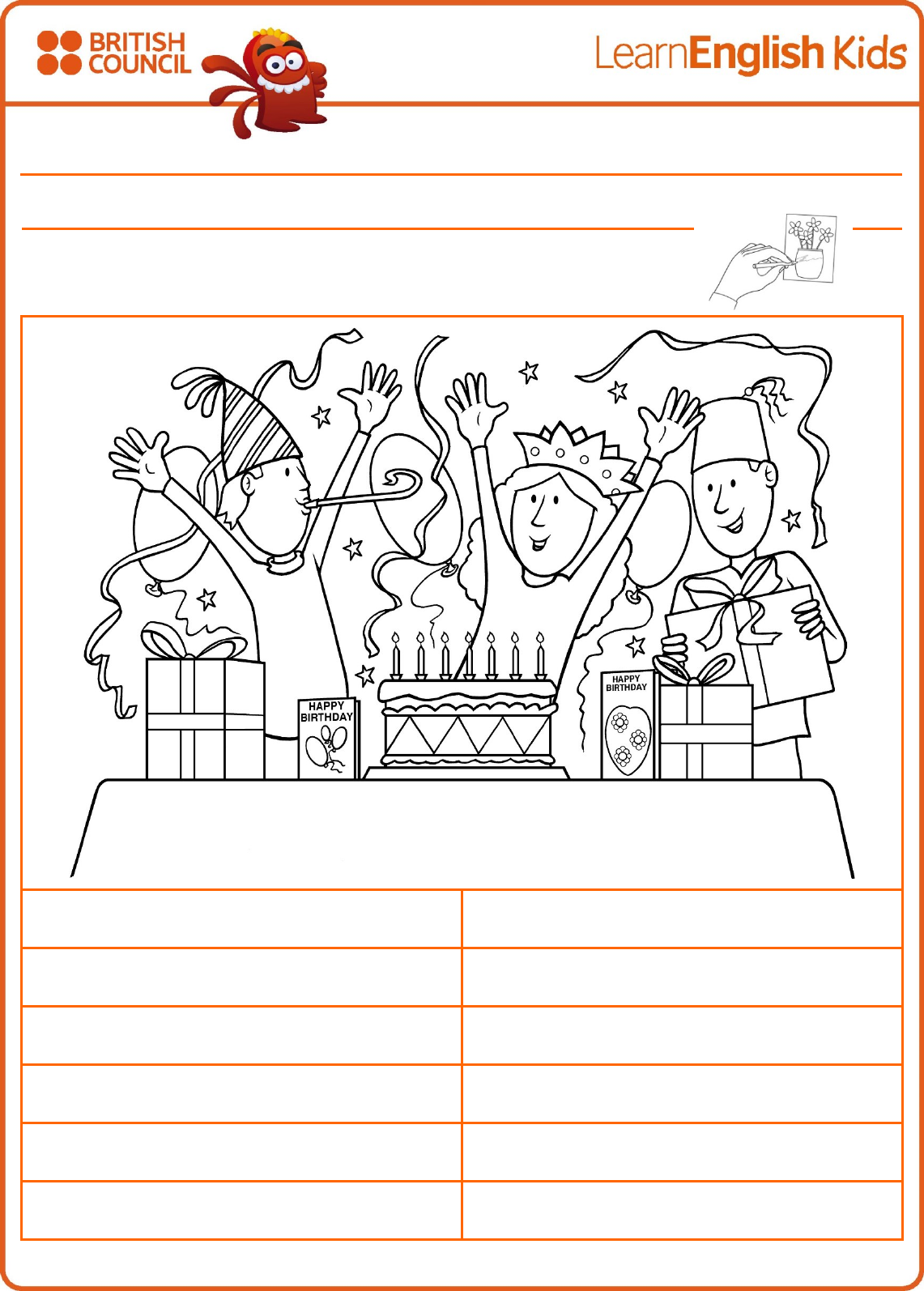 www.britishcouncil.org/learnenglishkids © British Council, 2018 The United Kingdom’s international organisation for educational opportunities and cultural relations. We are registered in England as a charity. Birthday party Read and colour! Read the sentences and colour the picture. Colour the first boy’s hat green. Colour the balloons purple. Colour the first boy’s top grey. Colour the streamers orange. Colour the girl’s crown yellow. Colour the presents blue and grey. Colour the girl’s top blue. Colour the cards purple and red. Colour the second boy’s hat red. Colour the cake pink and yellow. Colour the second boy’s top black. Colour the table brown.