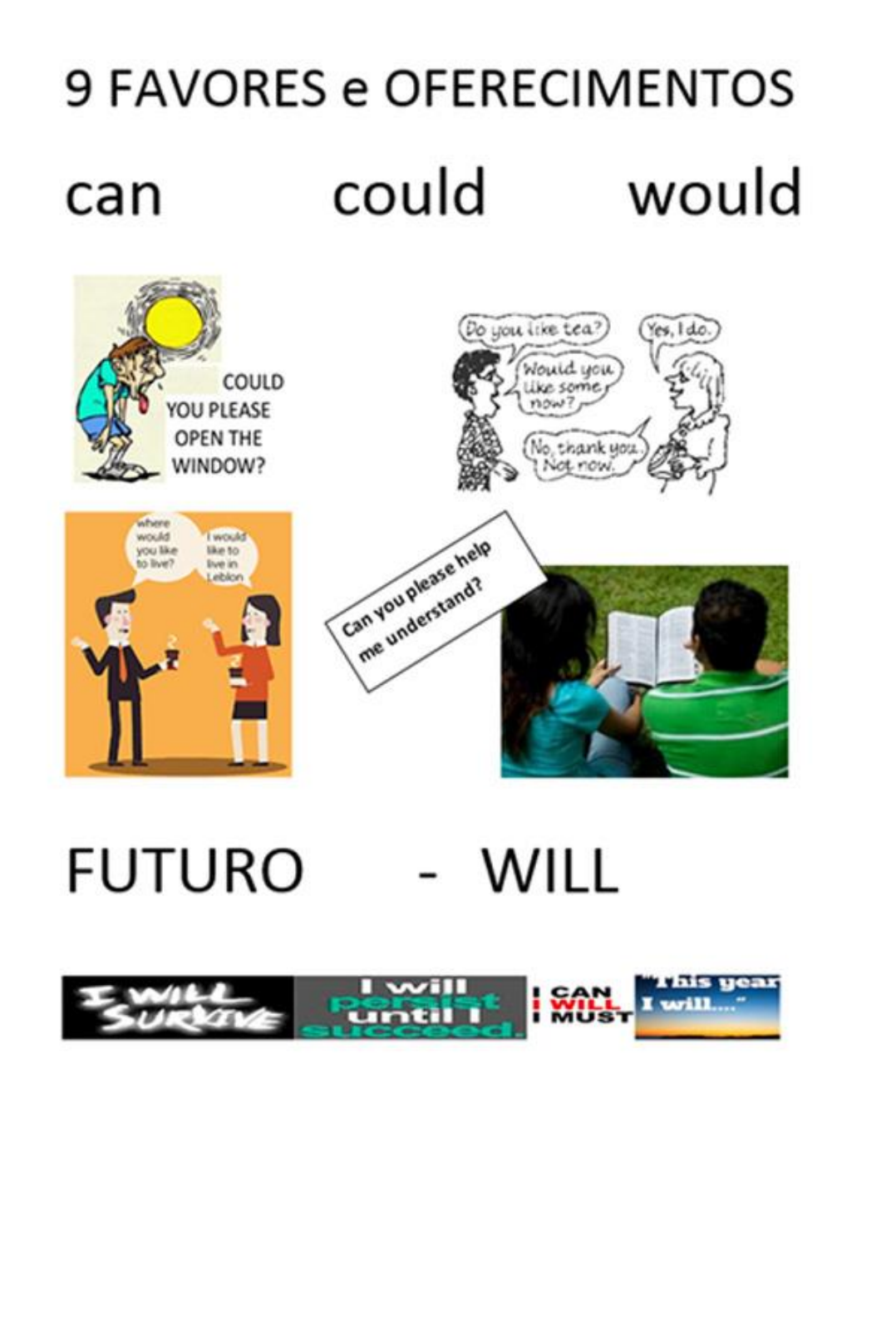 CAN você já aprendeu: é o verbo poder (can) e COULD é seu passado (podia, poderia), ambos os termos usados para pedir favores: Can you help me with these exercises? Can I use your book? Can you please speak louder? Can I come in? Can you repeat that, please? Could you explain the gramar one more time? Could you say that again? Could you go to the store with me? Could you hold this package, please? Could you explain again, please? Could you translate this word, please? Can I see your book? WOULD é também usado tanto para pedir favores, quanto para oferecer ou perguntar coisas: Favores: Would you please come here? Would you please repeat your name? Would you please close the door? WOULD É TAMBÉM MUITO USADO PARA PERGUNTAR COISAS, COM SENTIDO DE: VOCÊ GOSTARIA DE…? Would you like to live in Rio? Would you like to be rich? Where would you like to live? Who would you like to meet? Where would you like to work? Oferecimento: WOUD YOU LIKE a coke? Would you like some coffee? Would you like me to help you? A expressão “WOULD YOU LIKE” é muito comum para se oferecer coisas ou perguntar se você quer/queria algo. Familiarize-se com essa expressão. Would you like a coffee? Would you like some help? Would you like to live in Rio? Would you like to change Jobs? Pense agora em muitos favores com CAN COULD WOULD Agora pense em oferecer coisas com “Would you like a biscuit? Agora pense em perguntar coisas com “would you like to learn French? Would you like to speak English fluently? Futuro com “will” WILL é uma palavra (um “verbo auxiliar”) que, acompanhada de um verbo. Serve para indicar o futuro: I will learn English! É o futuro do tipo “Eu aprenderei Inglês”. Veja mais exemplos: The teacher will correct the tests in the afternoon. The President will explain. CONTRAÇÃO: I will = I´ll – I´ll arrive late. I WILL ARRIVE LATE Para fazer perguntas, uma regra comum em inglês: inverte-se a posição do verbo: You will come to class tomorrow. (afirmação) - Will you come to class tomorrow? (pergunta) Para fazer frases negativas simplesmente acrescentamos “not” após “will”. I will not take the car to the garage. CONTRAÇÃO - I will not = I won´t . I won´t travel next summer. I won´t study next weekend. Utilize sua lista de verbos e tente traduzir as frases abaixo. Umas são com “podia” (COULD), outras são com “pode” (CAN), algumas com WOULD outras são com WILL mostrando o futuro. COULD 1. Você poderia me dizer onde é a facuçdade? Could you tell me where the college is? 2. Você poderiame ajudar com isto? Could you help me with this? 3. Você poderia me dizer seu último nome? 4. Você poderia me ligar amanhã? (call me) CAN 5. Você pode me ajudar com os documentos? Can you help ME with the documents? 6. Você pode ligar amanhã? 7. 8. Eu organizarei os documentos. I WILL organize the documents. 9. Elas não aceitarão as condições. They WILL not accept the conditions. 10. Nós compraremos tudo. We WILL buy everything. 11. Quando eles se reunirão? When will they meet? 12. Eu não vou ler os documentos. I WILL NOT READ THE… 13. Você irá com ela? WILL YOU GO WITH HER? 14. Você ajudará os clientes? Will you help...? YES, I WLL HELP THE CUSTOMERS 15. Ela nunca trará s produtos . SHE WILL NEVER BRING ... 16. Eu vou entregar as mercadorias. DELIVER GOODS 17. Como você virá para a faculdade amanhã? 18. Quando você terá aula de logística? 19. Onde você vai encontrar com eles? ... MEET THEM? 20. Vocês terão aula no sábado? 21. Você vai viajar? 22. Vocês vão ligar para os clientes? ...CALL THE CLIENTS? 23. Onde você vai comprar o equipamento? WHEre WILL YOU BUY THE EQUIPMENT? 24. Quando você vai ligar para mim? WHEN WILL YOU CALL ME? 25. Para eles?/ 26. para ela / 27. para ele/ 28. para nós / 29. para elas/ 30. Como você vai explicar isso a ele? 31. Quem vai conseguir as informações? .... GET THE INFORMATION? 32. Onde você vai obter o material? ... GET THE MATERIAL? 33. Eles vão ficar ricos ... GET RICH 34. A que horas ela vai chegar? 35. Onde você vai? 36. Ele vai ficar cansado. 37. Eles vão ficar nervosos. 38. Como você vai pagar? 39. Onde você vai estacionar? 40. Por que você vai ligar para ela? 41. Quem vai organizar os documentos para a reunião? 42. Por que você não virá à reunião? 43. Quem vai discutir sobre o contrato? ABOUT THE CONTRACT. 44. Quando você vai ter prova de inglês? 45. Eu não vou esperar ela. 46. Ele vai ficar o dia todo. ... ALL DAY LONG. 47. Eles não assinarão os contratos. 48. Ele vai convidar eles. 49. Ele vai trazer tudo. ...everything. 50. Ele vai explicar tudo. ...everything. 51. Os funcionários (EMPLOYEES) vão trabalhar juntos. WHAT - O QUE WHEN - QUANDO WHERE – ONDE WHO – QUEM HOW - COMO WHY – POR QUE 52. Vou comprar isto no centro da cidade. 53. Ele vai ligar para ela? HE WILL CALL HER – WILL HE CALL HER? 54. Por que ela vai ligar? 55. Quem vai explicar isto? 56. Quando eles chegarão? WHEN WILL THEY ARRIVE? RESPONDA EM INGLÊS 57. What will you do tomorrow? I WILL STUDY TOMORROW. 58. When will you have the final test? 59. Who will you see next weekend? I WILL SEE MY GIRLFRIEND NEXT WEEKEND. 60. Where will you go on your vacation? 61. How will you come to Fatec tomorrow? 62. What will you do next weekend? 63. Will you go to Bosque Maia next weekend? (yes) 64. How will you go to Bosque Maia? 65. When will you have Logistics class? 66. When will you have Caculation class? 67. Why will you come to Fatec tomorrow? 68. Why won´t you come to Fatec next Sunday? 69. Who won´t come to Fatec next Friday? 70. Will you stay home tomorrow? (no) 71. Why won´t you stay home tomorrow? 72. Will you take vacation in May? 73. Will you take vacation in September? 74. When will you take vacation? 75. Who will be on TV tomorrow? 76. Where will the President be tomorrow? 77. Why won´t you fly to Salvador tomorrow? 78. Why won´t you go to the beach tomorrow? 79. Who will sing tomorr