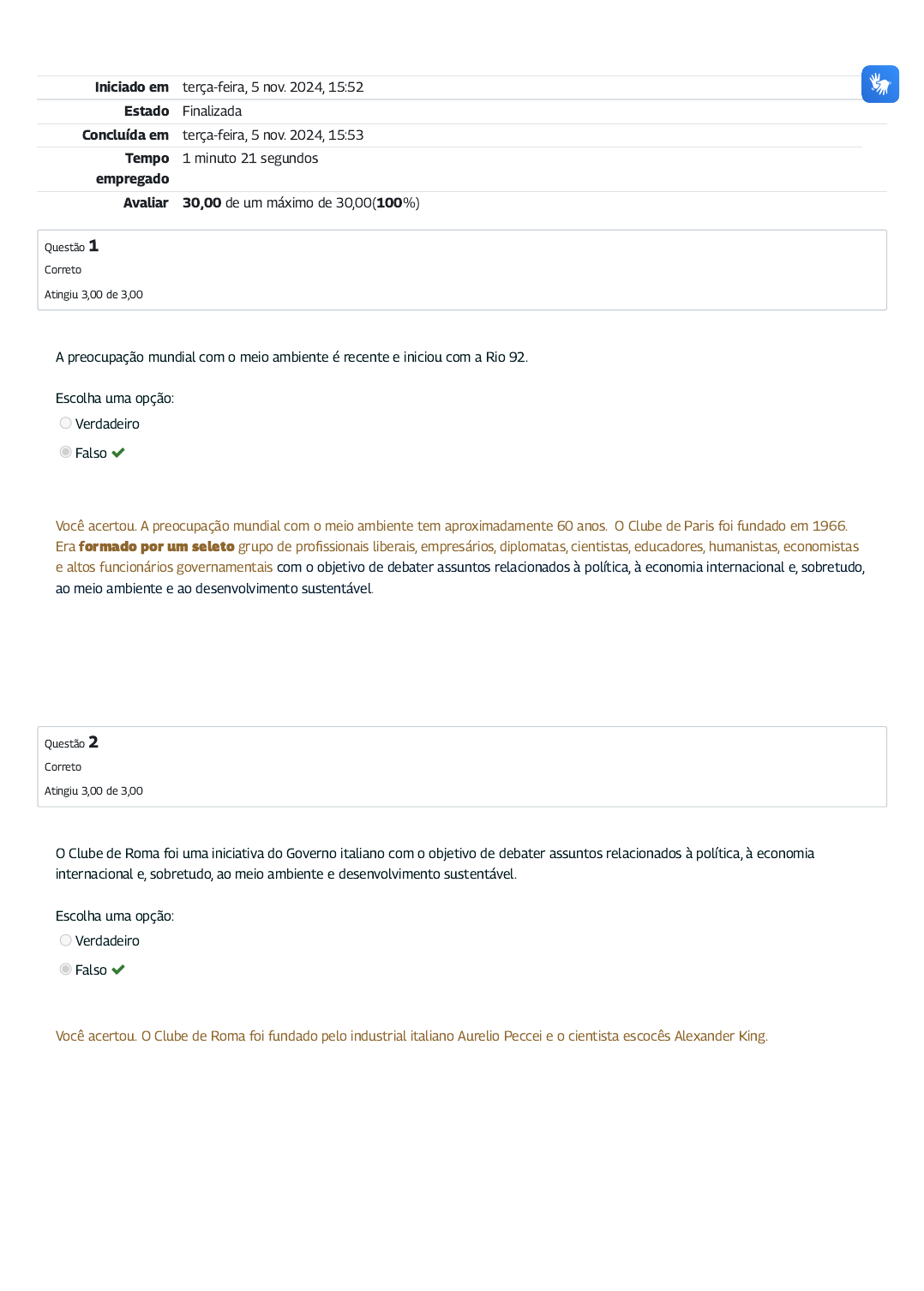 Iniciado em terça-feira, 5 nov. 2024, 15:52 Estado Finalizada Concluída em terça-feira, 5 nov. 2024, 15:53 Tempo empregado 1 minuto 21 segundos Avaliar 30,00 de um máximo de 30,00(100%) Questão 1 Correto Atingiu 3,00 de 3,00 Questão 2 Correto Atingiu 3,00 de 3,00 A preocupação mundial com o meio ambiente é recente e iniciou com a Rio 92. Escolha uma opção: Verdadeiro Falso Você acertou. A preocupação mundial com o meio ambiente tem aproximadamente 60 anos. O Clube de Paris foi fundado em 1966. Era formado por um seleto grupo de pro�ssionais liberais, empresários, diplomatas, cientistas, educadores, humanistas, economistas e altos funcionários governamentais com o objetivo de debater assuntos relacionados à política, à economia internacional e, sobretudo, ao meio ambiente e ao desenvolvimento sustentável. O Clube de Roma foi uma iniciativa do Governo italiano com o objetivo de debater assuntos relacionados à política, à economia internacional e, sobretudo, ao meio ambiente e desenvolvimento sustentável. Escolha uma opção: Verdadeiro Falso Você acertou. O Clube de Roma foi fundado pelo industrial italiano Aurelio Peccei e o cientista escocês Alexander King. Questão 3 Correto Atingiu 3,00 de 3,00 Questão 4 Correto Atingiu 3,00 de 3,00 O relatório “Os Limites do Crescimento”, conhecido também como “Relatório do Clube de Roma”, elaborado por uma equipe do Instituto de Tecnologia de Massachusetts, contratada pelo Clube, tornou-se um dos documentos sobre meio ambiente mais conhecidos no mundo. O relatório abordou problemas cruciais para o futuro desenvolvimento da humanidade, tais como energia, poluição, saneamento, saúde, ambiente, tecnologia e crescimento populacional. Escolha uma opção: Verdadeiro Falso Você acertou. O relatório “Os Limites do Crescimento”, conhecido também como “Relatório do Clube de Roma”, elaborado por uma equipe do Instituto de Tecnologia de Massachusetts contratada pelo Clube, foi publicado em 1972. A Conferência de Estocolmo ocorreu no período de 5 a 16 de junho de 1972. Participaram dessa reunião de 113 países e mais de 250 organizações não governamentais. O evento foi extremamente importante, pois representou o primeiro grande encontro internacional, entre representantes de diversas nações, para a discussão dos problemas ambientais e nela se consolidou e discutiu a relação entre desenvolvimento e meio ambiente. Escolha uma opção: Verdadeiro Falso Você acertou. A Conferência foi presidida pelo canadense Maurice Strong, tendo cobertura de jornalistas do mundo inteiro. O evento foi uma atitude pioneira com o intuito de conscientizar a sociedade sobre a premência de se melhorar a relação com o meio ambiente no que diz respeito ao uso dos recursos naturais. Questão 5 Correto Atingiu 3,00 de 3,00 Questão 6 Correto Atingiu 3,00 de 3,00 O documento Our Common Future (Nosso Futuro Comum) ou, como é bastante conhecido, Relatório Brundtland, apresentou um novo olhar sobre o desenvolvimento, de�nindo-o como o processo que “satisfaz as necessidades presentes, sem comprometer a capacidade das gerações futuras de suprir suas próprias necessidades”. É a partir daí que o conceito de desenvolvimento sustentável passa a �car conhecido. Escolha uma opção: Verdadeiro Falso Você acertou. O documento enfatizou problemas ambientais, como o aquecimento global e a destruição da camada de ozônio (conceitos novos para a época), e expressou preocupação em relação ao fato de a velocidade das mudanças estar excedendo a capacidade das disciplinas cientí�cas e de nossas habilidades de avaliar e propor soluções. A grande diferença entre as conferências de 1972 e de 1992 (Rio 92) foi a presença maciça, apenas na primeira, de Chefes de Estado, fator indicativo da pouca importância atribuída à questão ambiental. Escolha uma opção: Verdadeiro Falso Você acertou. Realmente as duas conferências, tanto de 1972 quanto a de 1992 (Rio 92), foram um sucesso. A presença maciça de Chefes de Estado é uma prova da grande importância atribuída à questão ambiental. Questão 7 Correto Atingiu 3,00 de 3,00 Questão 8 Correto Atingiu 3,00 de 3,00 A Agenda 21 Global foi construída de forma consensual, com a contribuição de governos e instituições da sociedade civil de 179 países, em um processo que durou dois anos. É um documento amplo que aborda diretrizes, bem como roteiros detalhados para orientar governos, instituições das Nações Unidas e setores independentes em como efetivar a proposta de proporcionar o desenvolvimento com maior qualidade de vida através da preservação dos ecossistemas, mudando o rumo das atividades humanas no planeta. Escolha uma opção: Verdadeiro Falso Você acertou. A Agenda 21 Global é um documento amplo que aborda diretrizes, bem como roteiros detalhados para orientar governos, instituições das Nações Unidas e setores independentes em como efetivar a proposta de proporcionar o desenvolvimento com maior qualidade de vida por meio da preservação dos ecossistemas, mudando o rumo das atividades humanas no planeta Em 1997, na cidade de Kyoto, no Japão, foi assinado um novo componente da Convenção Marco sobre Mudanças Climáticas: o Protocolo de Kyoto, que entrou em vigor imediatamente, tendo em vista que já estavam atendidas às condições que exigiam a rati�cação por, no mínimo, 55% do total de países-membros da Convenção e que fossem responsáveis por, pelo menos, 55% do total das emissões de 1990. Escolha uma opção: Verdadeiro Falso Você acertou. o Protocolo de Kyoto só entrou em vigor no dia 16 de fevereiro de 2005. Questão 9 Correto Atingiu 3,00 de 3,00 Questão 10 Correto Atingiu 3,00 de 3,00 Novamente na cidade do Rio de Janeiro, dessa vez no ano de 2012, foi realizada a Rio+20 – ou Conferência da ONU sobre o Desenvolvimento Sustentável. O evento reuniu um total de 193 representantes de países. O resultado foi a 