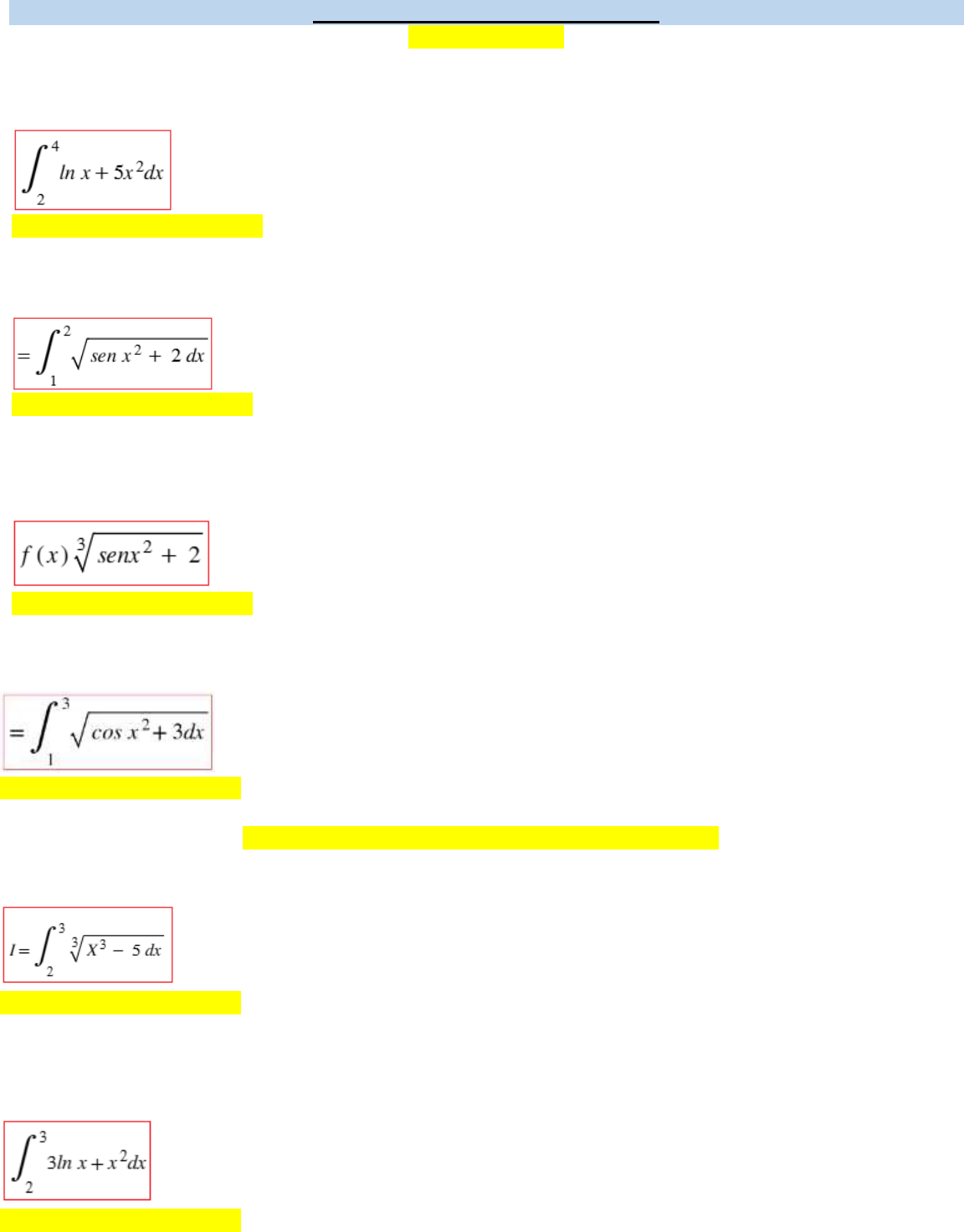Atividade de Sistematização – Unidade IV Cálculo Numérico Questão – 01: Calcule a integral da função f (x) =lnx + 5x² no intervalo I [ 2, 4] utilize o método de 1/3 Simpson com n = 2 e quatro casas decimais. Resposta correta: I = 95,4921 Questão – 02: Utilizando o método dos Trapézios calcule a integral abaixo, considerando n = 4 e quatro casas decimais. Resposta correta: I = 1,6004 Questão – 03: Observe a função abaixo. Calcule sua integral utilizando o método dos trapézios com n = 4, intervalo [ 0, 2] e quatro casas decimais. Resposta correta: I = 2,5930 Questão – 04: Utilizando o método dos Trapézios calcule a integral da função abaixo, considerando n = 4, no intervalo [ 1, 3 ]. Resposta correta: I = 3,3676 Avaliação de Sistematização – (Segunda Oportunidade) Questão – 01: Calcule a integral abaixo, utilize o método de 1/3 Simpson, considere n = 2 e quatro casas decimais. Resposta correta: I = 2,1750 Questão – 02: Considere a função f (x) = 3 lnx + x² e o intervalo [2, 3]. Calcule a integral da função nesse intervalo utilize o método de 1/3 Simpson com n = 2 e quatro casas decimais. Resposta correta: I = 9,0619 Questão – 03: Calcule a integral abaixo, utilize o método de 1/3 Simpson com n = 2 e considere quatro casas decimais. Resposta correta: I = 0,5823