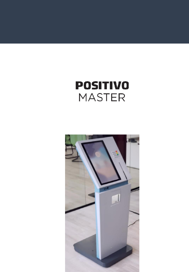 AT4400 TERMINAL DE ATENDIMENTO TDS MANUAL DO USUÁRIO 2 VISÃO GERAL DO PRODUTO O terminal de autoatendimento Positivo Master AT4400 foi desenvolvido para a comodidade e rapidez em integrações com sistema de senha, impressão de comprovante, protocolos e outros processos para autoatendimento. Sua estrutura é de fácil integração e possui ótima usabilidade, sendo uma solução robusta e com durabilidade indicada para aplicações de alto fluxo, como por exemplo, bancos, entre outros. Em módulo único, modelo totem vertical, confeccionado em chapa metálica, não possui arestas vivas e/ou cortantes, com portas de acesso com fechadura mecânica do tipo multiponto, com resistência do seu material de composição e acabamento contra desgastes físicos, corrosão entre outros, em estrutura estável e não suscetível ao tombamento contendo 02 rodízios giratórios frontais e 02 rodízios fixos com trava na porção posterior. Seu cabeamento passa pela parte interna do pedestal, sendo visível apenas a partir de sua saída na base do terminal. Demais periféricos necessários para o funcionamento da solução são fixados no interior da porção superior da estrutura e/ou pedestal. 3 CARACTERISTICAS TECNICAS TELA TOUCH 19.5” Touchscreen • Touchscreen: Tamanho 19,5” • Tecnologia: Capacitiva Projetada • Projeçao de tela: 16:9 • Quantidade de toques: 10 toques • Método de toque: Dedo, caneta de toque • Durabilidade: Mais de 50 milhões de toques únicos • Precisão do toque: ± 1.5mm • Interface de comunicação: Plug e Play (não necessita drivers) • Voltagem: DC + 5V ± 5% • Corrente de trabalho:Conectores do painel frontal • 2x USB 3.2 Gen 1 • 1x Line in • 1x Fone de Ouvido Dimensões • 17.0cm(L) x 17.0cm(C), BIOS/UEFI • BIOS desenvolvida pela Positivo | UEFI versão 2.7 • Memória flash ROM de 128Mb (16MB) de acordo com SMBIOS 3.2 • Idiomas: Português ou Inglês • Conformidade com as diretrizes do NIST SP800-147 para proteção contra ataques maliciosos • Possui a função "Plug & Play” • Permite customização do logo de inicialização (BMP ou JPG) • Capacidade de habilitar/desabilitar as portas USBs individualmente, HDD/SSD, serial, slots de expansão e áudio • Capacidade de boot através de: Adaptador de Rede (PXE), Unidades de Armazenamento, Unidade Ótica e interfaces USB contendo imagens geradas a partir de arquivos iso ou img • Possui boot seguro para proteção contra ataques de códigos mal-intencionados, como malware e ransomware (possui opção de habilitar/desabilitar) • Suporte a ACPI 6.2 com funções de economia de energia • Identificação do fabricante de forma não editável, informações de placa mãe, processador, memória, modelo do equipamento, data/hora • Registro de número de série (editável/não-editável opcional) e patrimônio editável (até 20 caracteres) • Função Desktop Management Interface (DMI 3.2) e Common Information Model (CIM) • Suporta atualização e inventário de hardware remoto por meio de software de gerenciamento ou local • Suporte as tecnologias PXE 2.1, S.M.A.R.T., AHCI e NVMe • Compatível com a plataforma SCCM da Microsoft 9 Sistema Operacional Windows® 10 Pro (64 bits) | Windows® 10 Pro (64 bits) National Academic | Windows® 10 Home (64 bits) Windows® 11 Pro (64 bits) | Windows® 11 Home (64 bits) Windows® 11 Pro downgrade para Windows 10 Pro (64 bits) Distribuições Linux Gabinete • Gabinete toolless não necessita de ferramentas para abertura e remoção dos componentes internos (disco rígido, SSD, SSD M.2, Wi-Fi, ventilador, memória e bateria CMOS) sem utilizar parafusos • LEDs indicadores frontais: Atividade disco rígido + Equipamento Ligado/Standby (possui função de diagnóstico de hardware) • Gabinete com pintura tipo epóxi fabricado em chapa metálica (frontal plástico), com pés antiderrapantes e acabamento interno/externo sem cantos vivos cortantes • Possui identificação gráfica para as interfaces do dispositivo (USB, vídeo, rede, áudio, etc) • Sistema de ventilação através do fluxo de ar exclusivo frontal→traseira • Sistema de ventilação adequado/dimensionado aos componentes internos, sem acúmulo excessivo de poeira, permitindo o uso ininterrupto do equipamento em ambiente não refrigerado 10 DESEMBALANDO O PRODUTO POSITIVO MASTER AT4400 Ao receber os totens Positivo Master AT4400 no local de instalação, verifique se todos os itens completos e sem danos devido ao transporte. Antes de iniciar o processo de desembalarem o equipamento, é necessário verificar se o ponto onde o terminal será instalado possui ponto lógico e elétrico (com aterramento e rede estabilizada), ambos funcionais. Coloque a caixa em uma superfície plana e abra a embalagem conforme as recomendações a seguir . 1. Para a abertura da caixa, recomenda-se o uso cuidadosamente de estilete ou alicate 2. Corte cuidadosamente as fitas arqueadoras envoltas na caixa com estilete ou alicate Cuidado ao retirar o terminal da caixa de papelão, ele estará protegido por uma camada de plástico bolha. 11 Retire a camada protetora de plástico bolha e suas fitas de fixação que envolvem o produto. Descarte a caixa der papelão e plástico bolha em local apropriado. Para retirar o palete do totem, utilize a chave combinada 13mm. Solte os parafusos localizados na parte traseira do terminal. Após a retirada dos parafusos, retire o totem cuidadosamente do palete. Obs: Evite pegar ou apoiar o totem de maneira brusca próximo a região do monitor/touchscreen. 12 LOCAL DE INSTALAÇÃO Os totens Positivo Master AT6400 devem possuir um espaço físico e fixo, em condiçoes do ambiente de instalaçao sendo em local seco e interno, nao exposto a vibração e que não recomendado em espaço fechado sem ventilação. Também recomenda-se nao expor o equipamento a incidência direta de raios solares, considerando que pode causar danos ao equipamento. O piso deve ser