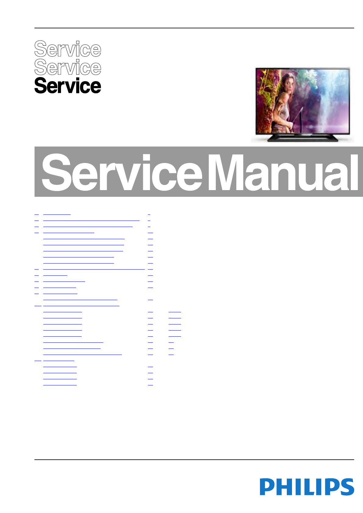 Published by YPC/SC 1528 Quality Printed in the Ne herlands Subject to modification EN 3122 785 19771 2015-July-10 © TP Vision Netherlands B.V. All rights reserved. Specifications are subject to change without notice. Trademarks are the property of Koninklijke Philips Electronics N.V. or their respective owners. TP Vision Netherlands B.V. reserves the right to change products at any time without being obliged to adjust earlier supplies accordingly. PHILIPS and the PHILIPS’ Shield Emblem are used under license from Koninklijke Philips Electronics N.V. Colour Television Chassis TPM15.6L LA Contents Page Contents Page 1 Revision List 2 2 Technical Specs Diversity and Connections 2 3 Precautions Notes and Abbreviation List 7 4 Mechanical Instructions 11 Cable dressing (24" PHG4100 series) 11 Cable dressing (32" PFG5000 series) 12 Cable dressing (32"PHG5000 series) 12 Cable dressing (40" 5000 series) 13 Cable dressing (48" 5000 series) 13 5 Service Modes Error Codes and Fault Finding 20 6 Alignments 28 7 Circuit Descriptions 30 8 IC Data Sheets 35 9 Block Diagrams Block diagram 4100 & 5000 series 41 10 Circuit Diagrams and PWB Layouts Drawing PWB A 715G6550 PSU 42 44-45 A 715G6863 PSU 46 47-48 A 715G6934 PSU 49 51-52 A 715G6338 PSU 53 58-59 B 715G6836 SSB 60 76-77 J 715G61767 IR/LED Panel 78 79 J 715G7325 IR/LED Panel 80 81 E 715G6316 Keyboard control panel 82 83 11 Styling Sheets 5000 series 32" 84 4100 series 24" 85 5000 series 40" 86 5000 series 48" 87 Revision List 2 TPM15.6L LA1. 2015-July-10 back to div.table 1. Revision List Manual xxxx xxx xxxx.0 • First release. Manual xxxx xxx xxxx.1 • Chapter 2: Updated table 2.1 Technical Specifications and connection 2.4 Connections (for 4100 series). • Chapter 4: Added figure 4-1 Cable dressing (24" PHG4100 series) and section 4.4 Assembly/Panel Removal (for 4100 series). • Chapter 6: Updated tables 6-2 White tone default settings and 6-3 Display code overview. • Chapter 7: Updated table 7-1 Connector overview. • Chapter 10: Added circuit diagram 10.7 J 715G7325 IR/LED Panel. • Chapter 11: Added styling sheet 11.2 4100 series 24". 2. Technical Specs, Diversity, and Connections Index of this chapter: 2.1 Technical Specifications 2.2 Directions for Use 2.3 Connections (for 5000 series) 2.4 Connections (for 4100 series) 2.5 Chassis Overview Notes: • Figures can deviate due to the different set executions. • Specifications are indicative (subject to change). 2.1 Technical Specifications For on-line product support please use the links in back to div.table 2-1. Here is product information available, as well as getting started, user manuals, frequently asked questions and software & drivers. Table 2-1 Described Model Numbers and Diversity 2.2 Directions for Use Directions for use can be downloaded from the following websites: http://www.philips.com/support http://www.p4c.philips.com CTN 2 4 9 10 11 C o n n ec ti o n O ve rv ie w Mechanics B lo ck D ia g ra m Schematics S ty lin g W ir e D re ss in g R ea r C o ve r R em o va l S ta n d R em o va l S S B R em o va l P o w er S u p p ly S S B J (I R /L E D ) E ( K ey b o ar d /L ea d in g E d g e) 24PHG4100/77 2-5 4-1 4-10 4-10 4-12 9.1 10.2 10.5 10.7 10.8 11 2 32PFG5000/77 2-1 4-2 4-7 4-6 4-9 9.1 10.1 10.5 10.6 10.8 11.1 32PHG5000/77 2-1 4-3 4-7 4-6 4-9 9.1 10.2 10.5 10.6 10.8 11.1 40PFG5000/77 2-1 4-4 4-7 4-6 4-9 9.1 10.3 10.5 10.6 10.8 11 3 48PFG5000/77 2-1 4-5 4-7 4-6 4-9 9.1 10.4 10.5 10.6 10.8 11.4 http://www.p4c.philips.com/cgi-bin/dcbint/cpindex.pl?ctn=24PHG4100/77&dct=PSS&scy=GB http://www.p4c.philips.com/cgi-bin/dcbint/cpindex.pl?ctn=32PFG5000/77&dct=PSS&scy=GB http://www.p4c.philips.com/cgi-bin/dcbint/cpindex.pl?ctn=32PHG5000/77&dct=PSS&scy=GB http://www.p4c.philips.com/cgi-bin/dcbint/cpindex.pl?ctn=40PFG5000/77&dct=PSS&scy=GB http://www.p4c.philips.com/cgi-bin/dcbint/cpindex.pl?ctn=48PFG5000/77&dct=PSS&scy=GB http://www.philips.com/support http://www.philips.com/support http://www.philips.com/support http://www.philips.com/support Technical Specs, Diversity, and Connections 3TPM15.6L LA 2. 2015-July-10back to div.table 2.3 Connections (for 5000 series) Figure 2-1 Connection overview Note: The following connector colour abbreviations are used (acc. to DIN/IEC 757): Bk= Black, Bu= Blue, Gn= Green, Gy= Grey, Rd= Red, Wh= White, Ye= Yellow. 2.3.1 Side Connections 1 - USB2 2.0 Figure 2-2 USB (type A) 1 - +5V � 2 - Data (-) �� 3 - Data (+) �� 4 - Ground Gnd � 2- Head phone (Output) Bk - Head phone 80 - 600 W / 10 mW �� 3 - EXT: Video YPbPr - In, Audio - In Gn - Video - CBVS2 1 VPP / 75 W �� Wh - Audio - L 0.5 VRMS / 10 kW �� Rd - Audio - R 0.5 VRMS / 10 kW �� 2.3.2 Rear Connections 4- TV ANTENNA - In Signal input from an antenna, cable or satellite. 5 - Service / UART 1 - Ground Gnd � 2 - UART_TX Transmit � 3 - UART_RX Receive � 6- HDMI 2: Digital Video - In, Digital Audio with ARC - In/Out Figure 2-3 HDMI (type A) connector 1 - D2+ Data channel � 2 - Shield Gnd � 3 - D2- Data channel � 4 - D1+ Data channel � 5 - Shield Gnd � 6 - D1- Data channel � 7 - D0+ Data channel � 8 - Shield Gnd � 9 - D0- Data channel � 10 - CLK+ Data channel � 11 - Shield Gnd � 12 - CLK- Data channel � 13 - Easylink/CEC Control channel �� 14 - ARC Audio Return Channel � 15 - DDC_SCL DDC clock � 16 - DDC_SDA DDC data �� 17 - Ground Gnd � 18 - +5V � 19 - HPD Hot Plug Detect � 20 - Ground Gnd � TV ANTENNA L R USB CVBS HDMI 1 HDMI 2 ARC SERV.U 19770_001 eps 4 3 2 1 5 8 7 Side ConnectorsRear Connectors 6 SPDIF OUT 1 2 3 4 10000_022_090121 eps 090121 10000_017_090121.eps 090428 19 1 18 2 Technical Specs, Diversity, and Connections 4 TPM15.6L LA2. 2015-July-10 back to div.table 7- HDMI 1: Digital Video - In, Digital Audio with ARC - In/Out Figure 2-4 HDMI (type A) connector 1 - D2+ Data channel � 2 - Shield Gnd � 3 - D2- Data channel � 4 - D1+ Data channel � 5 - Shield Gnd � 6 - D1- Data channel � 7 - D0+ Data channel 