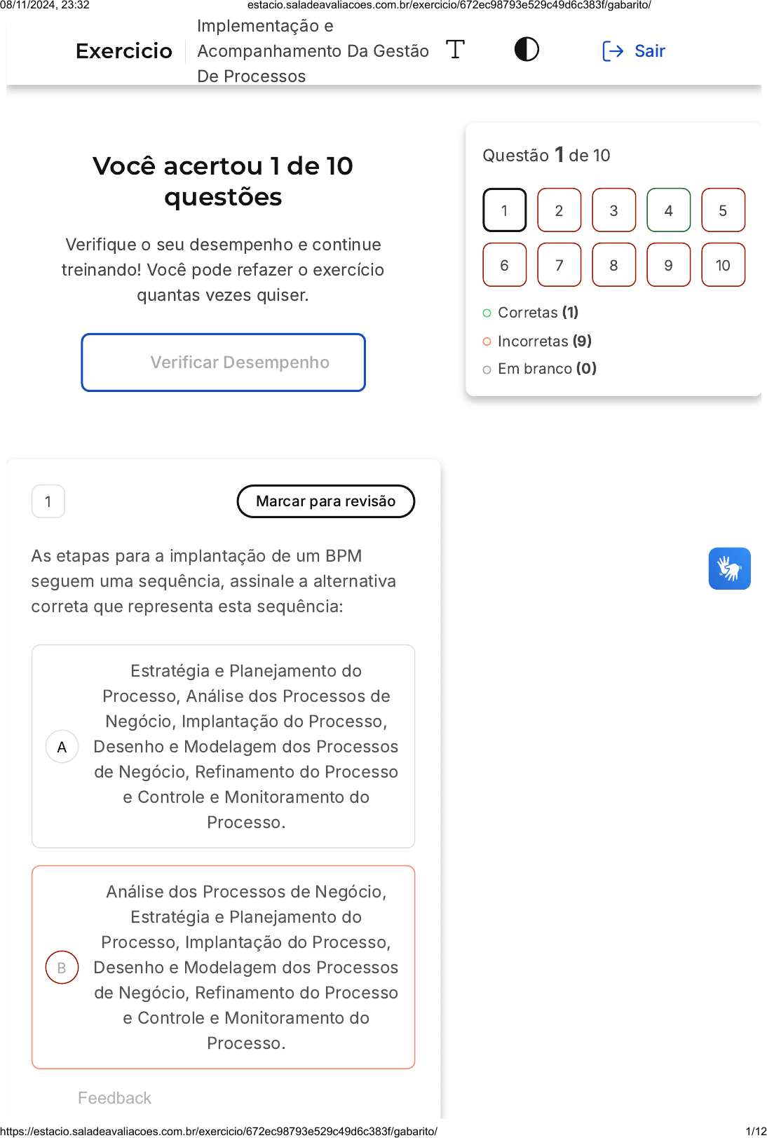 Você acertou 1 de 10 questões Verifique o seu desempenho e continue treinando! Você pode refazer o exercício quantas vezes quiser. Verificar Desempenho A B 1 Marcar para revisão As etapas para a implantação de um BPM seguem uma sequência, assinale a alternativa correta que representa esta sequência: Estratégia e Planejamento do Processo, Análise dos Processos de Negócio, Implantação do Processo, Desenho e Modelagem dos Processos de Negócio, Refinamento do Processo e Controle e Monitoramento do Processo. Análise dos Processos de Negócio, Estratégia e Planejamento do Processo, Implantação do Processo, Desenho e Modelagem dos Processos de Negócio, Refinamento do Processo e Controle e Monitoramento do Processo. Questão 1 de 10 Corretas �1� Incorretas �9� Em branco �0� 1 2 3 4 5 6 7 8 9 10 Exercicio Implementação e Acompanhamento Da Gestão De Processos Sair Feedback 08/11/2024, 23:32 estacio.saladeavaliacoes.com.br/exercicio/672ec98793e529c49d6c383f/gabarito/ https://estacio.saladeavaliacoes.com.br/exercicio/672ec98793e529c49d6c383f/gabarito/ 1/12 C D E Estratégia e Planejamento do Processo, Análise dos Processos de Negócio, Desenho e Modelagem dos Processos de Negócio, Implantação do Processo, Controle e Monitoramento do Processo e Refinamento do Processo. Análise dos Processos de Negócio, Estratégia e Planejamento do Processo, Implantação do Processo, Desenho e Modelagem dos Processos de Negócio, Controle e Monitoramento do Processo e Refinamento do Processo. Estratégia e Planejamento do Processo, Desenho e Modelagem dos Processos de Negócio, Análise dos Processos de Negócio, Implantação do Processo, Refinamento do Processo e Controle e Monitoramento do Processo. Resposta incorreta Opa! A alternativa correta é a letra C. Confira o gabarito comentado! Gabarito Comentado A sequência correta para a implantação de um BPM é: iniciar com a Estratégia e Planejamento do Processo, seguido pela Análise dos Processos de Negócio. Após essa análise, é realizado o Desenho e Modelagem dos Processos de Negócio. Com o desenho e modelagem concluídos, parte-se para a Implantação do Processo. Após a implantação, é necessário realizar o Controle e Monitoramento do Processo 08/11/2024, 23:32 estacio.saladeavaliacoes.com.br/exercicio/672ec98793e529c49d6c383f/gabarito/ https://estacio.saladeavaliacoes.com.br/exercicio/672ec98793e529c49d6c383f/gabarito/ 2/12 A B C D E para garantir que tudo está funcionando conforme o planejado. Por fim, realiza-se o Refinamento do Processo, que é uma etapa de melhoria contínua, onde são feitos ajustes e otimizações com base nos resultados obtidos no monitoramento. 2 Marcar para revisão O sucesso de um projeto de mapeamento, análise e melhoria de processos depende da utilização de ferramentas, como a matriz de responsabilidade. De que forma ela pode ser aplicada na organização? Designação de responsáveis pelas atividades de em serviços Transformação de insumos em produtos Gerenciamento de variáveis de gestão Seleção de responsáveis pelo mapeamento de processos Atribuição de responsabilidades de cada parte interessada Resposta incorreta Opa! A alternativa correta é a letra E. Confira o gabarito comentado! 08/11/2024, 23:32 estacio.saladeavaliacoes.com.br/exercicio/672ec98793e529c49d6c383f/gabarito/ https://estacio.saladeavaliacoes.com.br/exercicio/672ec98793e529c49d6c383f/gabarito/ 3/12 A B C D E Gabarito Comentado A atribuição de responsabilidades de cada parte interessada facilita o processo de comunicação e o controle e monitoramento de atividades. Neste entendimento, a organização pode colher bons frutos com sua adoção. 3 Marcar para revisão A adoção de estratégias para gerenciamento de risco de processo, com o objetivo de minimizá- los, representa uma forma de otimizar o desempenho e potencializar a geração de valor pelos recursos empregados. Qual é o objetivo do processo de gerenciamento de risco nas empresas? Prever com exatidão todos os riscos que possam afetar a empresa Eliminar completamente todos os riscos existentes Reduzir o impacto dos riscos e tornar a empresa mais resiliente Aumentar a gravidade das consequências dos riscos Ignorar os riscos e focar apenas na produtividade. Resposta incorreta 08/11/2024, 23:32 estacio.saladeavaliacoes.com.br/exercicio/672ec98793e529c49d6c383f/gabarito/ https://estacio.saladeavaliacoes.com.br/exercicio/672ec98793e529c49d6c383f/gabarito/ 4/12 A B C D E Opa! A alternativa correta é a letra C. Confira o gabarito comentado! Gabarito Comentado O processo de gerenciamento de risco busca desenvolver medidas para que as empresas possam ser cada vez mais resilientes frente aos riscos de seus processos. 4 Marcar para revisão Uma organização do setor industrial desconfia que um de seus produtos pode estar apresentando variações de dimensão na hora da produção. Qual ferramenta de gestão você recomendaria para analisar esta variação e promover melhorias? Coaching Seis Sigma Mentoring Matriz GUT Matriz de Responsabilidades Resposta correta Parabéns, você selecionou a alternativa correta. Confira o 08/11/2024, 23:32 estacio.saladeavaliacoes.com.br/exercicio/672ec98793e529c49d6c383f/gabarito/ https://estacio.saladeavaliacoes.com.br/exercicio/672ec98793e529c49d6c383f/gabarito/ 5/12 A B C D E gabarito comentado! Gabarito Comentado Seis Sigma possibilita uma análise estatística das variações de dimensões em relação à média histórica para fins de mensuração de desempenho e consequente apresentação de propostas de melhorias. 5 Marcar para revisão O mapeamento de processos abarca diversas atividades que auxiliam na documentação dos processos. Aponte alternativa que indique uma de suas etapas. Preparação de controles Cadastro de informações Transformação de insumos Desenho do mapa de processos Configuração de controles Resposta incorreta Opa! A alternativa correta é a letra D. Confira o gabarito come