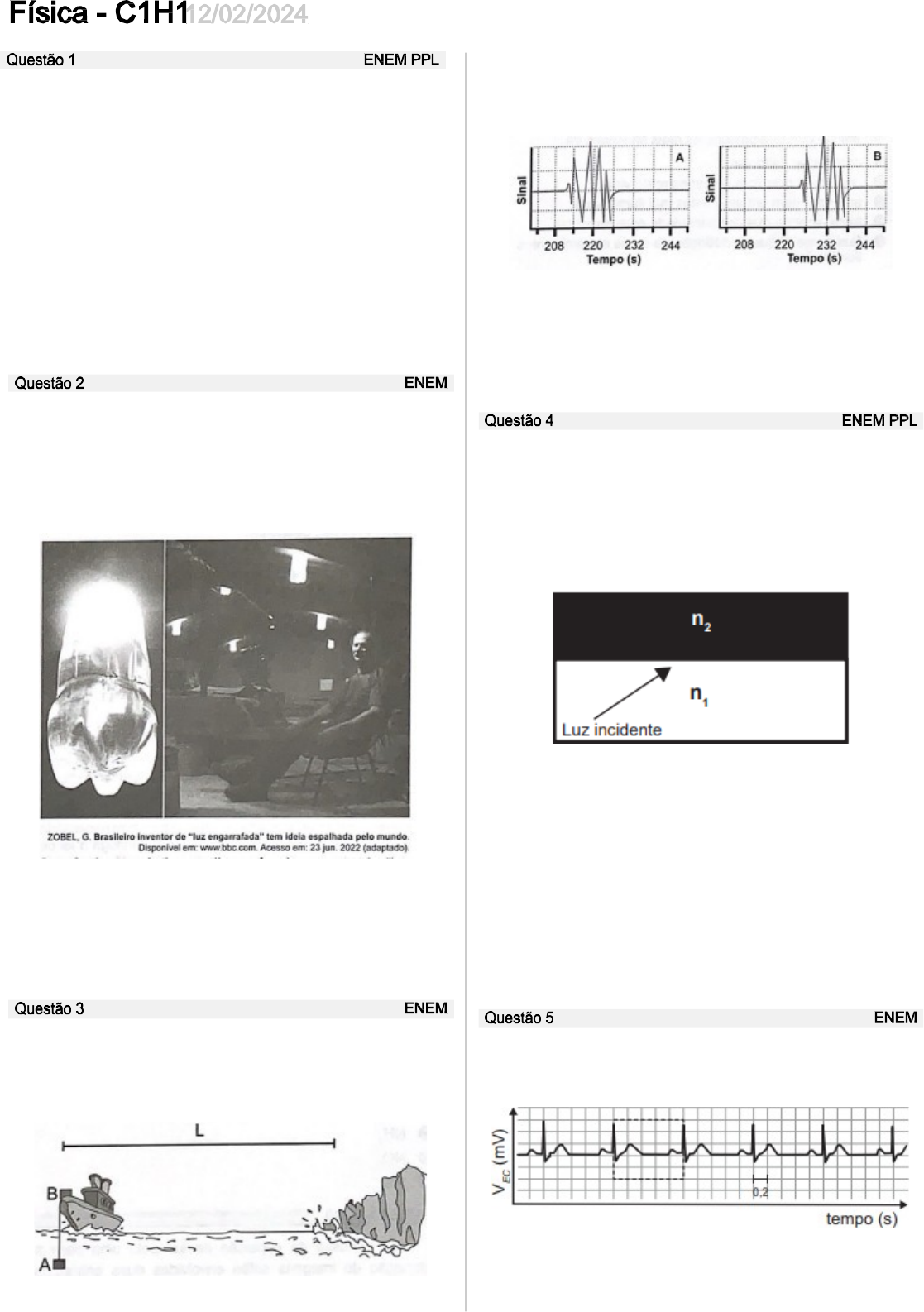 Escrito em 1897, pelo britânico H. G. Wells (1866- 1946), O homem invisível é um livro que narra a história de um cientista que teria desenvolvido uma forma de tornar todos os tecidos do seu corpo transparentes à luz, ao fazer o índice de refração absoluto do corpo humano corresponder ao do ar. Contudo, Wells não explorou no livro o fato de que esse efeito comprometeria a visão de seu protagonista. Nesse caso, qual seria a deficiência visual provocada? a) Miopia b) Cegueira c) Daltonismo d) Astigmatismo e) Hipermetropia Em 2002, um mecânico da cidade mineira de Uberaba (MG) teve uma ideia para economizar o consumo de energia elétrica e iluminar à própria casa num dia de sol. Para isso, ele utilizou garrafas plásticas PET com água e cloro, conforme ilustram as figuras. Cada garrafa foi fixada ao telhado de sua casa em um buraco com diâmetro igual ao da garrafa, muito maior que o comprimento de onda da luz. Nos últimos dois anos, sua ideia já alcançou diversas partes do mundo e deve atingir a marca de 1 milhão de casas utilizando a “luz engarrafada”. Que fenômeno óptico explica o funcionamento da “luz engarrafada”? a) Difração. b) Absorção. c) Polarização. d) Reflexão. e) Refração. Os gráficos indicam, em tempo real, o sinal sonoro detectado pelos dois dispositivos, os quais foram ligados simultaneamente em um instante anterior à queda do bloco de gelo. Ao comparar pontos correspondentes desse sinal em cada dispositivo, é possível obter informações sobre a onda sonora. A distância L, em metro, entre o barco e a geleira é mais próxima de a) 339 000. b) 78 900. c) 14 400. d) 5 240. e) 100. Na área de comunicações, a demanda por grande volume de dados exige uma transmissão em alta frequência. Uma inovação nesse sentido foi o desenvolvimento da fibra óptica, que faz uso da luz como portadora de sinais. A fibra óptica é um meio de propagação da luz formada por duas camadas de vidro, com índices de refração diferentes. Considere que a camada externa da fibra apresente índice de refração n2 , e a camada interna, índice de refração n1 , como ilustrado na figura. O objetivo dessa diferença é obter a condição de reflexão interna total do sinal óptico que se encontre na camada interna, de forma que ele se propague por toda a extensão da fibra. A tecnologia envolvida na confecção das fibras ópticas deve garantir que o ângulo de refração e a relação entre n1 e n2 sejam, respectivamente, a) 45° e n2 n1. c) nulo e n2 n1. e) 90° e n2 v2. d) f1 > f2 e v1 = v2. e) f1 > f2 e v1 > v2. As notas musicais, assim como a grande maioria dos sons encontrados na natureza, são complexas e formadas pela superposição de várias ondas senoidais. A figura apresenta três componentes harmônicas e a composição resultante, construídas na mesma escala, para um instrumento sonoro. Essa composição carrega uma “assinatura sônica” ou timbre do corpo que a produz. Essas componentes harmônicas apresentam iguais Os fones de ouvido tradicionais transmitem a música diretamente para os nossos ouvidos. Já os modelos dotados de tecnologia redutora de ruído – Cancelamento de Ruído (CR) – além de transmitirem música, também reduzem todo ruído inconsistente à nossa volta, como o barulho de turbinas de avião e aspiradores de pó. Os fones de ouvido CR não reduzem realmente barulhos irregulares como discursos e choros de bebês. Mesmo assim, a supressão do ronco das turbinas do avião contribui para reduzir a “fadiga de ruído”, um cansaço persistente provocado pela exposição a um barulho alto por horas a fio. Esses aparelhos também permitem que nós ouçamos músicas ou assistamos a vídeos no trem ou no avião a um volume muito menor (e mais seguro). Disponivel em http (tecnologia uol com.br Acesso em 21 abr 2015 (adaptado). A tecnologia redutora de ruído CR utilizada na produção de fones de ouvido baseia-se em qual fenômeno ondulatório? a) Absorção. b) Interferência. c) Polarização. d) Reflexão. e) Difração. Para se deslocar e obter alimentos, alguns mamíferos, como morcegos e golfinhos, contam com a sofisticada capacidade biológica de detectar a posição de objetos e animais pela emissão e recepção de ondas ultrassônicas. O fenômeno ondulatório que permite o uso dessa capacidade biológica é a a) reflexão. b) difração. c) refração. d) dispersão. e) polarização. Dois engenheiros estão verificando se uma cavidade perfurada no solo está de acordo com o planejamento de uma obra, cuja profundidade requerida é de 30 m. O teste é feito por um dispositivo denominado oscilador de áudio de frequência variável, que permite relacionar a profundidade com os valores da frequência de duas ressonâncias consecutivas, assim como em um tubo sonoro fechado. A menor frequência de ressonância que o aparelho mediu foi 135 Hz. Considere que a velocidade do som dentro da cavidade perfurada é de 360 m s-1. Se a profundidade estiver de acordo com o projeto, qual será o valor da próxima frequência de ressonância que será medida? a) 137 Hz. b) 138 Hz. c) 141 Hz d) 144 Hz e) 159 Hz. Quando se considera a extrema velocidade com que a luz se espalha por todos os lados e que, quando vêm de diferentes lugares, mesmo totalmente opostos, [os raios luminosos] se atravessam uns aos outros sem se atrapalharem, compreende-se que, quando vemos um objeto luminoso, isso não poderia ocorrer pelo transporte de uma matéria que venha do objeto até nós, como uma flecha ou bala atravessa o ar; pois certamente isso repugna bastante a essas duas propriedades da luz, principalmente a última. HUYGENS, C. in: MARTINS, R.A. Tratado sobre a luz, de Cristian Huygens. Caderno de História e Filosofia da Ciência, supl. 4, 1986. O texto contesta que concepção acerca do comportamento da luz? a) O entendimento de que a luz precisa de um meio de propagação, difundido pelos defensores da existência do éter. b) O mode