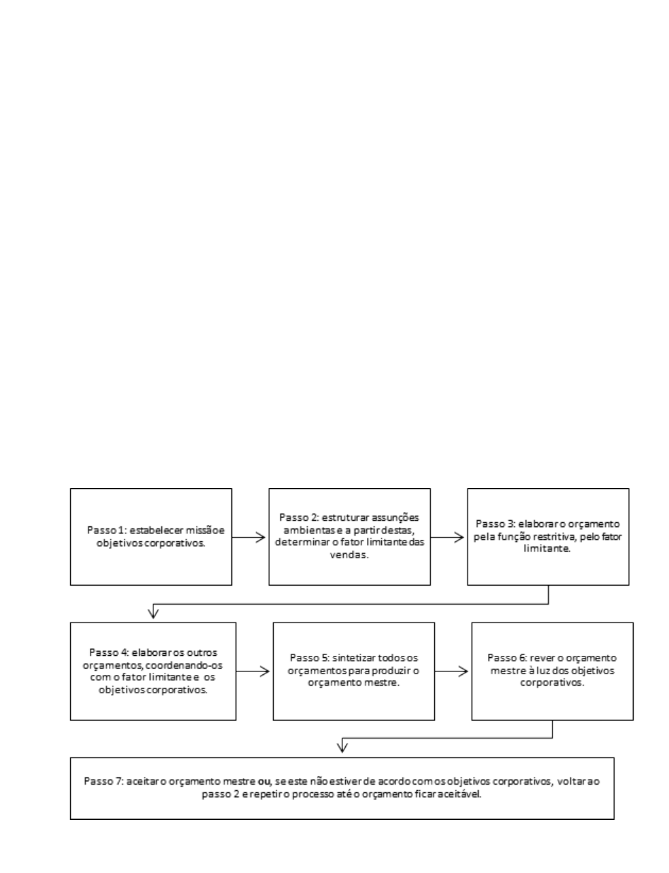 PLANO ORÇAMENTÁRIO MESTRE O planejamento orçamentário mestre é definido por um conjunto de planos e processos operacionais. Visa a representar em termos quantitativos e em valor monetário todos objetivos econômico-financeiros da organização expressos por meios da formalização das projeções de suas receitas e de seus gastos (custos e despesas) (Lunkes, 2009). O plano orçamentário mestre é o planejamento orçamentário geral da empresa, em que são contempladas todas as previsões, diretrizes e bases necessárias para a elaboração das peças orçamentárias. Em linhas gerais, é o orçamento operacional consolidado. A Figura 1 evidencia os passos necessários para elaboração de um plano orçamentário. Figura 1 – Passos necessários para a elaboração de um plano orçamentário Fonte: elaborado com base em Padoveze, 2012. Os passos apresentados na Figura 1 representam etapas necessárias para iniciar a elaboração do orçamento empresarial (os passos 1 e 2 foram apresentados nas aulas anteriores), em que, além da análise ambiental, insere no contexto restrições ou fatores limitantes do processo orçamentário. Mas, então, o que vem a ser esse fator limitante? O fator limitante é o entendimento da limitação do negócio da empresa e é importante para a projeção inicial do orçamento, ou seja, por onde iniciar a construção do plano orçamentário? Essa análise é muito importante; vejamos os motivos. Se o fator limitante do negócio de uma empresa for matéria-prima, o orçamento deve ser elaborado com base em estimativas do orçamento de compras, pois de nada adianta a empresa estimar uma venda de um milhão de unidades se somente terá à sua disposição matéria-prima para produzir 700 mil unidades. Nesse caso, toda a construção do orçamento tem como base o orçamento de compras, considerando o volume de matéria-prima disponível. Agora, se o fator limitante da empresa for o volume de vendas, toda a construção do orçamento será com base na estimativa das quantidades que a empresa deseja vender no próximo período. A maioria das empresas inicia seus orçamentos a partir do fator limitante de vendas. Determinado o fator limitante, a empresa pode dar início ao orçamento. Retomando conceitos iniciais, orçamento é a expressão quantitativa do planejamento estratégico da organização, composto por dados financeiros e não-financeiros. Contempla em seu escopo metas estratégicas da empresa e desdobramento em metas e ações a serem executadas no plano operacional. Entre os aspectos relevantes, a elaboração do planejamento orçamentário está relacionada ao sistema de informação da organização e aos sistemas de apoio para coleta de dados base, necessários para projeção de vendas, cálculo de custos, despesas com pessoal, despesas administrativas e comerciais, tributos, enfim, todos os recursos disponíveis da empresa. Figura 1 – Plano orçamentário Fonte: Stedry, 1999, p. 22. O planejamento orçamentário é implementado a partir dos planos e ações estratégicas da empresa/organização. Com base no fator de limitação, todas as peças orçamentárias são elaboradas, considerando os recursos disponibilizados por departamento ou unidades. A Figura 3 apresenta um exemplo de processo orçamentário. Figura 3 – Processo orçamentário Fonte: Dos Anjos, 2021. O orçamento é projetado considerando uma unidade de tempo, normalmente um ano. No entanto, deve-se considerar que o período e o tempo de duração variam de uma empresa para outra, pois em algumas atividades devem ser consideradas as sazonalidades (Schnorrenberger et al., 2014). Por exemplo, o orçamento de uma indústria têxtil deve considerar receitas e gastos de pelo menos duas estações, inverno e verão. Para facilitar o estudo e a compreensão de um processo orçamentário, consideramos o orçamento realizado com base nas premissas orçamentárias, que apresenta de forma resumida condições, regras e linhas mestras para condução e construção de todas as peças orçamentárias. Nesta aula, apresentaremos a simulação de um processo orçamentário. Não se preocupe com os cálculos matemáticos utilizados, pois estes são bastante simples e similares às atividades desenvolvidas no ambiente das empresas. Para entender o exemplo, procure acompanhar os exercícios de forma sequencial, lembrando que os dados projetados nas primeiras peças orçamentárias são importantes para elaboração das próximas peças. Ou seja, se tiver dúvidas em relação à origem de um dado, volte para a primeira peça, e verifique as premissas e orientações para identificar de onde foi extraída. 1.1 EXEMPLO – PLANEJAMENTO ORÇAMENTÁRIO DA EMPRESA CONSERVAS E SABORES A empresa Conservas e Sabores Ltda. é uma indústria de pequeno porte que fabrica e comercializa dois produtos: Hot Peper (conserva de pimenta) e Green Cucumber (conserva de pepinos), ambos considerados de altíssima qualidade em seu ramo de atuação. Em relação ao market share, os produtos têm se tornado conhecidos nas regiões de atuação da empresa. A Conserva e Sabores tem investido em marketing, buscando ampliar o mercado de atuação e consequentemente o volume de unidades a serem comercializadas. Vamos tomar como base para o orçamento de vendas a premissa do crescimento estimado do setor de 10% para o próximo ano. Isto posto, o processo orçamentário da Conservas e Sabores se inicia no mês de setembro com término previsto para novembro de X0; após sua aprovação começa a execução, em janeiro a X1. As peças serão apresentadas em períodos trimestrais para o ano de X1. Os valores em reais são apresentados arredondados (sem centavos) para maior clareza e facilidade dos cálculos. 1.2 PREMISSAS ORÇAMENTÁRIAS As premissas orçamentárias são dados e informações coletados do sistema de informação e acompanhamento do negócio realizado pela empresa. São elaborados pela equipe diretiva, e 