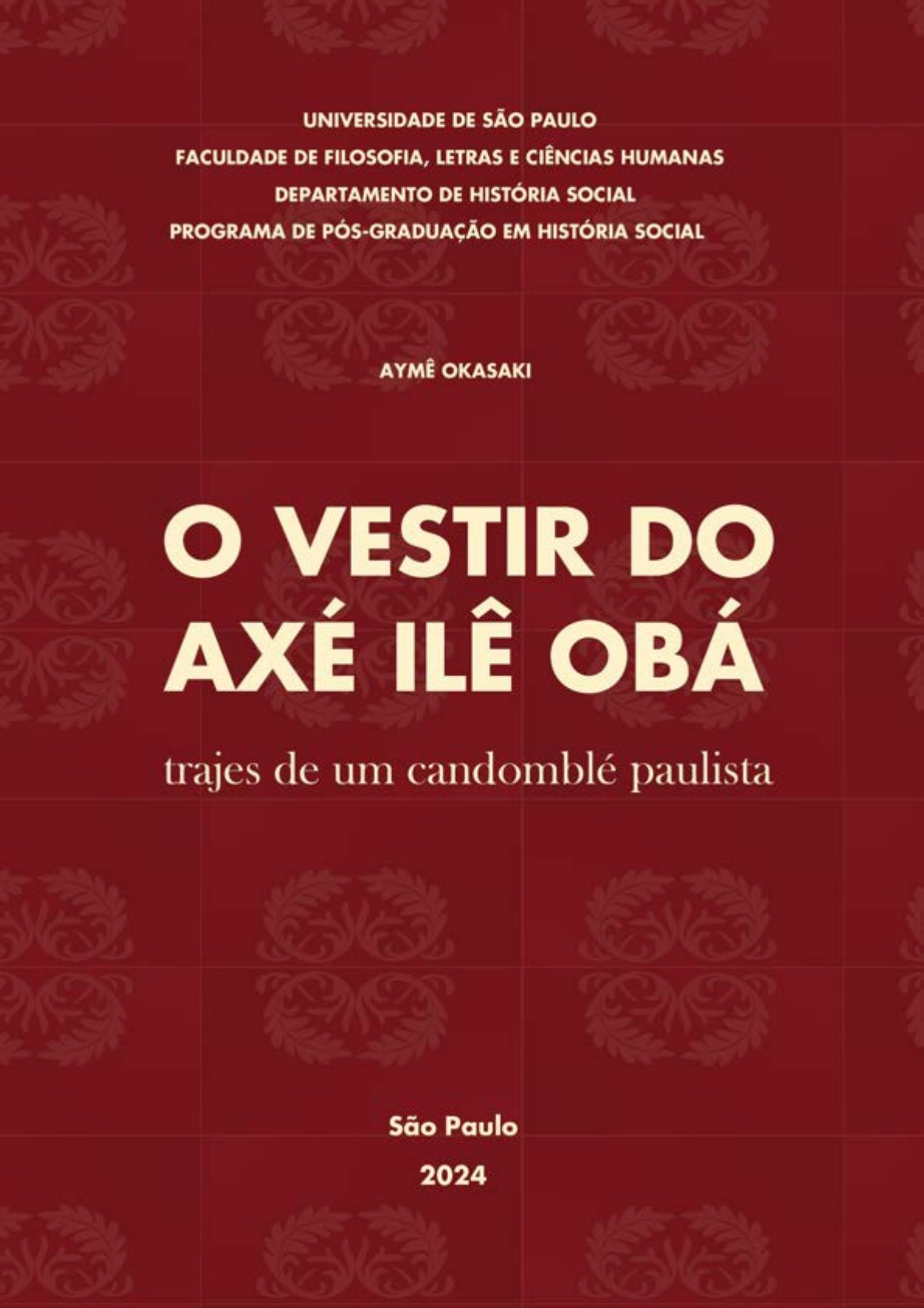 AYMÊ OKASAKI os trajes de um terreiro de candomblé paulista Tese de Doutorado apresentada ao Programa de Pós-Graduação em História Social do Departamento de História da Faculdade de Filosofia, Letras e Ciências Humanas, da Universidade de São Paulo, como requisito para obtenção do título de Doutora em História Social. Orientadora: Prof.ª Dra. Marina de Mello e Souza Versão Corrigida São Paulo 2024 Autorizo a reprodução e divulgação total ou parcial deste trabalho, por qualquer meio convencional ou eletrônico, para fins de estudo e pesquisa, desde que citada a fonte. Catalogação na Publicação Serviço de Biblioteca e Documentação Faculdade de Filosofia, Letras e Ciências Humanas da Universidade de São Paulo OO41v Okasaki, Aymê O vestir do Axé Ilê Obá: os trajes de um terreiro de candomblé paulista / Aymê Okasaki; orientadora Marina de Mello e Souza - São Paulo, 2024. 527 f. Tese (Doutorado)- Faculdade de Filosofia, Letras e Ciências Humanas da Universidade de São Paulo. Departamento de História. Área de concentração: História Social. 1. CAMDOMBLÉ. 2. MODA. 3. CULTURA AFRO-BRASILEIRA. 4. TECIDOS (INDÚSTRIA TÊXTIL). 5. VESTUÁRIO. I. Souza, Marina de Mello e, orient. II. Título. UNIVERSIDADE DE SÃO PAULO FACULDADE DE FILOSOFIA, LETRAS E CIÊNCIAS HUMANAS ENTREGA DO EXEMPLAR CORRIGIDO DA DISSERTAÇÃO/TESE Termo de Anuência da orientadora Nome da aluna: Aymê Okasaki Data da defesa: 13/05/2024 Nome do Profa. orientadora: Marina de Mello e Souza Nos termos da legislação vigente, declaro ESTAR CIENTE do conteúdo deste EXEMPLAR CORRIGIDO elaborado em atenção às sugestões dos membros da comissão Julgadora na sessão de defesa do trabalho, manifestando-me plenamente favorável ao seu encaminhamento ao Sistema Janus e publicação no Portal Digital de Teses da USP. São Paulo, 13/07/2024 _ __________________________________________________ (Assinatura da orientadora) Okasaki, Aymê. O vestir do Axé Ilê Obá: os trajes de um terreiro de candomblé paulista. Tese (Doutorado) apresentada à Faculdade de Filosofia, Letras e Ciências Humanas da Universidade de São Paulo para obtenção do título de Doutora em História Social. Aprovada em: treze dias do mês de maio de dois mil e vinte e quatro. Banca Examinadora Profa. Dra. Marina de Mello e Souza (presidente) Instituição FFLCH-USP Julgamento: não votante Profa. Dra. Solange Ferraz de Lima Instituição MP-USP Julgamento: aprovada Prof. Dr. Antonio Takao Kanamaru Instituição EACH-USP Julgamento: aprovada Profa. Dra. Maria Claudia Bonadio Instituição UFJF-externo Julgamento: aprovada Parecer da Banca Julgadora A pesquisa é original e a tese bem estruturada, traz temas candentes para a discussão em um campo multidisciplinar. A banca sugere a ampla divulgação da tese na sua integralidade. A tese tem potencial também para ser mobilizada em atividades de extensão tais como exposições, seminários, workshops. Dedico este trabalho ao meu pai, que hoje me orienta do Orum. À minha mãe, pela revisão e auxílio ao longo da escrita; ao meu irmão e toda minha família e amigos por todo o suporte ao longo de todos esses anos; ao meu corpo discente, especialmente mentorandes e orientandes, para quem eu espero que esta investigação seja colaborativa para um campo da moda mais decolonial, inclusivo e representativo; aos meus amigos do grupo de pesquisa Fayola Odara: José Roberto, Marcel Marques, Beatrice Rossoti, Eliany Funary, Maria Eduarda e Raphael Gonçalves, por toda a construção coletiva de saber. E minha dedicatória à Oxum, que embelezou, adoçou e fortaleceu esta pesquisa e a pesquisadora. Oore yèyé oò À Prof.ª Dr.ª Marina de Mello e Souza, pelo apoio e acolhida durante o processo de orientação, acreditando no potencial e importância da investigação desenvolvida. Ao Programa de História Social, pela acolhida na área e no curso, bem como as professoras de História da África do programa, professor Vagner Gonçalves da Antropologia, professor Fausto Viana da Escola de Comunicação, professora Isabel Italiano de Têxtil e Moda e professora Denise Dias Barros do Interunidades em Estética e História da Arte. Barbara Plankensteiner e Malika Kraamer, do MARKK museum, em Hamburgo, na Alemanha, pela conversa e visita na reserva técnica do museu. Professor Ulrich Mücke e ao programa de pesquisa em História da América Latina, da Universidade de Hamburgo, pelo intercâmbio realizado durante o mês de julho de 2022, que foi de extrema importância para o amadurecimento desta pesquisa e vislumbre de novas oportunidades de pesquisa. Agradecimento à Teleica Kirkland, diretora do CIAD – Costume Institute of Fashion, que me convidou a compartilhar esta pesquisa em 2022, na London College of Fashion; bem como ao professor Alejandro de la Fuente, do ALARI-Afro-Latin American Research Institute, que me recepcionou no Encontro Continental do ALARI, em Harvard, em dezembro de 2022. Ao professor Antonio Takao Kanamaru, que me orientou em minha iniciação científica (ponto de partida da pesquisa de doutorado), trabalho de conclusão de curso-TCC, mestrado e compôs minha banca examinadora de defesa de doutorado. Às professoras Solange Ferraz e Maria Claudia Bonadio, que tão ricamente me auxiliaram, compondo minha banca de defesa de doutorado. Ao Fayola Odara – Grupo de Pesquisas Estéticas Africanas e Afro-Diaspóricas (CNPq), pela construção coletiva de conhecimento, partilha em congressos, estudos e cursos. Agradecimento especial para Marcel Marques, meu ex-orientando de TCC de Bacharelado em Moda, na UNISO, que realizou as fotografias e ilustrações desta tese. Às comunidades tradicionais de terreiro, em especial aos ilês de São Paulo: Axé Ilé Obá e a ialorixá Paula de Iansã (e Telma Winter, assessora do Axé Ilê Obá), Centro Cultural Eyin Oxum, Ilé Afro-brasileiro Odé Lorecy; ao Ilé Oxumarê Aràká Axé Ògòdó e Ilé Axé Opô Afonjá, na Bahia p