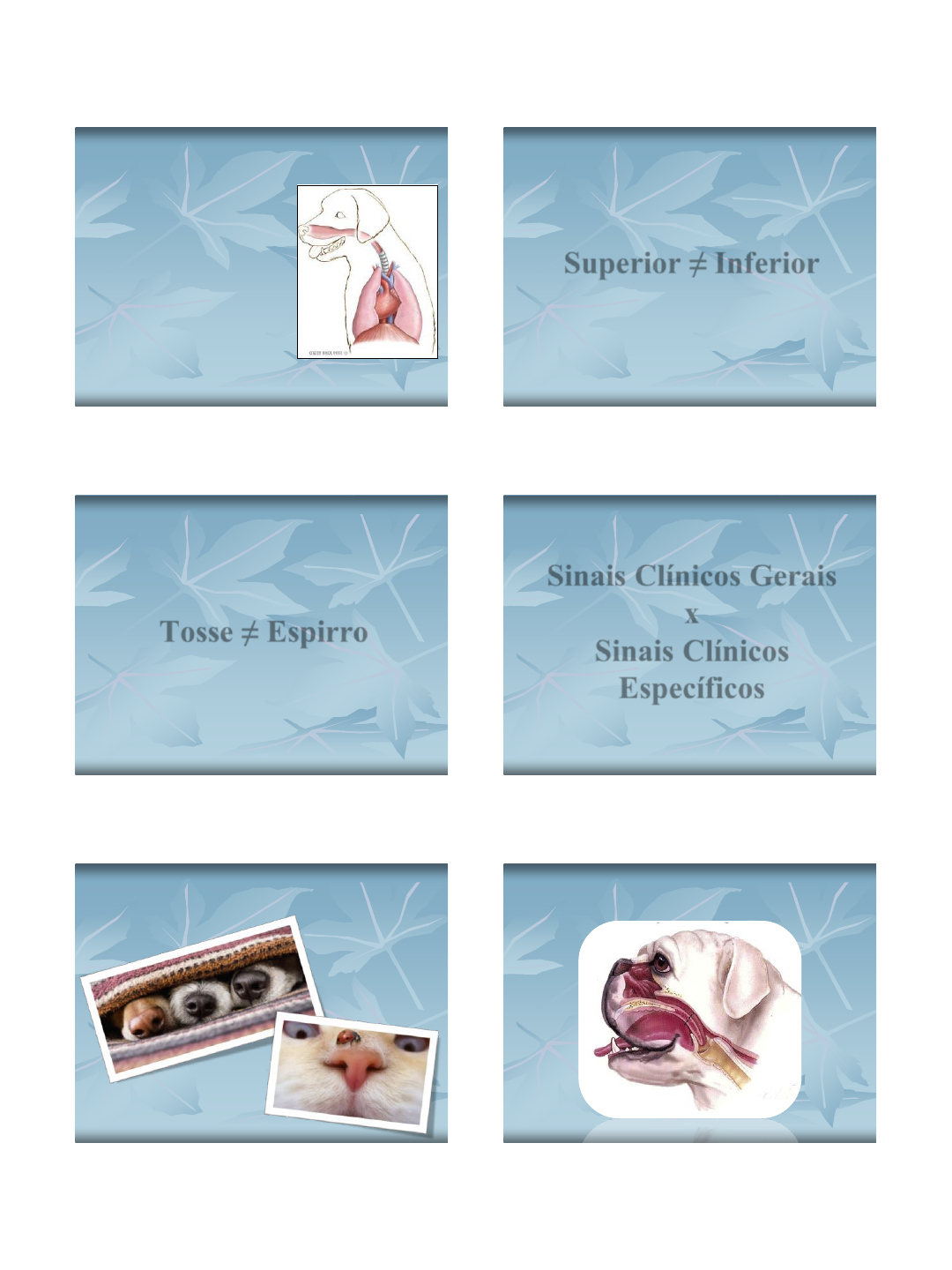10/04/2024 1 Afecções do Trato Respiratório Superior ≠ Inferior Tosse ≠ Espirro Sinais Clínicos Gerais x Sinais Clínicos Específicos Rinite / Sinusite Síndrome do Braquicefálico 10/04/2024 2 Colapso de Traquéia Prevalência e fatores de risco Poodle miniatura, Yorkshire terrier, Chihuahua, Pomerânia, Shi-tzu e Lhasa apso > 4 anos Piora dos sinais clínicos agitação, calor, exercício, obesidade, obstrução vias superiores, tosse* Colapso de traquéia Sinais Clínicos Tosse alta, seca, aguda ou crônica intermitente Mímica de vômito Intolerância a exercícios Taquipneia Dispneia inspiratória – colapso cervical Dispneia expiratória – colapso torácico Colapso de traquéia Diagnóstico Diagnóstico Sinais clínicos Rx cervical (inspiração) e torácico (expiração), broncoscopia Colapso de traquéia 10/04/2024 3 Tratamento S. Condroetina / Glucosamina / UC-II Perda de peso (obesos) Repouso Coleira Peitoral Teofilina de liberação lenta ou terbutalina Inflamação bronquial prednisona Colapso de traquéia Tratamento Casos graves sedação (acepromazina) Oxigenioterapia Cirurgia?!?!?!?!?! Colapso de traquéia Afecções das Vias Aéreas Inferiores 10/04/2024 4 Pneumonia Etiologia Infecciosa Vírus (PIF, calicivirose, cinomose, parainfluenza) Bactérias (Bordetella bronchiseptica, Streptococcus, Mycobacterium, E. coli, Pasteurella multocida, Staphylococcus, Pseudomonas, Ehrlichia) Micoplasmas e fungos (aspergilose, blastomicose, coccidioidomicose) Pneumonia Etiologia Não infecciosa Aspiração (alimentos, líquidos, corpos estranhos, subst. irritantes, alérgenos) Parasitas (Oslerus osleri, Aelurostrongylus abstrusus, Toxoplasma gondii) Toxinas endógenas Pneumonia Sinais Clínicos Tosse Dispnéia/taquipnéia Intolerância a exercícios Febre Letargia Anorexia Perda de peso Secreção nasal Sibilos e crepitação úmida Pneumonia Diagnóstico e Prognóstico Sinais clínicos Leucocitose neutrofílica Rx, broncoscopia Citologia e cultura bacteriana (lavado broncoalveolar, aspirado c/ agulha filha) Prognóstico - Favorável Reservado – imunossuprimidos, jovens, doença prolongada Pneumonia Tratamento ATB (mín. 3 sem) ampicilina, amoxicilina +/- clavulanato, cefalosporinas, aminoglicosídeos, quinolonas, sulfa- trimetoprim, tetraciclina Antifúngicos (cetoconazol, anfotericina B, itraconazol) Anti-histamínicos (alergia) Pneumonia 10/04/2024 5 Tratamento O2 e repouso angústia respiratória Hidratação / Nebulização Suporte nutricional Fisioterapia exercícios moderados tapotagem torácica Antitussígenos??? Pneumonia Broncopneumonia Edema Pulmonar Acúmulo de fluidos extravasculares no interstício e alvéolos EDEMA PULMONAR ETIOLOGIA PRESSÃO ONCÓTICA PLASMÁTICA DIMINUÍDA • Hipoalbuminemia perda gastrointestinal glomerulopatia hepatopatia inanição SOBRECARGA VASCULAR • Cardiogênica • Superidratação OBSTRUÇÃO LINFÁTICA • Neoplasia PERMEABILIDADE VASCULAR AUMENTADA • Toxinas inaladas; • Drogas; • Eletrocussão; • Trauma. Edema Pulmonar Sinais Clínicos Taquipnéia / dispnéia / ortopnéia Tosse ??? Intolerância aos exercícios Cianose Crepitação Líquido claro a róseo pela boca/narinas Edema pulmonar 10/04/2024 6 Diagnóstico e Prognóstico Sinais clínicos, Rx Prognóstico Cardiogênico - reservado Não cardiogênico - variável Edema pulmonar Tratamento Diuréticos!!!!!!!!!! + causa!!!!!!!!! Furosemida Broncodilatadores (cardiogênico???) aminofilina, teofilina, terbutalina O2, repouso, sedativos (morfina, acepromazina, diazepam) angústia respiratória Edema pulmonar 10/04/2024 7 Neoplasias pulmonares No pulmão o fluxo sanguíneo é baixo e a rede capilar é extensa, por isso é um local comum de metástase Tumores metastásicos Efusão Pleural 10/04/2024 8 Traumas penetrantes Lesões cavitárias pulmonares PNEUMOTÓRAX 10/04/2024 9 OBESIDADE Complacência Obesidade Consumo de oxigênio Troca Gasosa