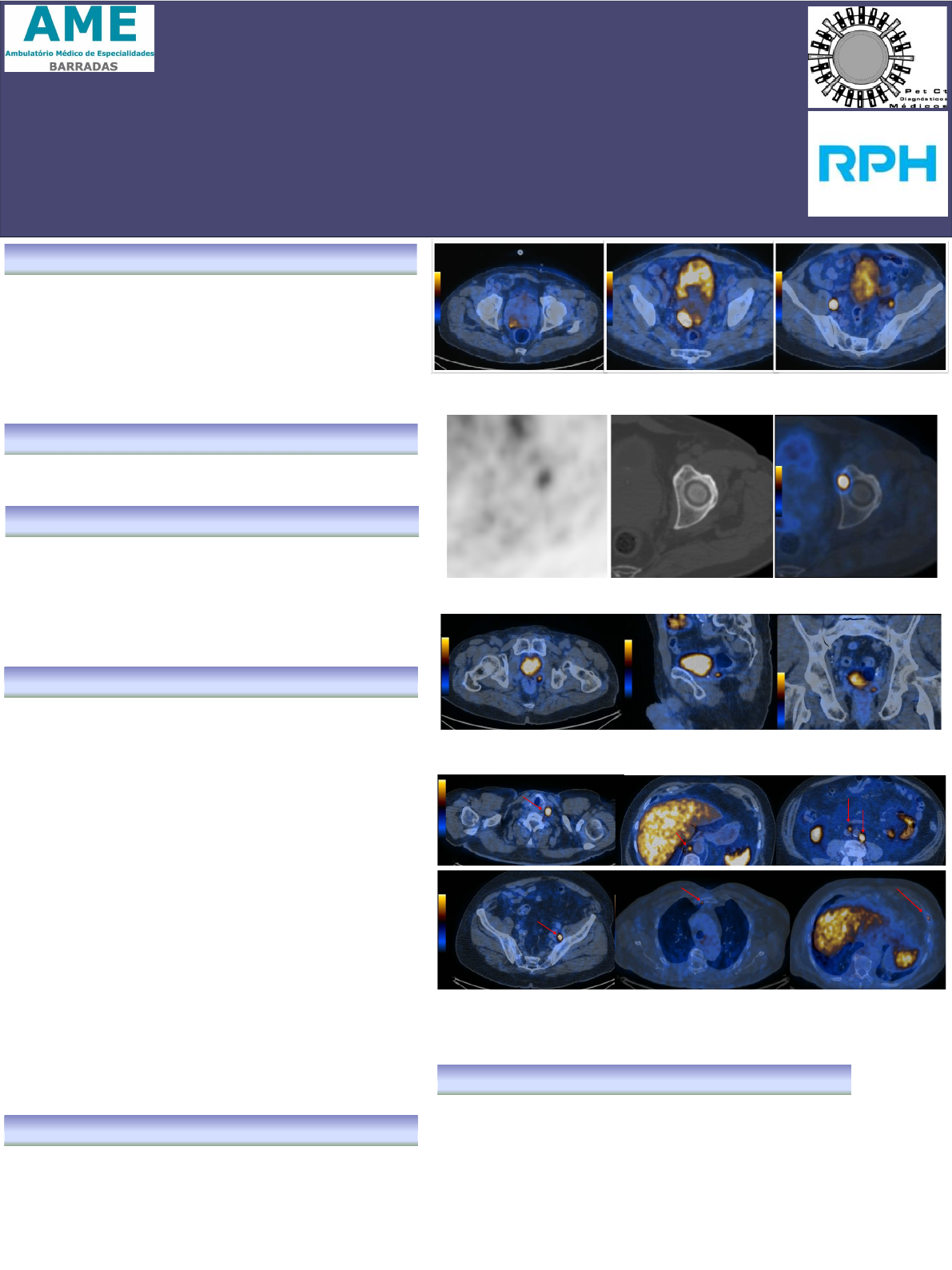 DA SILVA, A C B; de Toledo, L G M; Fernandes, R d C; Leitão, L F d M P; Lewin, F S; Alarcon, S T; Lewin, S S; Cancegliero, B M L; Madke, R R PET-CT PSMA-GÁLIO-68 NA AVALIAÇÃO DE PACIENTES COM CÂNCER DE PRÓSTATA – EXPERIÊNCIA NA REDE PÚBLICA. OBJETIVO Descrever experiência de um serviço da rede pública com pacientes submetidos ao PET-CT com PSMA-68Ga. MATERIAIS E MÉTODOS Entre março de 2019 e fevereiro de 2020, 171 pacientes foram referenciados por serviços de urologia ao AME Barradas para realização do exame após consentimento informado. O estudo foi realizado 1 hora após a injeção do radiofármaco (RF) no equipamento Discovery LSGE sem INTRODUÇÃO O PET-CT com PSMA-68Ga representa uma das principais ferramentas na avaliação de recidiva bioquímica (RB) do câncer de próstata (CaP) e no estadiamento de pacientes com alto e intermediário riscos para metástases. O antígeno se apresenta superexpresso nas células tumorais, permitindo detecção com alta acurácia e boa correlação laboratorial e anatomopatológica. Figura 1:caso I estadiamento - G8(4+4), PSA total e livre 46,97 e 7,40ng/mL, CT abdome e cintilografia óssea negativas para metástases. Cortes axiais da fusão do PET-CT com PSMA-68Ga demonstram foco mais captante da lesão 1ª (A), envolvimento das vesículas seminais, notadamente da direita (B) e de linfonodos pélvicos (C). mL A B C A B Figura 2: caso I estadiamento – cortes axiais do PET (A), CT (B) e fusão (C) demonstrando envolvimento acetabular incipiente com tênue esclerose do trabeculado e grande avidez pelo PSMA-68Ga. mL CA B A B C REFERÊNCIAS BIBLIOGRÁFICAS radiofármaco (RF) no equipamento Discovery LSGE sem contraste iodado. O RF foi doado por empresa privada. RESULTADOS 145pacientes (84,8%) foram submetidos ao exame devido à RB, 22 (12,9%) para estadiamento e 4 (2,3%) reestadiamento. Foram detectadas lesões em 94 (55%) pacientes, 71 (41,5%) exames foram negativos e 06 indeterminados (3,5%). Achados não relacionados ao CaP foram descritos em 37 pacientes. O nível de PSA total dos pacientes com exames positivos variou entre 0,32 e 165,46ng/mL e o dos negativos entre 0,03 e 8,94ngdL. Entre os pacientes submetidos ao exame para estadiamento (4- 18,2%) demonstraram metástase à distância, outros (4- 18,2%) comprometimento linfonodal regional, extensão para vesículas seminais (2–9,1%) e (12-54,5%) lesão restrita à próstata. Dentre os 68 (72,3%) exames positivos na RB 13 (19,1%) foram recidiva local, 10 (14,7%) local e linfonodos regionais, 26 (38,2%) apenas linfonodos regionais, 5 (7,35%) linfonodos à distância, 13 (19,1%) lesões ósseas e 1 (1,55%) lesões pulmonares. Nos 4 pacientes submetidos ao exame para reestadiamento, observou-se maior número de lesões em relação à tomografia e à cintilografia óssea e capacidade de diferenciação entre lesões escleróticas tratadas das ainda em atividade. CONCLUSÃO No cenário de estadiamento, observou-se doença extraprostática em 45,5% dos pacientes, dado impactante na tomada de conduta. Dentre os pacientes com RB, observou- se predomínio de envolvimento linfonodal e doença à distância em 28% dos pacientes, informação prognóstica e relevante para decisão terapêutica. Figura 3: caso II recidiva bioquímica – 79 anos, PTR em 2011, T2cN0Mx, G 7 (3+4), PSA total 0,32ng/mL. Cortes axial (A), sagital (B) e coronal (C) da fusão do PET com PSMA-68Ga demonstram foco de recidiva no leito cirúrgico à esquerda. Figura 4: caso III recidiva bioquímica - 75 anos, PTR 2007, T2aN0M0, G 7 (4+3), PSA total 16,67ng/mL, cintilografia negativa, CT tórax imagem nodular no 1/3 inferior do hemitórax direito e CT abdome com linfonodos retroperitoneais numericamente proeminentes. Cortes axiais do PET com PSMA-68 demonstram envolvimento linfonodal regional e à distância e ósseo incipiente (setas). Conduta proposta seria radioterapia ou vigilância, optado por protocolo com Apalutamida após resultado do PET. •PET imaging with a [68Ga]gallium-labelled PSMA ligand for the diagnosis of prostate cancer: biodistribution in humans and first evaluation of tumour lesions. Eur Urol 2014;65(2):467-79; •Preliminary results of a 68 Ga-PSMA PET/CT prospective study in prostate cancer patients with occult recurrence: Diagnostic performance and impact on therapeutic decision-making. J Nucl Med 2015;56(5):668-74; •Evaluation of Hybrid ⁶⁸Ga-PSMA Ligand PET/CT in 248 Patients with Biochemical Recurrence After Radical Prostatectomy. Radiol Bras. 2018 Mai/Jun;51(3):151–155 ; •Assessment of 68Ga-PSMA-11 PET Accuracy in Localizing Recurrent Prostate Cancer A Prospective Single-Arm Clinical Trial. JAMA Oncol. Published online March 28, 2019; •Impact of Ga-68-PSMA PET/CT on management in prostate cancer patients with very early biochemical recurrence after radical prostatectomy. Eur J Nucl Med Mol Imaging. Eur J Nucl Med Mol Imaging. 2019 Apr;46(4):901-907; •The role of prostate-specific membrane antigen PET/computed tomography in primary staging of prostate cancer. Curr Opin Urol.2019 Nov;29(6):569-577; •The Impact of 68Ga-PSMA PET/CT and PET/MRI on the Management of Prostate Cancer. Urology. 2019 Aug;130:1-12; •Preliminary results of a 68 Ga-PSMA PET/CT prospective study in prostate cancer patients with occult recurrence: Diagnostic performance and impact on therapeutic decision-making. Prostate. 2019 Sep;79(13):1514-1522.