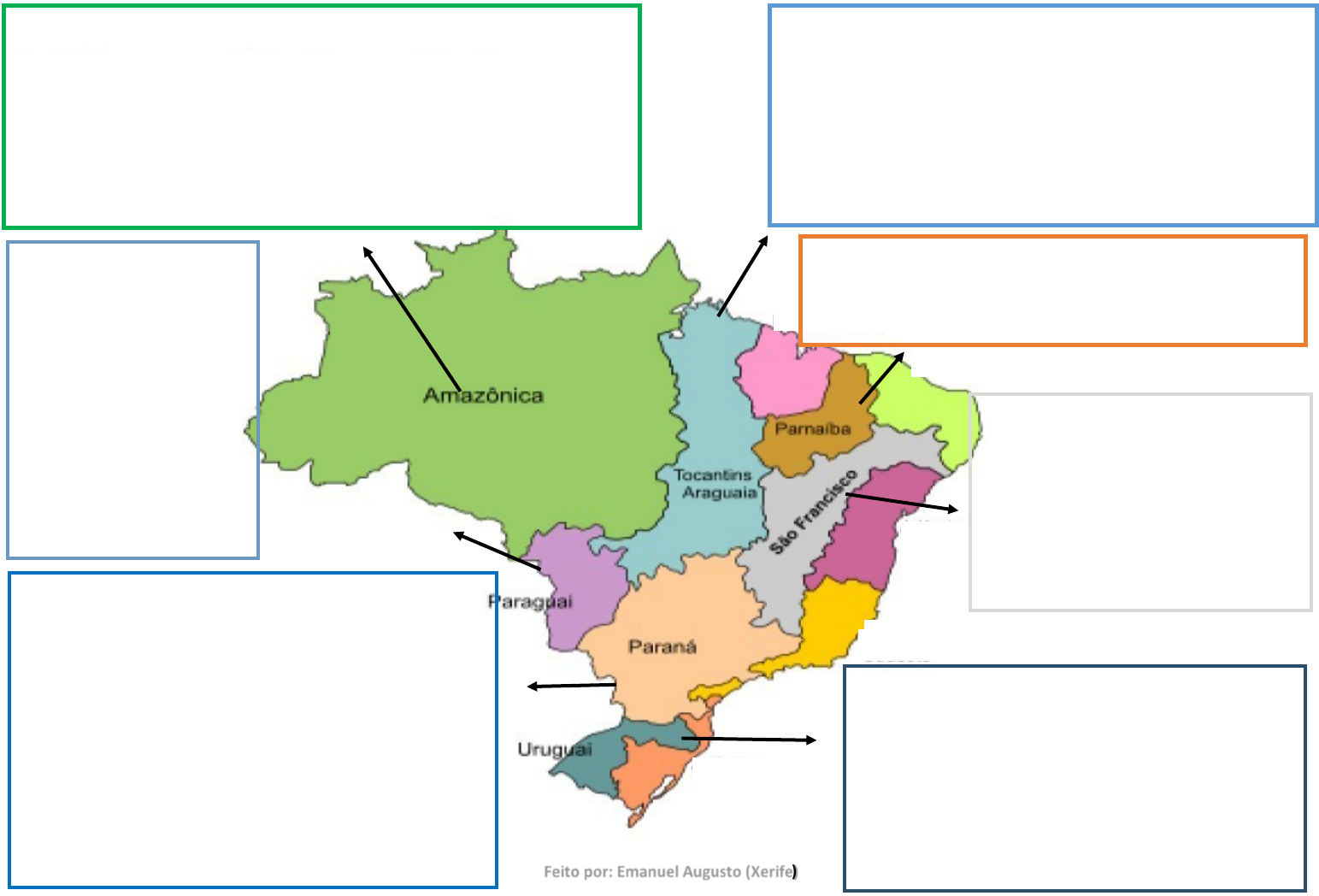 A maior hidrografia do mundo (6 milhões de km.) / 56% do território do país; Principais hidrelétricas: São Samuel(RO), Balbina(AM), Curuá-Uma(PA), Coaracy Nunes(AP); Não é tão aproveitada por estar em área pouco habitada e poucas indústrias; Principal rio: Amazonas; nascido nos Andes, no país vira Solimões e após receber águas do Rio Negro é Amazonas; Localização: Amazonas, Pará, Acre, Rondônia, Amapá, Mato Grosso e Roraima. Usada na construção de usinas hidrelétricas (Furnas, Marim- bondo e a maior do mundo — Itaipu (entre BRA e PAR) —. Principal rio: Paraná (junção dos rio Grande e Parnaíba); Por ter rios de planalto é a região hidrográfica de maior apro- veitamento hidrelétrico nacional; Possui uma hidrovia (Tietê-Paraná) / É uma bacia de planal- to; Contém áreas mais urbanizadas, de maior população e de- senvolvimento; Localização: SP, MG, Paraná, MS, GO, SC e DF. 2ª maior hidrografia do Brasil / Drena 11% do território nacional; Contém a maior ilha fluvial do mundo: Ilha do Bananal; Contém a Usina Tucuruí / Maior unicamente do Brasil; 3ª com maior potencial hidrelétrico; Nasce no norte de GO e deságua junto à foz do Amazonas; 2% apenas do território brasileiro / Local: SC e RS. Formado por: rios Canoas e Pelotas, possui 1500km de extensão e serve de limite entre BRA, ARG e URU. Usado para navegação em alguns trechos, Principais hidrelétricas: Barracão, Machadinho, Pinheiro, Estreito do Sul e Iraí; Potencial hidrelétrico limitado. Responsável por 7,5% de drenagem; Localização: BA, AL, SE, PE; Responsável por transporte e abastecimento de couro. Aproveitamento: irrigação e navegação; Usinas: 3 Marias, Paulo Afonso e Sobradinho. Drena 4% (quase todo PI, MA e CE /2ª mais importante do NE; Serve de divisa entre MA e PI, até atingir o Atlântico; Apresenta vários afluentes temporários por conta do clima semiárido. Maior genuinamente de planície / Cheias são responsáveis pelo Pan- tanal / Nasce em Mato Grosso; Rio principal: Paraguai; Faz ligação do Paraguai com o Atlântico; Portos: Corumbá e Porto Murti- nho; Único grande rio (2k km e 1,4k km BRA) Feito por: Emanuel Augusto (Xerife)