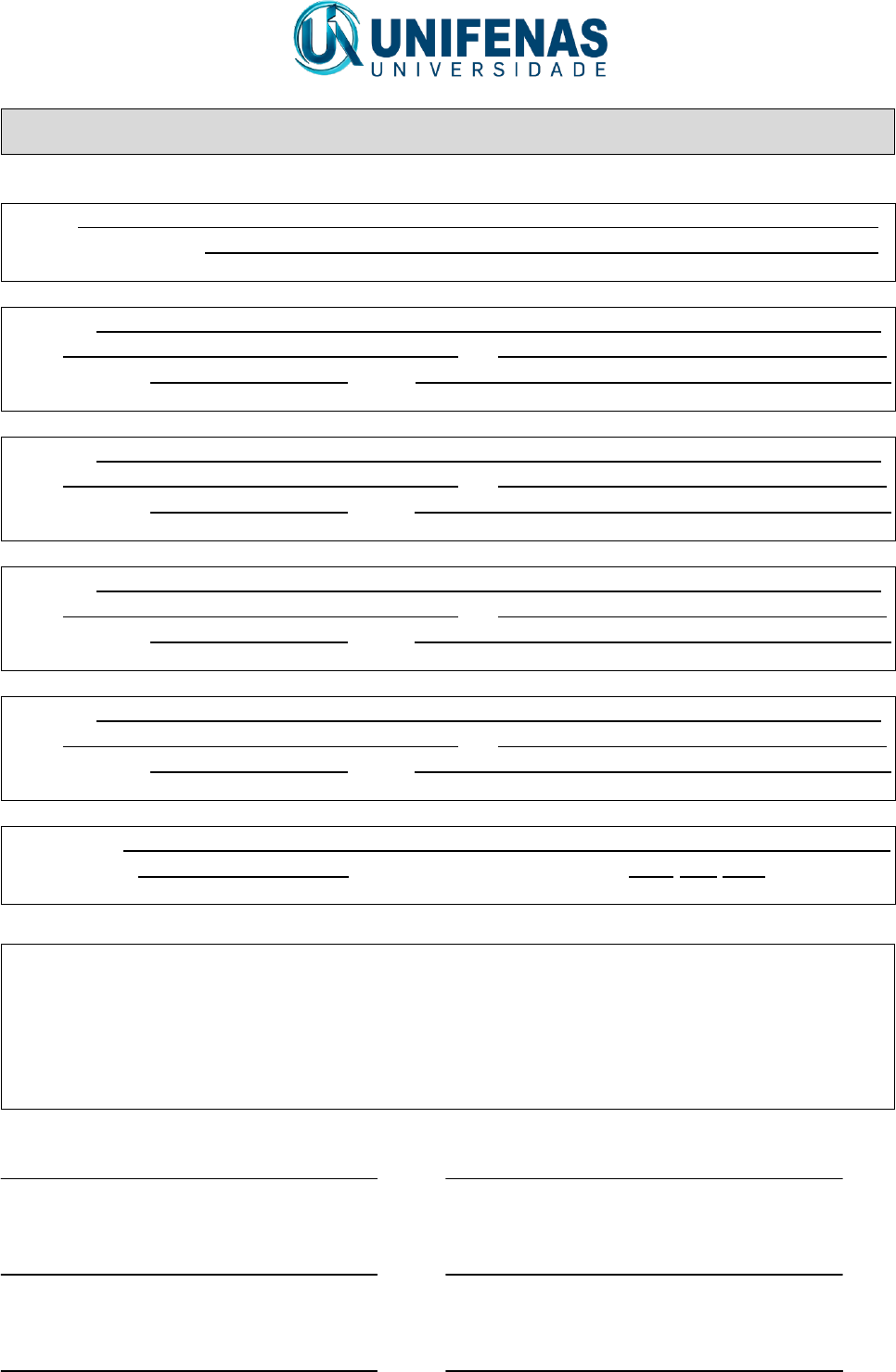 TERMO DE AUTORIZAÇÃO PARA PUBLICAÇÃO DE TRABALHO DE CONCLUSÃO DE CURSO NO REPOSITÓRIO INSTITUCIONAL DA UNIVERSIDADE PROFESSOR EDSON ANTÔNIO VELANO Curso: Título do Trabalho: Autor 1: CPF: RG: Telefone: ( ) e-mail: Autor 2: CPF: RG: Telefone: ( ) e-mail: Autor 3: CPF: RG: Telefone: ( ) e-mail: Autor 4: CPF: RG: Telefone: ( ) e-mail: Orientador: Nº de folhas: Data da defesa: / / Na qualidade de titular dos direitos de autor da publicação, autorizo a UNIFENAS – Universidade Professor Edson Antônio Velano a disponibilizar por meio de seu Repositório Institucional, sem ressarcimento dos direitos autorais, de acordo com a Lei nº 9610/98, o texto integral da obra abaixo citada, para fins de leitura, impressão e/ou download, a título de divulgação da produção científica brasileira, ( ) a partir desta data. ( ) após prazo de 1 ano. Assinatura do autor 1 Assinatura do autor 2 Assinatura do autor 3 Assinatura do autor 4 Local e Data Assinatura do Orientador