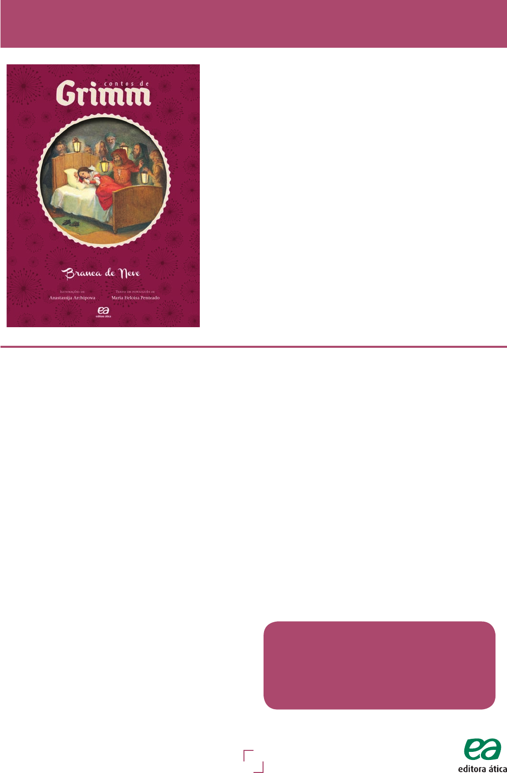 1 E st e R o te iro d e Le itu ra re fe re -s e à o b ra B ra nc a d e N ev e, d a E d ito ra Á tic a. N ão p o d e se r co m er ci al iz ad o . autores Jacob Grimm e Wilhelm Grimm texto em português Maria Heloísa Penteado ilustradora Anastassija Archipowa coleção Contos de Grimm editora Ática formato 19,5 x 26,5 cm número de páginas 16 faixa etária sugerida 6/7 anos roteiro de leitura BRANCA DE NEVE antes de ler o livro a) atividade de familiarização com o livro Proponha aos alunos que observem as informações da capa e da contracapa do livro e relatem dados que identifiquem a obra que será lida, como: Título do livro: BRANCA DE NEVE Autores: jACoB E wiLhELm gRimm Texto em português: mARiA hELoísA PENtEADo Ilustradora: ANAstAssijA ARChiPowA Coleção ou série: CoNtos DE gRimm Editora: ÁtiCA Explique a função de cada item. mostre onde geralmente estão o nome da cidade da editora, o número de edição e o ano de publicação. A familiarização com a ficha técnica do livro leva as crianças a entender melhor o que são informações bibliográficas e, assim, aprender procedimentos importantes para sua formação como leitores. B) atividades de preconhecimento/ contextualização soBre o tema 1. Convide os alunos a observar e a folhear o livro para que possam reconhecer elementos que vão ajudá-los a se aproximar da obra. Para estimular a participação, faça perguntas como: > Qual é o título do livro? > Vocês conhecem essa história? > sobre o que ela fala? Talvez os alunos já conheçam outras versões do conto Branca de Neve. Incentive-os a contá-las e a perceber as diferenças entre elas. 2 E st e R o te iro d e Le itu ra re fe re -s e à o b ra B ra nc a d e N ev e, d a E d ito ra Á tic a. N ão p o d e se r co m er ci al iz ad o . 2. Após o relato dos alunos, leia para a turma a resenha do livro e pergunte se acham que há diferenças entre as versões que eles apresentaram e a que será lida em classe. se sim, quais? biografia dos autores Irmãos Grimm foi como ficaram conhecidos Jacob Grimm (1785-1863) e Wilhelm Grimm (1786-1859), nascidos em Hessen, na Alemanha. Ambos se formaram em Direito, foram chefes de biblioteca e professores universitários, dedicando-se ao estudo da língua alemã. Os contos populares pesquisados e colhidos pelos irmãos contribuíram para a preservação da memória do povo alemão e se transformaram em clássicos da literatura mundial. Maria Heloísa Penteado nasceu na cidade de Araraquara, no estado de São Paulo, em 1919. Seu interesse por histórias e o talento para contá-las manifestaram-se desde a infância e se estenderam pela vida adulta, estimulados por seus sobrinhos e pelos alunos das escolas onde lecionou. Maria Heloísa começou publicando contos no jornal O Estado de S. Paulo e depois concebeu uma seção inteira dedicada às crianças, em que criava histórias, ilustrações e passatempos. Seus primeiros livros foram publicados ainda nos anos 1950. Desde então, já são mais de quarenta títulos, muitos deles premiados. resenha do livro Branca de Neve era uma princesa muito bonita. Tinha a pele alva como a neve, era corada como o sangue e possuía os cabelos negros como o ébano. No entanto, quando a rainha, sua madrasta, descobriu que a menina era mais bonita do que ela, a princesa foi obrigada a fugir para sobreviver. Branca de Neve então conhece sete anões, que lhe dão abrigo e a ajudam a escapar dos planos da rainha, determinada a acabar com a garota para se tornar a mulher mais bela do mundo. No livro, por meio das ilustrações e do texto narrativo, procura-se preservar as características originais dos contos dos irmãos Grimm. É possível conhecer um pouco da ambientação, da linguagem e dos costumes da época em que as histórias eram transmitidas oralmente. 3. Leia com os alunos a biografia dos autores e explique para a turma que Branca de Neve é um conto baseado em uma história da tradição oral, recolhida há mais de dois séculos. Por isso, ela pode ter diversas versões, como a da autora maria heloísa Penteado. Peça para os alunos observarem na contracapa do livro outras histórias transmitidas pelos irmãos grimm. Pergunte se eles conhecem alguma delas. Temas: ciúme / amizade / ética. Converse com os alunos sobre a importância da escrita dos contos populares e explique que, assim como os irmãos grimm registraram as narrativas orais para que não se perdessem no tempo, a autora paulista recontou essa história com o objetivo de preservá-la. 3 E st e R o te iro d e Le itu ra re fe re -s e à o b ra B ra nc a d e N ev e, d a E d ito ra Á tic a. N ão p o d e se r co m er ci al iz ad o . 4. Peça para os alunos folhearem novamente o livro, observando as ilustrações, e questione: > o que vocês acham das imagens? > Elas parecem contar uma história recente ou uma história que aconteceu há muito tempo? Por quê? também podem ajudá-los a compreender o texto. Quando estiverem observando os desenhos, incentive os alunos a formular hipóteses sobre o enredo da história. Não descarte nenhuma possibilidade: diga que eles descobrirão o que está acontecendo quando lerem o conto. durante a leitura do livro Bate-papo soBre a história Durante a leitura compartilhada, faça algumas interrupções em momentos estratégicos do texto, formulando perguntas que gerem suspense sobre possíveis acontecimentos da história, ajudem o leitor a compreender melhor a obra e abram a possibilidade de a criança fazer relações com sua vida e com outras obras. Algumas sugestões: 1. No decorrer da história poderão aparecer palavras pouco comuns no dia a dia dos alunos. se eles perguntarem, utilize diferentes estratégias para contextualizar o vocabulário. Explique que, quando deparamos com palavras desconhecidas em um texto, podemos descobrir seus significados por meio das ilustrações e pelo desenvolvimento da história. > “Uma vez, foi em pleno inverno, quando flocos de neve caíam do céu