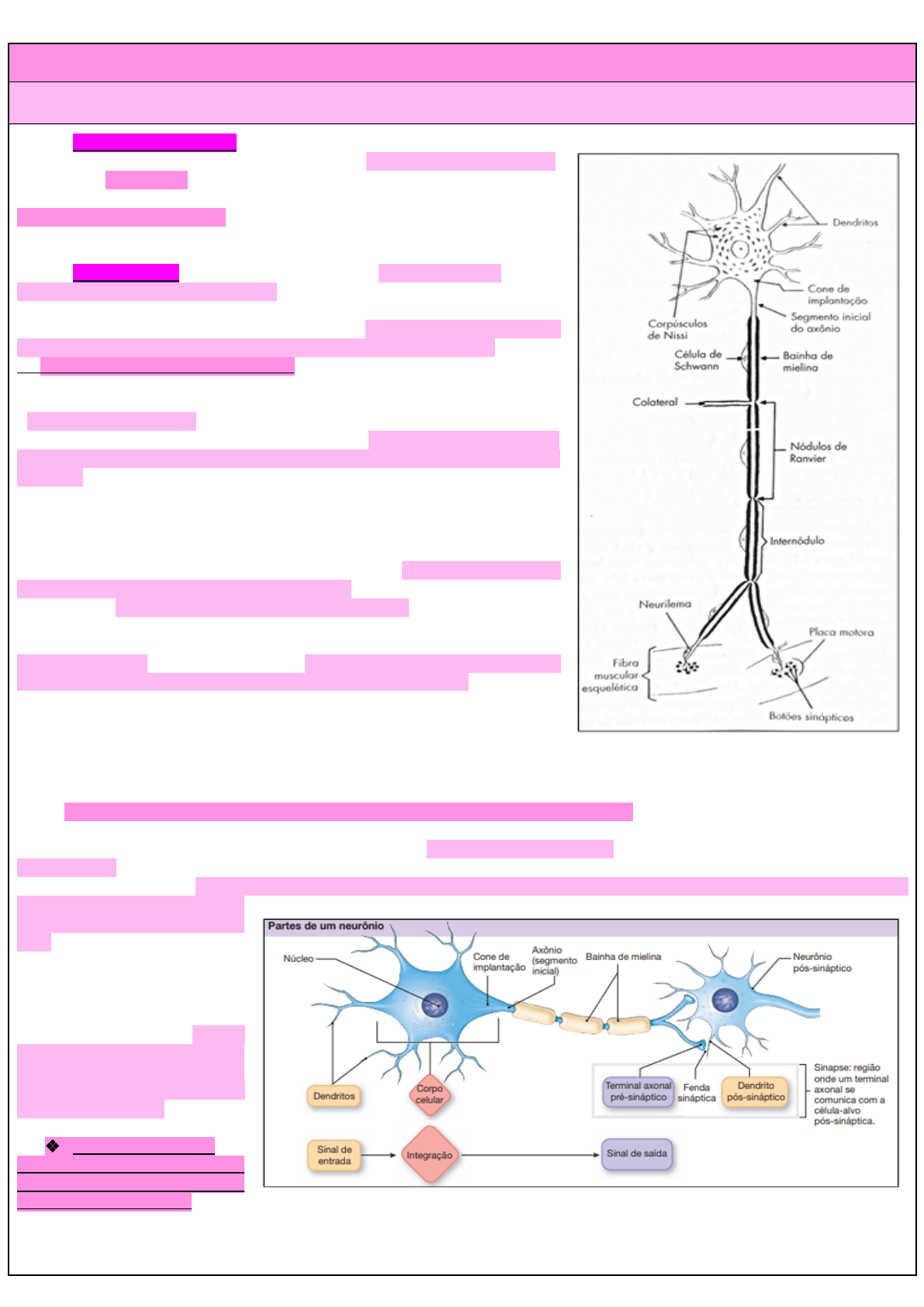 Karina Luiz - T2 231 Tutorial 1 mód XII Anatomi� � fisiologi� ❖ TECIDO NERVOSO O tecido nervoso é formado basicamente por dois tipos celulares : Os neurônios , que são a unidade fundamental do sistema, possuindo a função de receber, processar e enviar informações;E as células gliais (neuróglia ) , que ocupam os espaços entre os neurônios, sendo responsável por sustentar, revestir ou isolar e defender os neurônios,além da modulação da atividade neural. ❖ NEURÔNIOS ⇒ São células altamente excitáveis, que utilizam uma linguagem elétric a para se comunicarem entre si ou com outras células efetoras. OBS: Após a diferenciação, os neurônios não se dividem mais, de modo que as células mortas jamais serão substituíd as. ➥ AS REGIÕES NEURONAIS ⇒ A maior parte dos neurônios possui três regiões responsáveis por funções especializadas, sendo elas: 1 . CORPO CELULAR : Parte que contém o núcleo e o citoplasma , denominado de pericário ,com a m aioria das organelas citoplasmáticas em grandes quantidades para síntese proteica. Sendo assim a região é considerada como o centro metabólico do neurôni o, atuando também como região de renovação e degradação de constituintes celulares. → A forma e o tamanho do corpo celular são variáveis conforme o tipo de neurônio. OBS: O corpo celular também atua como lo cal de recepção de estímulos através de contatos sinápticos OBS 2 : Os ribossomos podem ficar concentrad os em uma região, formando grumos conhecidos por corpúsculos de Nissl , que ao redor contém grandes quantidades de mitocôndrias. 2. DENDRITOS : Geralmente são curtos, ramificando-se similar a galhos de uma árvore para originar dendritos menores, porém que apresentam as mesmas organelas do pericário nas porções mais calibrosas. ○ Os dendritos são especializados em receber estímulos, traduzindo-os em alterações do potencial de repouso da membrana que se propagam em direção ao corpo neuronal e ao axônio. ○ OBS : Na estrutura dos dendritos, há as e spinhas dendríticas que existem em grande número em alguns neurônios, sendo expansões da membrana plasmática do neurônio com características esp ecíficas. Cada espinha é constituída por um componente distal globoso que se liga a superfície do dendrito por uma haste, enquanto que a parte globosa é conectada a um ou dois terminais axônicos, formando sinapses axodendríticas. 3. AXÔNIO: O axônio, geralmente, é um prolongamento de comprimento variável (que pode chegar a até um metro) e fino que se origina do c orpo ou de um dendrito principal, a partir de uma região denominada de cone de implantação , sendo praticamente desprovida de substância de Niss l. É a região especializada em gerar e conduzir o potencial de ação . ○ Os axônios, após emitir número variável de colaterais, geralmente sofrem arborização terminal, que estabelece conexões com outros neurônio s ou com células efetora s, ou que secretam substâncias . ❖ CLASSIFICAÇÃO DOS NEURÔNIOS QUANTO A SEUS PROLONGAMENTOS ⇒ Há três tipos principais de neurônios, sendo eles: 1. NEURÔNIOS MULTIPOLARES: São a maioria dos neurônios, possuindo vários dendritos e um axônio 2. NEURÔNIOS BIPOLARES: Possuem dois prolongamentos que deixam o corpo celular, sendo um dendrito e um axônio . Como por exemplo os neurônios da retina 3. NEURÔNIOS PSEUDOUNIPOLARES : Os corpos celulares se l ocalizam nos gânglios sensitivos, apenas um prolongamento deixa o corpo celular, dividindo-se na forma de um T , que forma dois ramos, um periférico, que forma as t erminações nervosas sensitiva ; E outro centr al, que estabelece contatos com outros neurônios. OBS: Na neurogênese, os neurônios pseudounipolares possuem dois prolongamentos que posteriormente se fundem na porção inicial. ❖ TRANSMISSÃO SINÁPTICA ● Sinapse : ○ Potencial de ação: As bombas da membrana do neurônio bombeiam o Na para fora e deixam o K dentro da célula mantendo o potencial de repouso em -65 m V Quando neurônios são estimulados, os canais iônicos se abrem e ocorre influxo de Na+ , modificando o potencial de repouso para + 30mv(interior positivo) , gerando um potencial de ação ou impulso nervoso que se propaga por todo o axônio e libera os neurotransmissores na fenda Depois os canais de K se abrem e volta para potencial de repouso ○ Comunicação sináptica: Acontece com a liberação dos neurotransmissores do terminal pré sinaptico para a fenda sin áptica e depois para o terminal pré-sináptico. Sempre na mesma direção. A comunicação sináptica transforma um sinal elétrico (impulso nervoso) do neurônio pré-sináptico em um sinal químico que atua na célula pós sináptica. ● Tipos de sinapse : ○ Sinapses químicas : comunicação se dá por meio dos neurotransmissores e a transmissão é unidirecional. ○ Sinapses elétricas : se dá por juncoes comunicantes e a transmissão é bidirecional Neurônios acoplados nessas junções são encontrados em áreas nas quais os neurônios precisam estar sincronizadas (exemplo: centro respiratório ou nas regiões secretoras de hormônios no hipotálamo). ❖ TRANSDUÇÃO DO SINAL SINÁPTICO - Potencial de ação chega ao terminal pré-sináptico → canais Ca2+ dependentes se abrem → influxo cálcio → vesículas com neurotransmissores se fundem com a membrana e difundem neurotransmissores para a fenda sináptica. -Neurotransmissores → se ligam aos receptores pós-sinápticos → promove a a bertura canais iônicos que pode levar a um potencial pós-sináptico inibitório (PPSI) ou excitatório (PPSE). → Influxo Na+→ PPSExcitatóri o, membrana chega mais perto do liminar. →Influxo Cl-→ PPSInibitório, afasta o potencial e membrana do limiar. -Somação temporoespacial: É preciso efeito cumulativo de milhares de sinapses para um certo neurônio pós-sináptico provocar PA. -Receptores que controlam os canais iônicos: → Re