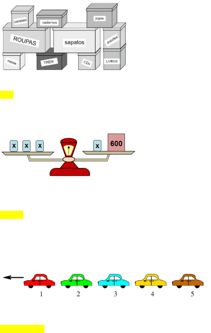 QUESTÕES – OLIMPIADAS INTERNAS – NÍVEL II (8º E 9º) 01. (Canguru Matemático) Qual é o menor número de caixas que Bruno deve tirar do lugar antes de poder abrir a caixa com TREM? A) 3 B) 4 C) 5 D) 6 02. (ICC) Numa balança, como representada abaixo, foram colocados objetos de maneira que a balança ficou em equilíbrio. Se a letra x representa o peso do objeto conforme a figura, para que o prato da esquerda tenha o mesmo peso do prato da direita o valor de x deve ser A) 150. B) 200. C) 300. D) 600. 03. (Canguru Matemático) Cinco carros, numerados de 1 a 5, correm no mesmo sentido. Primeiramente, o último carro (5) ultrapassa dois carros à sua frente. Nesta nova situação, o penúltimo carro ultrapassa dois carros à sua frente. E na última situação, o carro do meio também ultrapassa dois carros à sua frente. Qual é a ordem dos carros depois dessas ultrapassagens? A) 1, 2, 3, 5, 4 B) 2, 1, 3, 5, 4 C) 2, 1, 5, 3, 4 D) 3, 1, 4, 2, 5 04. (Canguru Matemático) João construiu a torre ao lado. O que ele poderá observar quando olhar a torre de cima? . . . . 05. (Canguru Matemático) Pedro tem um pacote de 445 gramas e oito pesos com valores também em gramas: Ele coloca o pacote na balança, como mostrado. Qual é o menor número de pesos que ele deve usar para equilibrar a balança? A) 2 B) 3 C) 4 D) 5 06. (UFPR) As balanças a seguir estão em equilíbrio: Nessas condições, o valor de x, em kg, que equilibra a terceira balança é: A) 22. B) 21. C) 19. D) 17. 07. (Canguru Matemático) Luciana tem três blocos diferentes e fez algumas pesagens com eles. Quanto pesam, em gramas, os três blocos juntos? A) 270 B) 280 C) 290 D) 300 08. (Canguru Matemático) Maria está jogando amarelinha. A figura mostra os primeiros quadrados deste jogo de amarelinha não convencional, no qual o padrão dos quatro primeiros quadrados se repete de baixo para cima. Em qual dos quadrados a seguir Maria vai pisar somente com o pé direito? A) no 10o B) no 15o C) no 20o D) no 22o 09. (Conspass) Um condomínio foi projetado de modo que do portão principal saem duas alamedas não paralelas entre si e transversais às demais ruas de circulação, que formam um feixe de paralelas. Abaixo apresentamos um desenho simplificado dessa situação: Qual o comprimento da lateral do lote 2 que fica voltada para a alameda 1? 25 metros 24 metros 20 metros 30 metros 10. (HCFMB) Se para construir um muro de 600 metros Sr Benedito precisa trabalhar por 8 dias. Quanto tempo Sr Benedito precisa para construir um muro de 900 metros, mantendo o mesmo ritmo de trabalho? A) 9 dias; B) 11 dias; C) 12 dias; D) 16 dias. 11. (Canguru matemático) Cinco elefantes grandes e quatro pequenos estão andando em fila por um caminho, conforme figura ao lado. Quando chega à bifurcação do caminho, cada elefante tomaa direita ou a esquerda e segue andando. Qual das figuras abaixo NÃO pode representar a situação dos elefantes após a passagem pela bifurcação? . . . . 1. 12. (IFRN – Exame de Seleção) Para trocar a lâmpada de um poste de iluminação de uma avenida, foi usada uma escada Magirus de 15m de comprimento. A escada encontrava-se sobre um caminhão de 2m de altura, afastado 12m do poste. Sabendo que a extremidade da escada coincide com a extremidade do poste, podemos concluir que a altura desse poste é: 1. A) 9m B) 10m C) 11m D) 12m 13. (IFRN/adaptada) Para montar uma das estruturas da cúpula da Amazônia, uma empresa sabe que se 6 de seus trabalhadores trabalharem 8 horas por dia, durante 5 dias, finalizam a estrutura. Precisando finalizar essa estrutura em 2 dias, se seus funcionários trabalharem 10 horas por dia, mantendo o mesmo ritmo de trabalho, será necessário A) Contratar mais 4 trabalhadores. B) Contratar mais 8 trabalhadores. C) Contratar mais 2 trabalhadores. D) Contratar mais 6 trabalhadores. 14. ( IFRN - Exame de Seleção) Em consulta a um mapa cartográfico da Síria, cuja escala é 1:3.000.000, as cidades Damasco e Alepo distam entre si, em linha reta, aproximadamente 10 cm. Um novo mapa, dessa mesma região, será construído na escala 1:2.000.000. Nesse novo registro cartográfico, a distância aproximada, em centímetros, considerando uma linha reta entre essas cidades, será A) 7,5. B) 12,5. C) 15. D) 18. 15. (Vunesp) Um retângulo foi dividido em 4 regiões, sendo uma delas a região Q, de 30 cm² de área, e outra a região T, em forma de triângulo retângulo, cujos vértices estão sobre os lados do retângulo e com um dos catetos medindo 5 cm, conforme mostra a figura. A área da região R é A) 11 cm2. B) 12 cm2. C) 13 cm2. D) 14 cm2. image5.png image6.png image7.png image8.png image9.png image10.png image11.png image12.png image13.png image14.png image15.png image16.png image17.png image18.png image19.png image20.png image21.png image22.png image1.png image2.png image3.png image4.png