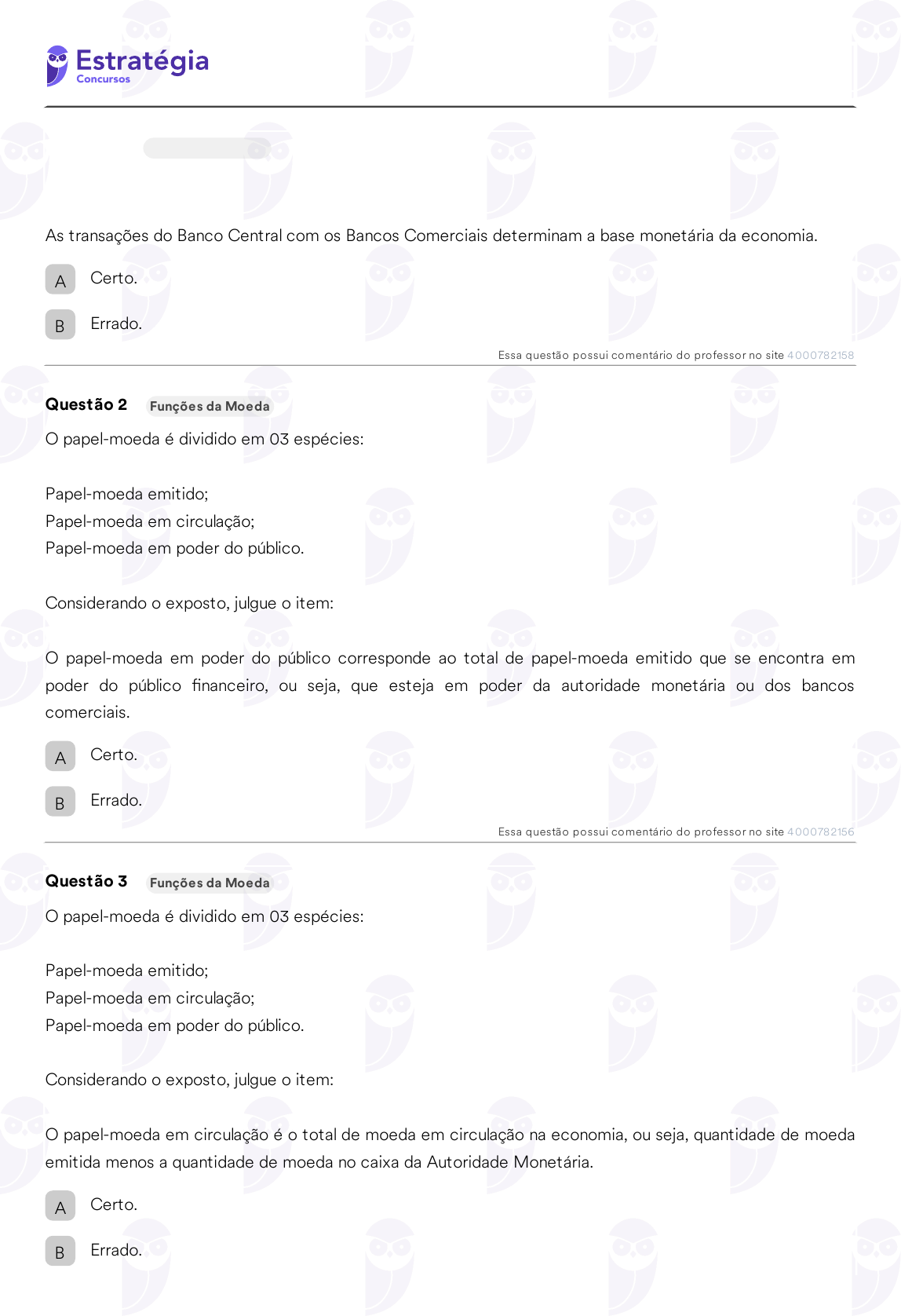 atualidades do mercado financeiro EDILSON DE CASTRO EVANGELISTA - 695.520.103-49 Acessar Lista Questão 1 Funções da Moeda Considerando as disposições acerca das Contas do Sistema Monetário, julgue o item seguinte: As transações do Banco Central com os Bancos Comerciais determinam a base monetária da economia. A Certo. B Errado. Essa questão possui comentário do professor no site 4000782158 Questão 2 Funções da Moeda O papel-moeda é dividido em 03 espécies: Papel-moeda emitido; Papel-moeda em circulação; Papel-moeda em poder do público. Considerando o exposto, julgue o item: O papel-moeda em poder do público corresponde ao total de papel-moeda emitido que se encontra em poder do público nanceiro, ou seja, que esteja em poder da autoridade monetária ou dos bancos comerciais. A Certo. B Errado. Essa questão possui comentário do professor no site 4000782156 Questão 3 Funções da Moeda O papel-moeda é dividido em 03 espécies: Papel-moeda emitido; Papel-moeda em circulação; Papel-moeda em poder do público. Considerando o exposto, julgue o item: O papel-moeda em circulação é o total de moeda em circulação na economia, ou seja, quantidade de moeda emitida menos a quantidade de moeda no caixa da Autoridade Monetária. A Certo. B Errado. https://concursos.estrategia.com/cadernos-e-simulados/cadernos/4deae9f9-ba25-4059-8120-f1ef74a447e4 Mobile User Essa questão possui comentário do professor no site 4000782154 Questão 4 Funções da Moeda O papel-moeda é dividido em 03 espécies: Papel-moeda emitido; Papel-moeda em circulação; Papel-moeda em poder do público. Considerando o exposto, julgue o item: O papel-moeda emitido é o total de moeda emitido pela Autoridade Monetária, que se encontra exclusivamente no caixa da Autoridade Monetária. A Certo. B Errado. Essa questão possui comentário do professor no site 4000782153 Questão 5 Funções da Moeda Acerca dos agregados monetários, julgue o item seguinte: Os agregados monetários podem substituir a moeda. A Certo. B Errado. Essa questão possui comentário do professor no site 4000782151 Questão 6 Funções da Moeda Atualmente, no Brasil, existem diversos agregados monetários. Com base nos agregados monetários, julgue o item sequente: O agregado monetário M3, também conhecido como meio de pagamento ampliado, abrange, inclusive, as quotas de fundos de renda xa, operações compromissadas registradas no SELIC e os títulos públicos de alta liquidez. A Certo. B Errado. Essa questão possui comentário do professor no site 4000782149 Questão 7 Funções da Moeda Atualmente, no Brasil, existem diversos agregados monetários. Com base nos agregados monetários, julgue o item sequente: Mobile User O agregado monetário M1, também conhecido como meio de pagamento restrito, é gerado pelas instituições emissoras de haveres estritamente monetários. Abrange o papel moeda em poder do público + depósitos à vista + depósitos especiais remunerados + depósitos de poupança + títulos emitidos por instituições depositárias. A Certo. B Errado. Essa questão possui comentário do professor no site 4000782148 Questão 8 Funções da Moeda Tendo como base as Funções da Moeda, julgue o item subsequente: Em que pese à relevância da liquidez na caracterização dos agregados monetários, atualmente o Banco Central define os agregados monetários de acordo com o sistema emissor. A Certo. B Errado. Essa questão possui comentário do professor no site 4000782146 Questão 9 Funções da Moeda Considerando as disposições acerca das Funções da Moeda, julgue o item seguinte: A conversão de títulos nanceiros em ativos é imediata, evidenciando maior liquidez que o papel moeda, além de incorrer em custos de transação menores. A Certo. B Errado. Essa questão possui comentário do professor no site 4000782144 Questão 10 Funções da Moeda Considerando as disposições acerca das Funções da Moeda, julgue o item seguinte: Podendo assumir formas distintas, a moeda se resume ao papel-moeda ou à moeda metálica, chamadas de moedas de curso forçado. A Certo. B Errado. Essa questão possui comentário do professor no site 4000782142 Questão 11 Funções da Moeda Basicamente, podemos resumir as funções da moeda da forma que segue: Mobile User - Meio de troca; - Unidade de conta; - Reserva de valor. Com base nisso, julgue o item subsequente: A Reserva de valor é um denominador comum na cotação do valor dos bens e serviços transacionados, o qual permite apurar o valor relativo dos bens, podendo perder a função em períodos de grande inflação. A Certo. B Errado. Essa questão possui comentário do professor no site 4000782141 Questão 12 Funções da Moeda Basicamente, podemos resumir as funções da moeda da forma que segue: - Meio de troca; - Unidade de conta; - Reserva de valor. Com base nisso, julgue o item subsequente: Unidade de conta está associada com a possibilidade de a moeda render juros e efetivar transações dentro do ambiente intertemporal. A Certo. B Errado. Essa questão possui comentário do professor no site 4000782139 Questão 13 Funções da Moeda Basicamente, podemos resumir as funções da moeda da forma que segue: - Meio de troca; - Unidade de conta; - Reserva de valor. Com base nisso, julgue o item subsequente: O Meio de Troca é considerado uma função intrínseca da moeda, o qual busca eficiência nas transações. A Certo. B Errado. Essa questão possui comentário do professor no site 4000782138 Mobile User Questão 14 Funções da Moeda Uma função primordial da moeda é servir como unidade de conta. Com base nisso e considerando as disposições acerca das Funções da Moeda, julgue o item seguinte: É coerente a rmar que, em períodos de grande in ação, a função de unidade de conta da moeda é prejudicada. A Certo. B Errado. Essa questão possui comentário do professor no site 4000782137 Questão 15 Funções da Moeda Considerando as disposições acerca das Fu