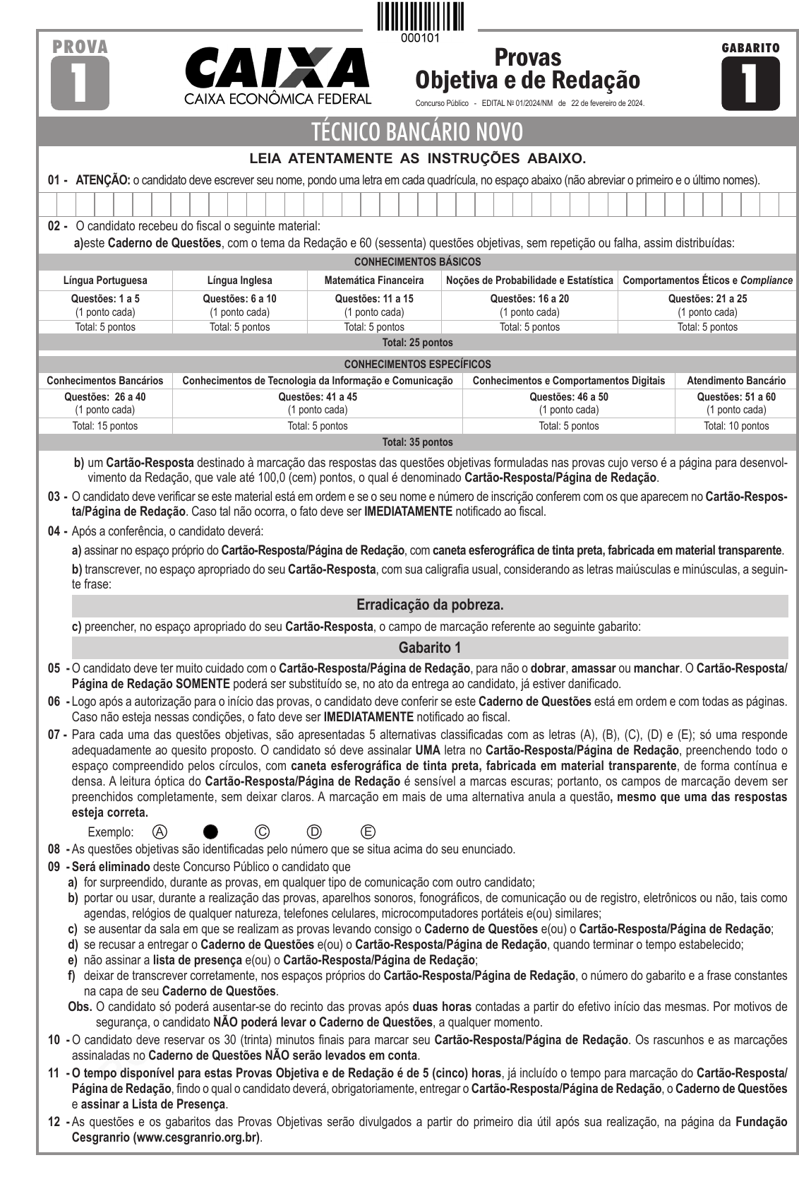 pcimarkpci MDAwMDowMDAwOjAwMDA6MDAwMDowMDAwOmZmZmY6YmYyNDpiYzMx:V2VkLCAxOCBTZXAgMjAyNCAxNTozMTozNyAtMDMwMA== www.pciconcursos.com.br LEIA ATENTAMENTE AS INSTRUÇÕES ABAIXO. 01 - ATENÇÃO: o candidato deve escrever seu nome, pondo uma letra em cada quadrícula, no espaço abaixo (não abreviar o primeiro e o último nomes). 02 - O candidato recebeu do fiscal o seguinte material: a) este Caderno de Questões, com o tema da Redação e 60 (sessenta) questões objetivas, sem repetição ou falha, assim distribuídas: CONHECIMENTOS BÁSICOS Língua Portuguesa Língua Inglesa Matemática Financeira Noções de Probabilidade e Estatística Comportamentos Éticos e Compliance Questões: 1 a 5 (1 ponto cada) Questões: 6 a 10 (1 ponto cada) Questões: 11 a 15 (1 ponto cada) Questões: 16 a 20 (1 ponto cada) Questões: 21 a 25 (1 ponto cada) Total: 5 pontos Total: 5 pontos Total: 5 pontos Total: 5 pontos Total: 5 pontos Total: 25 pontos CONHECIMENTOS ESPECÍFICOS Conhecimentos Bancários Conhecimentos de Tecnologia da Informação e Comunicação Conhecimentos e Comportamentos Digitais Atendimento Bancário Questões: 26 a 40 (1 ponto cada) Questões: 41 a 45 (1 ponto cada) Questões: 46 a 50 (1 ponto cada) Questões: 51 a 60 (1 ponto cada) Total: 15 pontos Total: 5 pontos Total: 5 pontos Total: 10 pontos Total: 35 pontos b) um Cartão-Resposta destinado à marcação das respostas das questões objetivas formuladas nas provas cujo verso é a página para desenvol- vimento da Redação, que vale até 100,0 (cem) pontos, o qual é denominado Cartão-Resposta/Página de Redação. 03 - O candidato deve verificar se este material está em ordem e se o seu nome e número de inscrição conferem com os que aparecem no Cartão-Respos- ta/Página de Redação. Caso tal não ocorra, o fato deve ser IMEDIATAMENTE notificado ao fiscal. 04 - Após a conferência, o candidato deverá: a) assinar no espaço próprio do Cartão-Resposta/Página de Redação, com caneta esferográfica de tinta preta, fabricada em material transparente. b) transcrever, no espaço apropriado do seu Cartão-Resposta, com sua caligrafia usual, considerando as letras maiúsculas e minúsculas, a seguin- te frase: c) preencher, no espaço apropriado do seu Cartão-Resposta, o campo de marcação referente ao seguinte gabarito: 05 - O candidato deve ter muito cuidado com o Cartão-Resposta/Página de Redação, para não o dobrar, amassar ou manchar. O Cartão-Resposta/ Página de Redação SOMENTE poderá ser substituído se, no ato da entrega ao candidato, já estiver danificado. 06 - Logo após a autorização para o início das provas, o candidato deve conferir se este Caderno de Questões está em ordem e com todas as páginas. Caso não esteja nessas condições, o fato deve ser IMEDIATAMENTE notificado ao fiscal. 07 - Para cada uma das questões objetivas, são apresentadas 5 alternativas classificadas com as letras (A), (B), (C), (D) e (E); só uma responde adequadamente ao quesito proposto. O candidato só deve assinalar UMA letra no Cartão-Resposta/Página de Redação, preenchendo todo o espaço compreendido pelos círculos, com caneta esferográfica de tinta preta, fabricada em material transparente, de forma contínua e densa. A leitura óptica do Cartão-Resposta/Página de Redação é sensível a marcas escuras; portanto, os campos de marcação devem ser preenchidos completamente, sem deixar claros. A marcação em mais de uma alternativa anula a questão, mesmo que uma das respostas esteja correta. Exemplo: A B C D E 08 - As questões objetivas são identificadas pelo número que se situa acima do seu enunciado. 09 - Será eliminado deste Concurso Público o candidato que a) for surpreendido, durante as provas, em qualquer tipo de comunicação com outro candidato; b) portar ou usar, durante a realização das provas, aparelhos sonoros, fonográficos, de comunicação ou de registro, eletrônicos ou não, tais como agendas, relógios de qualquer natureza, telefones celulares, microcomputadores portáteis e(ou) similares; c) se ausentar da sala em que se realizam as provas levando consigo o Caderno de Questões e(ou) o Cartão-Resposta/Página de Redação; d) se recusar a entregar o Caderno de Questões e(ou) o Cartão-Resposta/Página de Redação, quando terminar o tempo estabelecido; e) não assinar a lista de presença e(ou) o Cartão-Resposta/Página de Redação; f) deixar de transcrever corretamente, nos espaços próprios do Cartão-Resposta/Página de Redação, o número do gabarito e a frase constantes na capa de seu Caderno de Questões. Obs. O candidato só poderá ausentar-se do recinto das provas após duas horas contadas a partir do efetivo início das mesmas. Por motivos de segurança, o candidato NÃO poderá levar o Caderno de Questões, a qualquer momento. 10 - O candidato deve reservar os 30 (trinta) minutos finais para marcar seu Cartão-Resposta/Página de Redação. Os rascunhos e as marcações assinaladas no Caderno de Questões NÃO serão levados em conta. 11 - O tempo disponível para estas Provas Objetiva e de Redação é de 5 (cinco) horas, já incluído o tempo para marcação do Cartão-Resposta/ Página de Redação, findo o qual o candidato deverá, obrigatoriamente, entregar o Cartão-Resposta/Página de Redação, o Caderno de Questões e assinar a Lista de Presença. 12 - As questões e os gabaritos das Provas Objetivas serão divulgados a partir do primeiro dia útil após sua realização, na página da Fundação Cesgranrio (www.cesgranrio.org.br). TÉCNICO BANCÁRIO NOVO Provas Objetiva e de Redação PROVA Concurso Público - EDITAL No 01/2024/NM de 22 de fevereiro de 2024. GABARITO 1 1 Erradicação da pobreza. Gabarito 1 pcimarkpci MDAwMDowMDAwOjAwMDA6MDAwMDowMDAwOmZmZmY6YmYyNDpiYzMx:V2VkLCAxOCBTZXAgMjAyNCAxNTozMTozNyAtMDMwMA== www.pciconcursos.com.br 2 CAIXA ECONÔMICA FEDERAL PROVA 1 - TÉCNICO BANCÁRIO NOVO GABARITO 1 REDAÇÃO A Caixa financia vários Programas de 