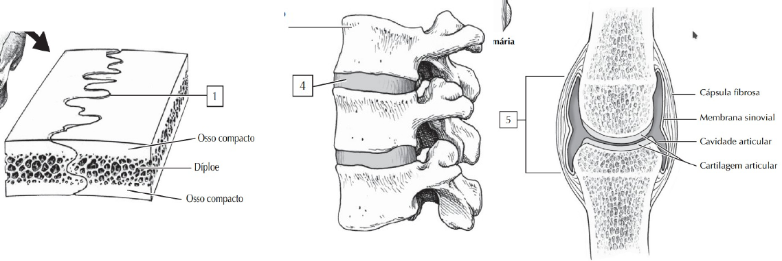 Questões Sistema Articular 1) As articulações são junções entre os ossos. Três tipos de articulações são identificadas em humanos. Sendo assim, assinale a alternativa que corresponde a sua correta classificação: A) Fibrosas (sinartroses), cartilagíneas (anfiartroses), sinoviais (diartroses); B) Fibrosas (anfiartroses), cartilagíneas (sinartroses), sinoviais (diartroses), C) Fibrosas (anfiartroses), cartilagíneas (sinartroses), sinoviais (diartroses), D) Fibrosas (diartroses), cartilagíneas (anfiartroses), sinoviais (sinartroses), E) Fibrosas (diartroses), cartilagíneas (anfiartroses), sinoviais (sinartroses). 2) Correlacione e marque a alternativa correta: A. Sutura B. Sínfise C. Sinartroses D. Sincondrose E. Articulação sinovial ( ) Um tipo de articulação fibrosa que se caracteriza por ser imóvel. ( ) Esta articulação permite uma grande variedade de movimentos. ( ) São articulações semi-móveis, ou seja, possuem uma estrutura fibrocartilagínea que permite certos movimentos aos segmentos ósseos. ( ) São articulações imóveis as quais interpõe-se entre os ossos um tecido conjuntivo fibroso. ( ) Nome da articulação encontrada entre esterno e costelas. A) D, E, B, A e C; B) D, E, B, C e A; C) A, B, E, D e C; D) A, E, B, D e C; E) A, E, B, C e D. 3) Classifique as seguintes articulações A) 1. Sinartrose, 4. Diartrose e 5. Anfiartrose; B) 1. Sinartrose, 4. Anfiartrose e 5. Diartrose; C) 1. Sinartrose, 4. Diartrose e 5. Anfiartrose; D) 1. Anfiartrose, 4. Anfiartrose e 5. Diartrose; E) 1. Anfiartrose, 4. Diartrose e 5. Sinartrose. 4) Complete: Geralmente, quanto ________ movimento ocorre em uma articulação, _______ é a vulnerabilidade desta articulação em sofrer uma lesão ou deslocamento. As articulações que permitem pouco ou nenhum movimento oferecem _______sustentação e resistência. A) Mais, menor e mais; B) Mais, maior e menos; C) Mais, maior e mais; D) Menos, menor e mais; E) Menos, maior e menos. 5) Classifique quanto ao tipo de sutura: C A B A) A. Sutura serrátil, B. sutura escamosa e C. sutura plana B) A. Sutura serrátil, B. sutura escamosa e C. sutura serrátil C) A. Sutura escamosa, B. sutura serrátil e C. sutura plana; D) A. Sutura escamosa, B. sutura plana e C. sutura serrátil; E) A. Sutura plana, B. sutura escamosa e C. sutura serrátil. 6) . Quais das estruturas abaixo listadas fazem parte da superfície óssea articular da ATM? a. Tubérculo articular, fossa mandibular e cabeça da mandíbula. b. Ligamento estilomandibular, tubérculo articular, fossa mandibular. c. Cápsula, fossa mandibular e cabeça da mandíbula. d. Ligamento colateral do disco, fossa mandibular e cabeça da mandíbula. e. Côndilo, fossa mandibular e capsula. 7) A cavidade articular entre os ossos preenchida pelo líquido sinovial e protegida pela capsula articular. Sobre o líquido sinovial é INCORRETO afirmar que: A) Ele é produzido pela membrana sinovial. B) Nutre as cartilagens articulares. C) É um elemento das sincondroses. D) Reduz o atrito quando os ossos se movem. E) Auxilia a absorver choques. 8) A articulação entre um dente e seu alvéolo é A) Uma articulação fibrosa classificada como sindesmose. B) Uma articulação fibrosa classificada como gonfose. C) Uma articulação fibrosa classificada como sutura. D) Uma articulação fibrosa classificada como serrátil E) Uma articulação fibrosa classificada como plana. 9. Assinale a alternativa que apresenta corretamente os elementos da articulação na imagem abaixo. A) 1- Cartilagem articular, 2- Ligamento intracapsular, 3- Cavidade articular, 4- Disco articular B) 1- Ligamento extracapsular, 2- Cápsula articular, 3- Cavidade articular, 4- Cartilagem articular C) 1-Cápsula articular, 2- Ligamento articular, 3- Cartilagem articular, 4- Membrana sinovial D) 1- Cápsula articular, 2- Membrana sinovial, 3- Cavidade articular, 4- Cartilagem articular 10) Que tipo de articulação é mostrada na figura a seguir? A) Selar B) Esferoidea C) Escamosa D) Trocóidea E) Ginglimo image5.png image6.png image7.png image70.png image8.jpg image9.tiff image1.png image2.png image3.png image4.png