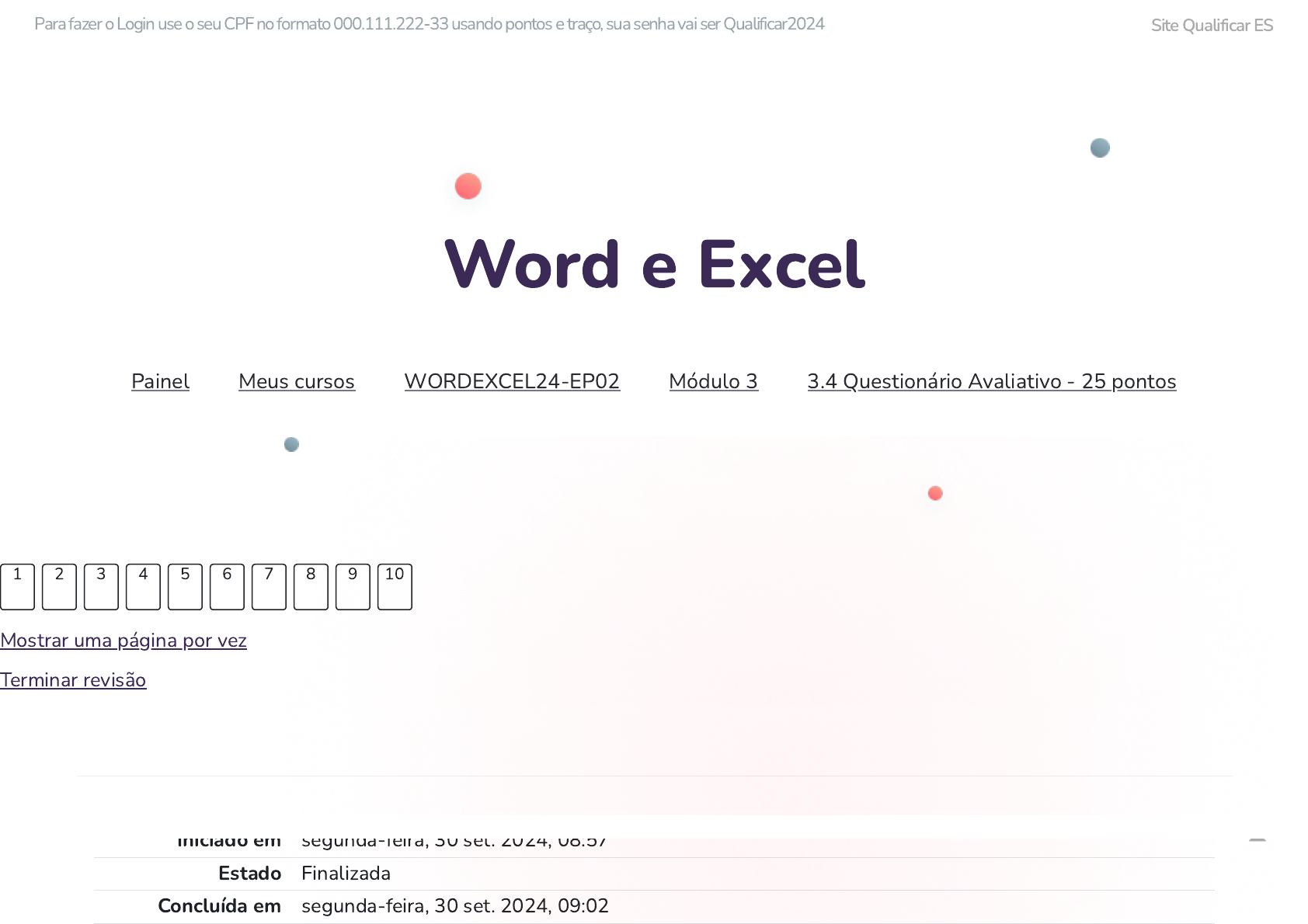 Mostrar uma página por vez Terminar revisão 1 2 3 4 5 6 7 8 9 10 Iniciado em segunda-feira, 30 set. 2024, 08:57 Estado Finalizada Concluída em segunda-feira, 30 set. 2024, 09:02 Painel Meus cursos WORDEXCEL24-EP02 Módulo 3 3.4 Questionário Avaliativo - 25 pontos Word e Excel Para fazer o Login use o seu CPF no formato 000.111.222-33 usando pontos e traço, sua senha vai ser Qualificar2024 Site Qualificar ES https://ava2.qualificar.es.gov.br/mod/quiz/review.php?attempt=96028&cmid=1881&showall=0 https://ava2.qualificar.es.gov.br/mod/quiz/view.php?id=1881 https://ava2.qualificar.es.gov.br/my/ https://ava2.qualificar.es.gov.br/my/courses.php https://ava2.qualificar.es.gov.br/course/view.php?id=100 https://ava2.qualificar.es.gov.br/course/view.php?id=100#section-3 https://ava2.qualificar.es.gov.br/mod/quiz/view.php?id=1881 https://qualificar.es.gov.br/ Questão 1 Completo Atingiu 2,50 de 2,50 Tempo empregado 4 minutos 50 segundos Avaliar 25,00 de um máximo de 25,00(100%) O que são fórmulas? Escolha uma opção: a. Fórmulas são expressões lógicas ou matemáticas criadas pelo usuário utilizando as 2 operações matemáticas mais a exponenciação. b. Fórmulas são expressões condicionais criadas pelo usuário utilizando as 5 operações matemáticas. c. Fórmulas são expressões lógicas ou matemáticas criadas pelo usuário utilizando as 3 operações matemáticas mais a exponenciação. d. Fórmulas são uma série de instruções lógicas ou matemáticas criadas pelo usuário a �m de realizar algum tipo de cálculo, que pode utilizar as 4 operações mais a exponenciação, de acordo com a �nalidade da fórmula. e. Fórmulas instruções condicionais criadas pelo usuário utilizando 1 operação matemática. Sua resposta está correta. Questão 2 Completo Atingiu 2,50 de 2,50 Dentro do Excel como são identi�cadas as colunas? Escolha uma opção: a. Letras b. Números c. Células d. Grá�cos e. Imagens Sua resposta está correta. Questão 3 Completo Atingiu 2,50 de 2,50 Qual é o símbolo matemático aceito pelo Excel para somar dois números? Escolha uma opção: a. + b. - c. / d. * e. > Sua resposta está correta. Questão 4 Completo Atingiu 2,50 de 2,50 Quais são os níveis de prioridade dos cálculos no Excel: Escolha uma opção: a. Prioridade 1 Multiplicação - Prioridade 2 Divisão - Prioridade 3 Adição e Subtração. b. Prioridade 1 Adição e Subtração - Prioridade 2 Multiplicação e Divisão - Prioridade 3 Exponenciação e Radiciação. c. Prioridade 1 Multiplicação e Divisão - Prioridade 2 Adição e Subtração Prioridade 3 Exponenciação e Radiciação. d. Prioridade 1 Exponenciação e Radiciação - Prioridade 2 Adição e Subtração Prioridade 3 Multiplicação e Divisão. e. Prioridade 1 Exponenciação e Radiciação - Prioridade 2 Multiplicação e Divisão - Prioridade 3 Adição e Subtração. Sua resposta está correta. Questão 5 Completo Atingiu 2,50 de 2,50 Excel é um software para criação e manutenção de: Escolha uma opção: a. Apresentação de Slides b. Grá�cos c. Documentos de texto d. Planilhas Eletrônicas e. Imagens Sua resposta está correta. Questão 6 Completo Atingiu 2,50 de 2,50 É cada quadrícula da planilha, a unidade de uma planilha na qual você pode inserir e armazenar dados. Escolha uma opção: a. Valor b. Número c. Grá�cos d. Célula e. Letra Sua resposta está correta. Questão 7 Completo Atingiu 2,50 de 2,50 Dentro do Excel como são identi�cadas as linhas? Escolha uma opção: a. Números b. Imagens c. Células d. Letras e. Grá�cos Sua resposta está correta. Questão 8 Completo Atingiu 2,50 de 2,50 Qual é o símbolo matemático aceito pelo Excel para multiplicar dois números? Escolha uma opção: a. + b. / c. > d. d. / e.