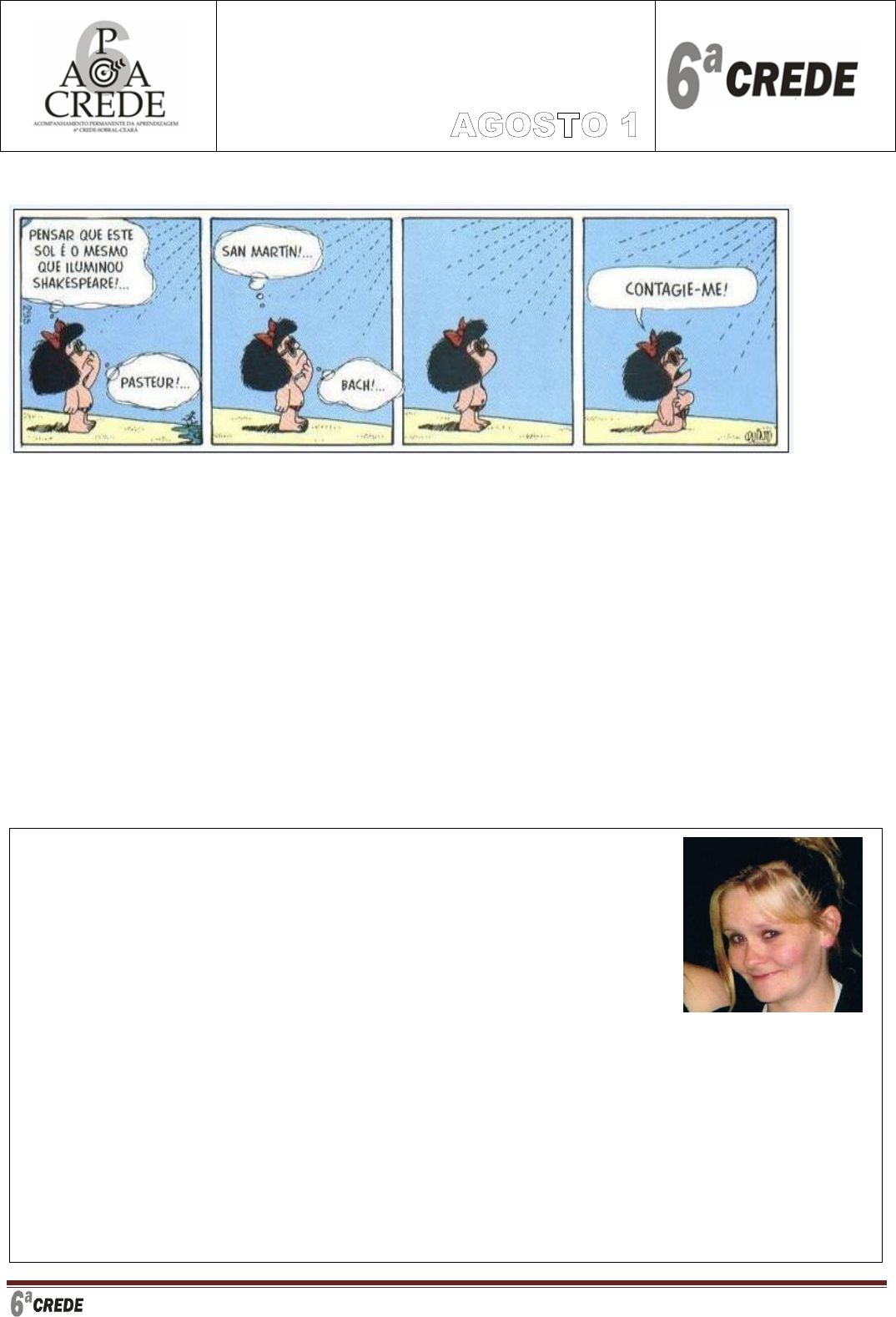 PORTUGUÊS – AGOSTO 1 3º ANO Página 1 Médico diz que consumo excessivo de Coca-Cola pode ter matado mulher. O consumo excessivo de Coca-Cola pode ter sido o motivo da morte da neozelandesa Natasha Harris, 30 anos, mãe de oito filhos. Segundo depoimentos, Harris bebia entre oito e dez litros de refrigerante por dia, o que pode ter contribuído com o ataque cardíaco que a levou à morte. De acordo com o jornal New Zealand Herald, o patologista Dan Mornin afirmou que ela teve arritmia cardíaca, mas também sofreu de hipocalemia. Segundo ele, esse problema de falta de potássio ocorre pelo consumo excessivo de refrigerantes. O companheiro de Natasha, Chris Hodgkinson, que está processando a Coca-Cola, disse que a mulher era viciada e ficava irritada quando não bebia o refrigerante. Ele também contou que ela já se sentia mal quase um ano antes de morrer e que vomitava pelo menos seis vezes por semana. O representante da Coca-Cola Oceania que estava no julgamento declarou que não existe nenhuma prova que confirme que o consumo do refrigerante resultou na morte de Harris. www.bol.com.br – acessado em 20/04/2012 – 16h15 Leia a tirinha e responda as questões 1 e 2. 1. Na tirinha acima, a postura de reflexão da personagem é indicada (A) pela cabeça mantida abaixada na chegada à praia no início da história. (B) pela posição de submissão ao se manter de joelhos perante o Sol. (C) pela mão no queixo enquanto pensa em grandes nomes da História. (D) pelo fato de a menina ter usado óculos escuros para olhar o Sol. (E) pelo silêncio dela, que apenas observa o Sol no 3º quadrinho da tira. 2. A ironia da tirinha está (A) na crítica aos personagens citados pela menina, que apenas foram iluminados pelo Sol. (B) na submissão da menina ao se ajoelhar e pedir para o Sol torná-la superior às outras pessoas. (C) na tentativa da personagem de dialogar com o Sol, que se manteve em silêncio. (D) no menosprezo da menina com as pessoas que não buscam a superação dos seus limites. (E) no pedido da menina para o Sol contagiá-la como aos personagens que ela mencionou. Leia o texto abaixo para responder as perguntas 3 a 6. PORTUGUÊS 3º ANO PORTUGUÊS – AGOSTO 1 3º ANO Página 2 3. Infere-se na leitura que “hipocalemia” é (A) a escassez de potássio no corpo. (B) batimento acelerado do coração. (C) excesso de potássio no corpo. (D) o consumo excessivo de uma droga. (E) um tipo de ataque cardíaco. 4. O tema central tratado nessa notícia é (A) A Coca-Cola Oceania declarou-se inocente da acusação. (B) A dependência de bebidas gera irritação e arritmia cardíaca. (C) Consumo excessivo de refrigerante pode ter matado mulher. (D) Não é possível beber mais de 2 litros de refrigerante por dia. (E) O companheiro de Natasha processará a Coca-Cola. 5. A palavra “companheiro”, nesse texto, significa (A) conhecido. (B) esposo. (C) médico. (D) parente. (E) vizinho. 6. O lugar onde aconteceram os fatos de que trata o texto (A) foi na Holanda. (B) foi na Inglaterra. (C) foi na Nova Zelândia. (D) foi no Brasil. (E) foram nos Estados Unidos. Leia o texto e responda as questões 7 a 12. 5 10 15 Texto 1: DOMINGO DE PÁSCOA Arthur Xexéo Tive uma educação, digamos assim, ecumênica. Fiz o primário em colégio leigo, cursei o ginásio numa escola católica e completei o científico num instituto protestante. E, se tem alguém aí do lado que não sabe o que é primário e científico, que pergunte para o seu avô, que deve regular comigo de idade. No científico, entre a primeira e a segunda aulas, todas as turmas se reuniam num auditório onde, durante o que era chamado de “assembleia” pastores pregavam sua fé lendo trechos do Novo Testamento. Eu aproveitava para completar o sono interrompido para estar na escola às sete da manhã. No primário nem sabia que em algumas instituições havia aulas de religião. No ginásio, aí, sim, os irmãos maristas me pegaram de jeito. Devo ter sido o pré-adolescente mais carola da carolice nacional. Aos domingos, não perdia uma missa das seis na Igreja de São Judas Tadeu. Era imbatível no concurso anual de redação sobre a vida do padre Marcelino Campagnat, era o único da família que não comia carne às sextas-feiras... quer dizer, único não. Do Rio, pelo telefone, minha avó, uma carola de velha cepa, controlava minhas tentações. XEXÉO, Arthur. In Revista Domingo, O Globo, 12 de abril de 2009 7. No texto, a expressão “deve regular comigo” (l. 4) tem o mesmo sentido de (A) concordava com as opiniões do avô. (B) controlava as intenções dos adolescentes. (C) discordava das ideias dos pastores. (D) foi educado da mesma forma que ele. (E) tinha uma idade semelhante a dele. PORTUGUÊS – AGOSTO 1 3º ANO Página 3 8. Infere-se que durante a “assembleia” o autor aproveitava para (A) escrevia redações. (B) frequentar a missa. (C) pregar a sua fé (D) retomar o sono perdido. (E) recuperar as atividades. 9. Esse texto é (A) uma autobiografia. (B) uma carta. (C) uma crônica. (D) uma notícia. (E) um conto. 10 No período “...que pergunte para o seu avô” (l. 4), a palavra destacada indica ideia de (A) adição. (B) causa. (C) conclusão. (D) condição. (E) explicação. 11. O trecho que indica interação direta entre locutor e interlocutor é (A) “Era imbatível no concurso anual de redação” (B) “No ginásio, aí, sim, os irmãos maristas me pegaram de jeito.” (C) “se tem alguém aí do lado que não sabe o que é primário” (D) “Tive uma educação, digamos assim, ecumênica.” (E) “todas as turmas se reuniam num auditório” 12. A palavra “carola” (l. 11) foi usada pelo autor por indicar uma pessoa que (A) era muito competitiva. (B) não gostava de seguir regras. (C) não ligava muito para religião. (D) nem sempre seguia doutrinas. (E) sempre cumpria os ritos católicos. Leia o texto e responda as questões 13 a 19. A MELHOR MANEIRA DE FAZER CRIANÇA EMAGRECER É EMAGRECER