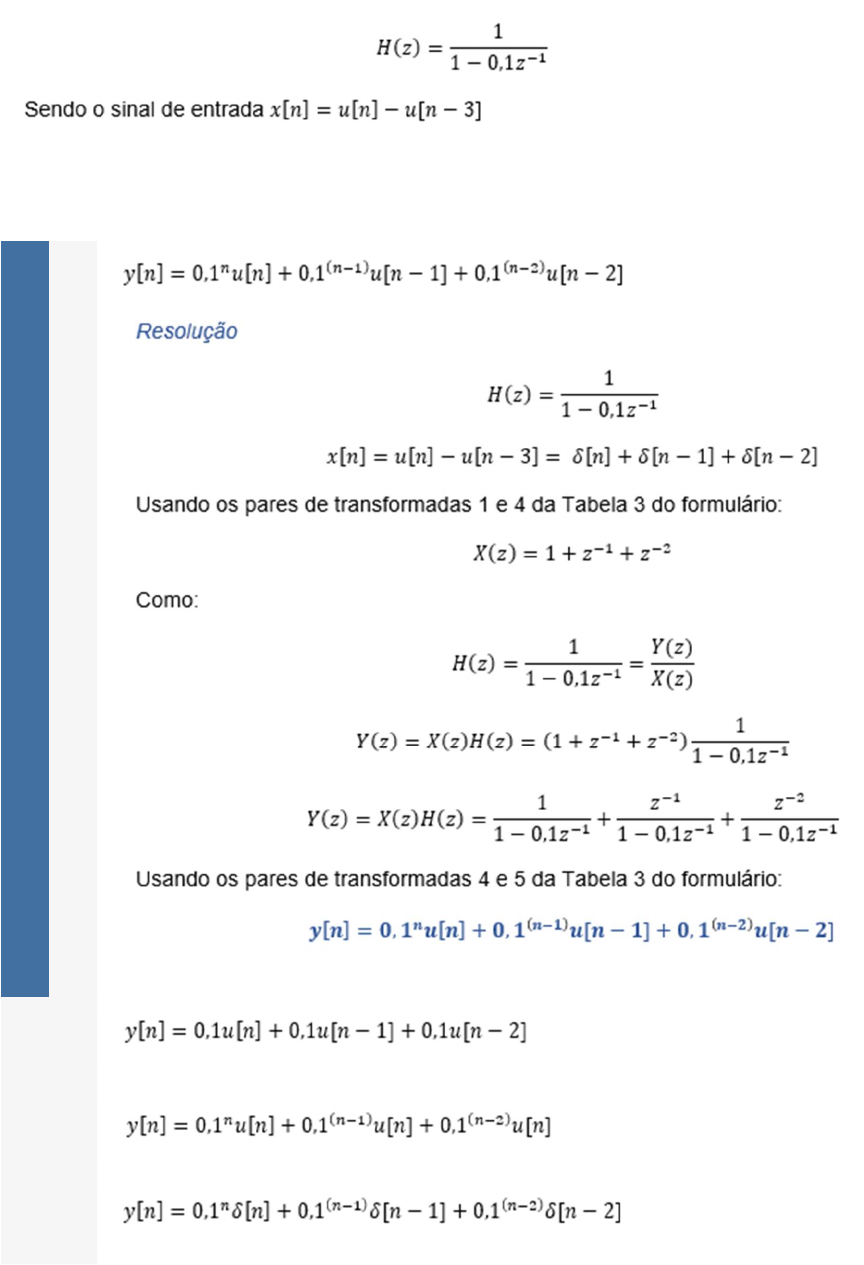 Questão 1/10 - Processamento Digital de Sinais A função do sistema de um sistema linear invariante no tempo é representada pela equação a seguir: Determine o sinal de saída Nota: 0.0Você não pontuou essa questão A B C D E Questão 2/10 - Processamento Digital de Sinais Sendo o sinal de entrada de um sistema: E o de saída (sequência lateral direita): A função de transferência do sistema (resposta em frequência do sistema) será: Nota: 0.0Você não pontuou essa questão A B C D E Questão 3/10 - Processamento Digital de Sinais Sendo Determinar y[n]=x[-n+2] Nota: 0.0Você não pontuou essa questão A B C D E Questão 4/10 - Processamento Digital de Sinais Em processamento de sinais e teoria de controle, a resposta ao impulso de um sistema dinâmico mostra o sinal de saída do mesmo quando é aplicado um impulso na entrada. Mas também é possivel dizer que a resposta ao impulso é a reação do sistema dinâmico como resposta a mudanças externas. Nos dois casos a resposta ao impulso descreve a reação do sistema à aplicação de um impulso na entrada em função do tempo. O mesmo sistema dinâmico apresenta uma resposta em frequência dada pela relação sinal de saída – sinal de entrada no domínio da frequência. Esta reposta determinará o comportamento do sistema para as diferentes frequências do sinal de entrada. Enquanto a resposta ao impulso do sistema está no domínio do tempo, a resposta em frequência está no domínio da frequência. Estas duas funções estão relacionadas pela transformada de Fourier em tempo discreto (DTFT). Portanto é possível calcular uma a partir da outra. A função a seguir representa a resposta em frequência de um sistema LIT: Aplicando DTFT determine a resposta ao impulso h[n] do sistema Nota: 0.0Você não pontuou essa questão A B C D E Questão 5/10 - Processamento Digital de Sinais Considerando um sistema cuja função é: O sistema é: Nota: 0.0Você não pontuou essa questão A Linear, invariante no tempo e sem memória B Sem memória, não linear e causal C Sem memória, linear e causal D Não linear, não causal e não estável E Não estável, causal e invariante no tempo Questão 6/10 - Processamento Digital de Sinais Um equipamento muito usado por guitarristas é a pedaleira. Este equipamento consegue processar o sinal de áudio dando ao som diferentes timbres e características específicas dependendo do tipo de música e da interpretação do músico. Existem vários efeitos que podem ser adicionados ao som da guitarra usando uma pedaleira, por exemplo wah-wah, reverb, delay, distorções, overdrive e outros. Existem vários tipos de pedais e eles podem ser pedais físicos (equipamentos eletrônicos), ou podem ser digitais, por exemplo algoritmos programados na CPU do amplificador para simular os efeitos dos pedais físicos. Estes últimos são sistemas projetados como filtros digitais, e esses filtros digitais têm que ter características específicas para que na saída o som tenha o efeito desejado. Um sistema de processamento de áudio é representado pela seguinte equação: Analise a função do sistema e verifique se ele é: I Não linear II Invariante no tempo III Estável IV Com memória V Anticausal Sobre o sistema, é correto o que se afirma em: Nota: 0.0Você não pontuou essa questão A I, II e III apenas B II, III e IV apenas C I, III e IV apenas D I, IV e V apenas E III, IV e V apenas Questão 7/10 - Processamento Digital de Sinais Considerando um sistema cuja função é: O sistema é: Nota: 0.0Você não pontuou essa questão A Não linear, invariante no tempo e sem memória B Com memória, linear e anticausal C Sem memória, não linear não estável D Não linear e estável E Não estável, causal e invariante no tempo Questão 8/10 - Processamento Digital de Sinais Um determinado sistema é definido pela seguinte equação de diferenças: Determine a resposta do sistema H(z) Nota: 0.0Você não pontuou essa questão A B C D E Questão 9/10 - Processamento Digital de Sinais Verificar se o sistema a seguir: é linear, causal e estável Nota: 0.0Você não pontuou essa questão A O sistema é não linear, causal e não estável. B O sistema é linear, causal e estável. C O sistema é não linear, causal e estável. D O sistema é não linear, anticausal e estável. E O sistema é não linear, não causal e estável. Questão 10/10 - Processamento Digital de Sinais Qualquer sinal para ser filtrado precisa passar por um determinado filtro cuja resposta em frequência vai determinar quais frequências do sinal vão ser filtradas. Para isto o sistema realiza uma convolução de sinais. Levando em conta que a resposta ao impulso do filtro é dada pela função h[n] e o sinal de entrada é x[n]. O número marcado é o valor correspondente a n=0. Qual seria a resposta y[n] deste sistema? Nota: 0.0Você não pontuou essa questão A B C D E