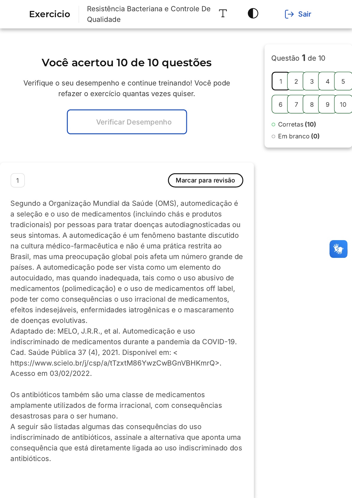 Você acertou 10 de 10 questões Verifique o seu desempenho e continue treinando! Você pode refazer o exercício quantas vezes quiser. Verificar Desempenho 1 Marcar para revisão Segundo a Organização Mundial da Saúde �OMS�, automedicação é a seleção e o uso de medicamentos (incluindo chás e produtos tradicionais) por pessoas para tratar doenças autodiagnosticadas ou seus sintomas. A automedicação é um fenômeno bastante discutido na cultura médico-farmacêutica e não é uma prática restrita ao Brasil, mas uma preocupação global pois afeta um número grande de países. A automedicação pode ser vista como um elemento do autocuidado, mas quando inadequada, tais como o uso abusivo de medicamentos (polimedicação) e o uso de medicamentos off label, pode ter como consequências o uso irracional de medicamentos, efeitos indesejáveis, enfermidades iatrogênicas e o mascaramento de doenças evolutivas. Adaptado de: MELO, J.R.R., et al. Automedicação e uso indiscriminado de medicamentos durante a pandemia da COVID�19. Cad. Saúde Pública 37 �4�, 2021. Disponível em:de Infecção Hospitalar �CCIH) tem como uma de suas principais diretrizes a investigação de surtos e a implementação de medidas de controle. Esta função é essencial para prevenir a disseminação de bactérias multirresistentes no ambiente hospitalar. A CCIH atua em nível hospitalar, sendo que cada unidade deve possuir sua própria A B C comissão para assegurar o controle e a disseminação de medidas preventivas. Além disso, a CCIH é responsável por realizar a educação continuada por meio de atualizações profissionais, determinar as normas e diretrizes para limpeza e desinfecção do ambiente hospitalar, realizar o isolamento do paciente positivo para uma superbactéria e realizar a vigilância epidemiológica. Portanto, a alternativa D é a correta, pois reflete uma das principais diretrizes da CCIH. 6 Marcar para revisão O uso indiscriminado dos antibióticos por instituições de saúde, pela população e em práticas agropecuárias tem contribuído para o aumento da resistência aos antibióticos. Em consequência ao aumento das infecções hospitalares associadas a estes instrumentos, o uso de antibióticos é intensificado, o que promove a seleção de bactérias resistentes neste ambiente. Adaptado de: IOC/FIOCRUZ. ROCHA, L. Pesquisadora fala sobre a resistência causada pelo uso indiscriminado de antibióticos. 2015. Disponível em: https://portal.fiocruz.br/noticia/pesquisadora-fala- sobre-resistencia-causada-pelo-uso-indiscriminado-de-antibioticos. Acesso em 03/02/2022. A disseminação de mecanismos de resistência acontece de forma rápida entre as bactérias, principalmente devido à presença de elementos genéticos móveis nas bactérias. Marque a alternativa que apresenta o(s) principal(is) elementos genéticos móveis presentes nas bactérias responsáveis pela disseminação rápida da resistência. Plasmídeos. Cromossomo. Bombas de efluxo. D E A B C Mutação. Polimixinas. Resposta correta Parabéns, você selecionou a alternativa correta. Confira o gabarito comentado! Gabarito Comentado Os plasmídeos são um dos elementos genéticos mais importantes que facilitam a disseminação de mecanismos de resistência. Eles são DNAs circulares independentes do genoma que carregam genes com vantagens para quem os possui, como genes de resistência aos antibióticos. Por outro lado, o cromossomo é o DNA essencial para a célula bacteriana, contendo todas as informações para sua sobrevivência. As bombas de efluxo são um mecanismo de resistência que extrai o antibiótico para fora da célula. As mutações são alterações que podem ocorrer em qualquer material genético, podendo gerar vantagens seletivas. As polimixinas, por sua vez, são uma classe de antibióticos. 7 Marcar para revisão Os beta-lactâmicos são um grupo grande e antigo de antibióticos, estão entre os mais consumidos no mundo por apresentar boa toxicidade seletiva ao inibir a parede celular bacteriana. Marque a alternativa que indica um beta-lactâmico. Ciprofloxacina Aminoglicosídeos Carbapenemas D E Sulfamida Polimixinas Resposta correta Parabéns, você selecionou a alternativa correta. Confira o gabarito comentado! Gabarito Comentado Os beta-lactâmicos são um grupo de antibióticos que incluem as penicilinas, cefalosporinas e suas gerações, carbapenemas e monobactâmicos. Eles atuam na parede celular das bactérias, inibindo sua formação e, consequentemente, levando à morte da bactéria. A alternativa correta é a "C", pois os carbapenemas são um tipo de beta-lactâmico. As outras alternativas representam diferentes classes de antibióticos: a ciprofloxacina é um representante da classe das fluoroquinolonas, que atua inibindo a replicação do DNA bacteriano; os aminoglicosídeos, como a amicacina e gentamicina, inibem a síntese de proteínas; a sulfamida, representada pelo sulfametoxazol-trimetropim, atua inibindo a síntese do ácido fólico; e as polimixinas, como a polimixina B e polimixina E, atuam a nível de membrana plasmática. 8 Marcar para revisão Segundo a OPAS, mais de 90% dos pacientes hospitalizados com COVID�19 nas Américas receberam um antimicrobiano, enquanto apenas 7% deles necessitaram desses medicamentos para tratar uma infecção secundária. Drogas como ivermectina, azitromicina e cloroquina também foram amplamente utilizadas, apesar das fortes evidências de que não apresentam benefícios contra a COVID�19. Vários países, incluindo Argentina, Uruguai, Equador, Guatemala e Paraguai, relataram aumentos nas infecções resistentes aos medicamentos. Um alerta epidemiológico recente da OPAS também mostra um aumento no surgimento de bactérias resistentes a antimicrobianos na região, como a azitromicina. A B C D E Adaptado de: Organização Pan-americana de saúde. Américas notificam aumento de infecções resistentes a medicamentos devido ao 