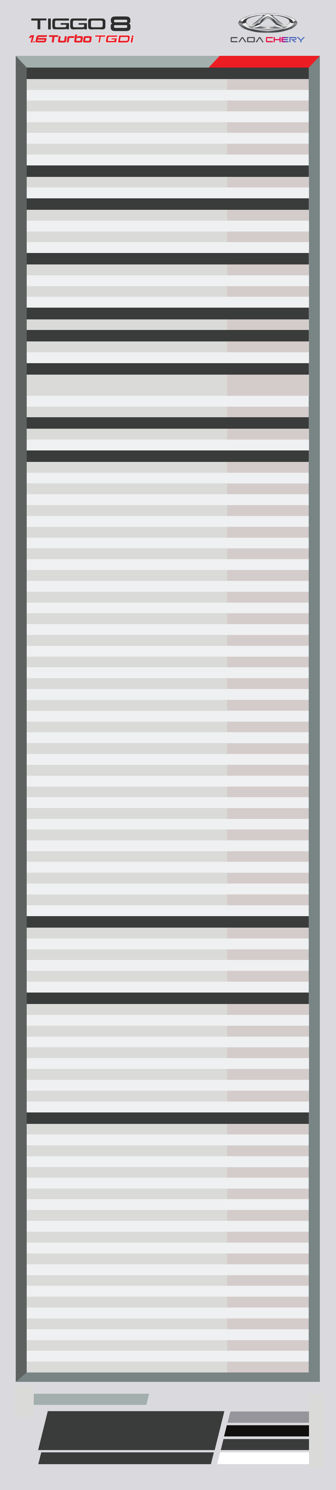 TXS MOTORIZAÇÃO SISTEMA DE TRANSMISSÃO PESOS E CAPACIDADES DIMENSÕES SISTEMA DE DIREÇÃO SUSPENSÃO SISTEMA DE FREIOS RODAS E PNEUS CONFORTO / CONVENIÊNCIA / TECNOLOGIA INTERIOR EXTERIOR ITENS DE SEGURANÇA Abertura do porta malas por sensor de aproximação Abertura e fechamento das portas à distância (Keyless) Abertura e fechamento do porta malas à distância (Keyless) Abertura e fechamento dos vidros "one touch" com função antiesmagamento Ar condicionado dual zone Banco do motorista com 6 ajustes elétricos Banco do passageiro dianteiro com 4 ajustes elétricos Bancos dianteiros com porta revistas Botão Start/Stop para partida sem chave Câmera de ré com guias dinâmicas de direção Câmera de visão 360° HD Carregador de celular por indução / Porta celular Central de multimídia touch screen de 10,25", Android Auto, Apple Car Play e bluetooth Coluna de direção regulável altura/profundidade (manual) Computador de bordo Console central frontal com apoio de braço e porta copos Descanso para pé (motorista) Direção elétrica (EPS) Entradas USB 2 no console central / 1 na parte traseira Faróis com acendimento automático Faróis com ajuste elétrico de altura Luz ambiente com opções de cores Luz de boas vindas "TIGGO" Luz de leitura nas 3 fileiras de bancos Modo de condução - SPORT/ECO Painel de instrumentos 12,3" LCD Para-sóis com espelho e iluminação (motorista e passageiro) Piloto Automático Porta copos / porta objetos Porta óculos Rebatimento elétrico dos retrovisores Retrovisor interno eletrocrômico Retrovisores externos com aquecimento (antiembaçante) e controle interno elétrico Saída de ar condicionado para segunda fileira Segunda fileira de bancos com apoio de braço Sensor de Chuva Sensor de estacionamento dianteiro Sensor de estacionamento traseiro Sistema de som com 8 alto-falantes Tapetes dianteiros e traseiros Teto solar panorâmico elétrico Tomada 12V no painel central Tipo 1.6L TGDi Número de cilindros 4 Nº de válvulas 16 Potência máxima (cv) 187 Torque máximo (kgfm) 28 Injeção Eletrônica Injeção direta de combustivel Tipo de ignição Eletrônico Combustível Gasolina Tipo 7 DCT Tração Dianteira Tanque de combustível (l) 51 Porta malas (7L/5L/2L) 193/889/1930 Número de Ocupantes Motorista + 6 Passageiros Peso em Ordem de Marcha (kg) 1.573 Comprimento do veículo (mm) 4.700 Largura do veículo (mm) 1.860 Altura do veículo (vazio) (mm) 1.705 Distância entre eixos (mm) 2.710 Direção Assistência elétrica progressiva Dianteira Independente, tipo MacPherson Traseira Independente, tipo Multilink Tipo Sistema de Freio com Antitravamento (ABS) e Distribuição Eletrônica da Força (EBD) Dianteiro Discos ventilados Traseiro Discos sólidos Rodas de Liga Leve Diamantada 18" Pneus 235/55 R18 ● ● ● ● ● ● ● ● ● ● ● ● ● ● ● ● ● ● ● ● ● ● ● ● ● ● ● ● ● ● ● ● ● ● ● ● ● ● ● ● ● ● Acabamento interior na cor preta Alavanca de câmbio automático "Joystick" Bancos com revestimento premium na cor preta Segunda fileira de bancos 60/40 rebatíveis Terceira fileira de bancos 50/50 rebatíveis Volante esportivo com formato em "D" multifuncional revestido em couro na cor preta ● ● ● ● ● ● Aerofólio traseiro Antena tipo barbatana Barras longitudinais decorativas no teto Faróis diurnos em LED (DRL) Faróis Full LED Grade frontal com detalhes em cromado Lanterna traseira de neblina Lanternas traseiras em LED Para-choques, maçanetas e espelhos retrovisores na cor do veiculo Saídas de escapamento cromada ● ● ● ● ● ● ● ● ● ● ABS + Distribuição Eletrônica da Força (EBD) Airbag de cortina Airbag frontal (motorista e passageiro) Airbag lateral (motorista e passageiro) Alarme antifurto (periférico) com acionamento pela chave Alças de segurança dianteira (passageiro) e traseiras (LD/LE) Alerta de tráfego cruzado traseiro (RCTA) Assistente de Aclives (HAC) Assistente de Descida (HDC) Aviso de cinto desatado sonoro (motorista e passageiro) Cintos de segurança de 3 pontos em todos os assentos Cintos de segurança dianteiros de 3 pontos com regulagem de altura Controle Eletrônico de Estabilidade (ESC) Encostos de cabeça com regulagem de altura (todos os assentos) Freio de estacionamento com acionamento eletrônico (EPB) Função AUTO HOLD Monitoramento de ponto cego (BSD) Sistema de Controle de Tração (TCS) Sistema de monitoramento de pressão nos pneus (TPMS) Sistema ISOFIX de fixação de cadeirinha infantil Travamento de portas dinâmico Travas de segurança para crianças na porta traseira Travas elétricas com comando centralizado ● ● ● ● ● ● ● ● ● ● ● ● ● ● ● ● ● ● ● ● ● ● ● Consulte disponibilidade de cores na rede de concessionários METÁLICAS CINZA BRANCO PRETO PRATA PEROLIZADAS CORES EXTERNAS