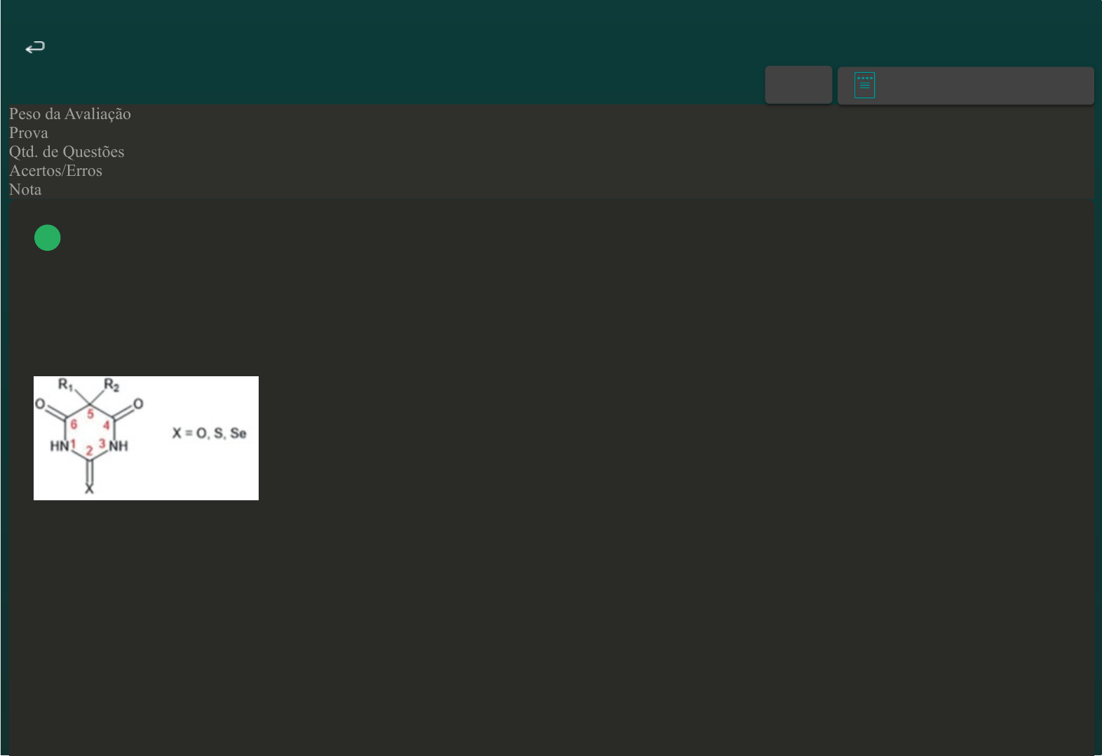 Prova Impressa GABARITO | Avaliação II - Individual (Cod.:988169) Peso da Avaliação 2,00 Prova 91333058 Qtd. de Questões 10 Acertos/Erros 10/0 Nota 10,00 O termo "relação estrutura-atividade" compreende o estudo dos efeitos que a estrutura química de um composto (ligante) pode causar durante sua interação com o receptor biológico e, consequentemente, racionalizar os principais fatores que governam esta interação. Quanto à relação estrutura- atividade dos barbitúricos, cuja estrutura geral encontra-se na figura a seguir, listam alguns parâmetros gerais: De acordo com a relação estrutura - atividade desta classe, analise as sentenças a seguir: I- Substituição de grupos alquílicos nas posições 1 e 3: diminuição do efeito hipnótico e aumento de propriedades estimulantes. II- Metilação de um átomo de oxigênio: aumenta a afinidade por lipídios, porém diminui o efeito. VOLTAR A+ Alterar modo de visualização 1 10/11/2024, 21:00 Avaliação II - Individual about:blank 1/12 III- Substituição na posição 2: átomo de enxofre (S) diminui a duração de ação, devido à rápida distribuição no tecido adiposo. IV- Substituição na posição 5 (R1 e R2): conferem lipossolubilidade e influenciam diretamente na duração do efeito. Esse efeito aumenta até que o número total de carbonos em R1 e R2 seja de oito carbonos. O grupo fenila nessa posição confere propriedades anticonvulsivantes. Assinale a alternativa CORRETA: A As sentenças I, II e III estão corretas. B As sentenças II e IV estão corretas. C As sentenças I, III e IV estão corretas. D As sentenças I, II e IV estão corretas. A epilepsia é um distúrbio neurológico muito comum, caracterizada por convulsões, que atinge aproximadamente 1% da população mundial. As crises convulsivas podem ser classificadas em: crises parciais, que acometem apenas uma parte do cérebro, e crises generalizadas, que envolvem todo o cérebro. Observe as fórmulas estruturais dos anticonvulsivantes clássicos a seguir: 2 10/11/2024, 21:00 Avaliação II - Individual about:blank 2/12 Assinale a alternativa CORRETA: A 1 - fenobarbital; 2 - carbamazepina; 3 - etossuximida; 4 - fenitoína; 5 - valproato. B 1 - carbamazepina; 2 - fenitoína; 3 - valproato; 4 - etossuximida; 5 - fenobarbital. C 1 - fenitoína; 2 - etossuximida; 3 - valproato; 4 - fenobarbital; 5 - carbamazepina. D 1 - fenitoína; 2 - valproato; 3 - etossuximida; 4 - carbamazepina; 5 - fenobarbital;. A monoamina oxidase (MAO) é uma das enzimas responsáveis pelo metabolismo de neurotransmissores importantes, como dopamina, noradrenalina e serotonina, sendo duas formas isozímicas (MAO-A e MAO-B). Essas isozimas diferem na especificidade do substrato, na distribuição nos tecidos e na estrutura primária. MAO-A é seletiva para noradrenalina e serotonina, enquanto MAO-B é seletiva para dopamina. Os usos terapêuticos dos inibidores da monoaminoxidase (IMAOs) incluem o tratamento da depressão não responsiva a outros antidepressivos, da doença de Parkinson e de ansiedade social e transtorno de pânico. Diante do exposto, sobre os exemplos de inibidores da monoaminoxidase (IMAOs), assinale a alternativa INCORRETA: 3 10/11/2024, 21:00 Avaliação II - Individual about:blank 3/12 A Selegilina. B Flufenazina. C Isocarboxazida. D Moclobemida. Os barbitúricos são fármacos que já foram amplamente utilizados como hipnóticos e sedativos e, embora apresentem mecanismo de ação semelhante aos benzodiazepínicos, foram substituídos por serem mais seguros. Quanto à farmacocinética, os barbitúricos podem ser classificados de acordo com a duração de efeito. Sobre o exposto, analise as sentenças a seguir: I- Efeito prolongado (4 a 12 h), como o fenobarbital e o metabarbital. II- Efeito intermediário (2 a 8 h), como o secbutabarbital e o amobarbital. III- Efeito curto (até 3 h), como o secobarbital e o pentobarbital. IV- Efeito ultracurto, como o hexobarbital e o tiopental. Assinale a alternativa CORRETA: 4 10/11/2024, 21:00 Avaliação II - Individual about:blank 4/12 A Somente a sentença IV está correta. B As sentenças I, II, III e IV estão corretas. C Somente a sentença III está correta. D Somente a sentença II está correta. Os antipsicóticos de primeira geração (também conhecidos como “antipsicóticos típicos” ou “convencionais”), atuam bloqueando os receptores D2 de modo estereosseletivo, sendo que a afinidade de ligação ao receptor se relaciona com a potência antipsicótica e a incidência de efeitos colaterais extrapiramidais (EEP). São exemplos de fármacos representantes desta classe: A Haloperidol e Clorpromazina. B Risperidona e Clozapina. C Clorpromazina e Risperidona. D Olanzapina e Quetiapina. 5 10/11/2024, 21:00 Avaliação II - Individual about:blank 5/12 Os benzodiazepínicos são fármacos que aumentam a afinidade de um importante neurotransmissor inibitório, o ácido γ-aminobutírico (GABA), pelos receptores GABAA. O receptor GABAA é um canal iônico dependente da voltagem, que contém diferentes subunidades, com destaque para as subunidades α, β e γ. Acerca da ação terapêutica dos fármacos, associe os itens, utilizando o código a seguir: I- Alprazolam. II- Clonazepam. III- Diazepam. IV- Flurazepam. V- Lorazepam. VI- Midazolam. ( ) Distúrbios convulsivos, tratamento adjuvante na mania aguda e em determinados distúrbios do movimento. ( ) Transtornos de ansiedade, medicação pré-anestésica. 6 10/11/2024, 21:00 Avaliação II - Individual about:blank 6/12 ( ) Transtornos de ansiedade, agorafobia. ( ) Insônia. ( ) Medicação pré-anestésica e intraoperatória. ( ) Transtornos de ansiedade, estado epiléptico, relaxamento muscular esquelético, pré-medicação anestésica. Assinale a alternativa que apresenta a sequência CORRETA: A I - III - IV - V - VI - II. B II - V - I - IV - VI - III. C I - II - IV - VI - V - III. D VI - IV - III - I - II - V. Os ISRSs são os antidepressivos de maior uso