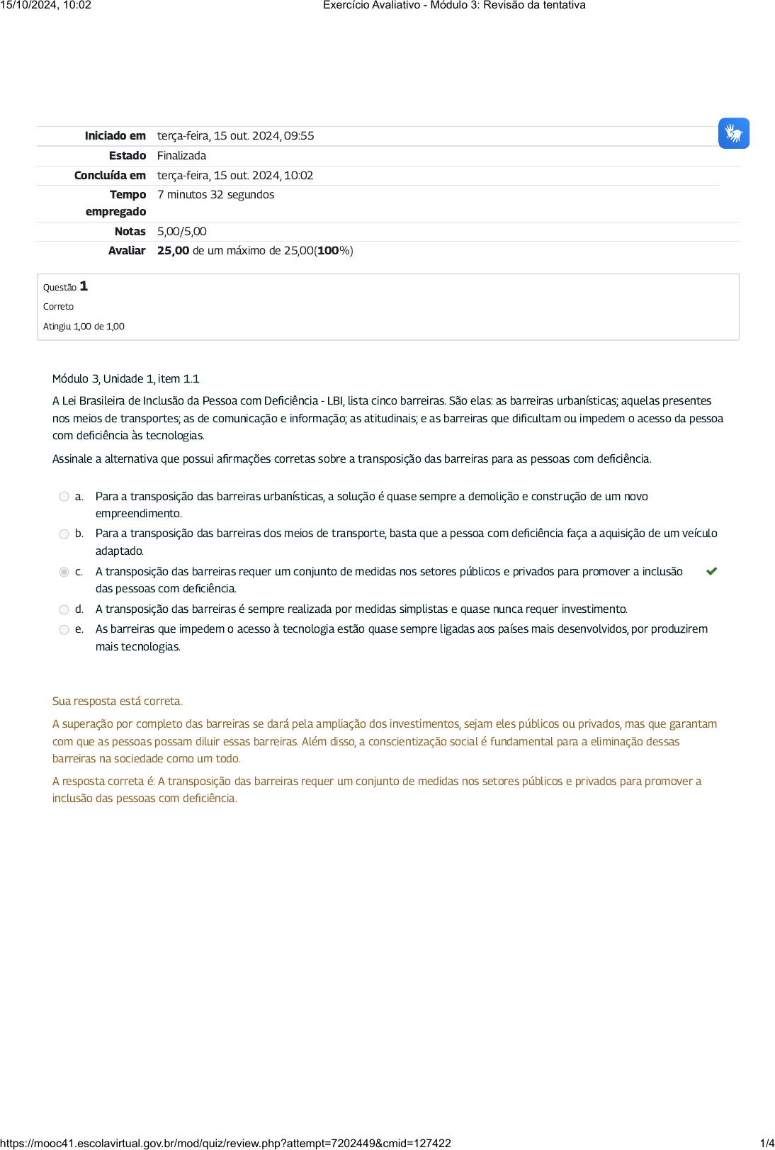 Iniciado em terça-feira, 15 out. 2024, 09:55 Estado Finalizada Concluída em terça-feira, 15 out. 2024, 10:02 Tempo empregado 7 minutos 32 segundos Notas 5,00/5,00 Avaliar 25,00 de um máximo de 25,00(100%) Questão 1 Correto Atingiu 1,00 de 1,00 Módulo 3, Unidade 1, item 1.1 A Lei Brasileira de Inclusão da Pessoa com De�ciência - LBI, lista cinco barreiras. São elas: as barreiras urbanísticas; aquelas presentes nos meios de transportes; as de comunicação e informação; as atitudinais; e as barreiras que di�cultam ou impedem o acesso da pessoa com de�ciência às tecnologias. Assinale a alternativa que possui a�rmações corretas sobre a transposição das barreiras para as pessoas com de�ciência. a. Para a transposição das barreiras urbanísticas, a solução é quase sempre a demolição e construção de um novo empreendimento. b. Para a transposição das barreiras dos meios de transporte, basta que a pessoa com de�ciência faça a aquisição de um veículo adaptado. c. A transposição das barreiras requer um conjunto de medidas nos setores públicos e privados para promover a inclusão das pessoas com de�ciência. d. A transposição das barreiras é sempre realizada por medidas simplistas e quase nunca requer investimento. e. As barreiras que impedem o acesso à tecnologia estão quase sempre ligadas aos países mais desenvolvidos, por produzirem mais tecnologias. Sua resposta está correta. A superação por completo das barreiras se dará pela ampliação dos investimentos, sejam eles públicos ou privados, mas que garantam com que as pessoas possam diluir essas barreiras. Além disso, a conscientização social é fundamental para a eliminação dessas barreiras na sociedade como um todo. A resposta correta é: A transposição das barreiras requer um conjunto de medidas nos setores públicos e privados para promover a inclusão das pessoas com de�ciência. 15/10/2024, 10:02 Exercício Avaliativo - Módulo 3: Revisão da tentativa https://mooc41.escolavirtual.gov.br/mod/quiz/review.php?attempt=7202449&cmid=127422 1/4 Questão 2 Correto Atingiu 1,00 de 1,00 Questão 3 Correto Atingiu 1,00 de 1,00 Módulo 3, Unidade 1, item 1.1 A lei 13.146, de 06 de julho de 2015, conhecida como LBI ou estatuto da pessoa com de�ciência, traz cinco barreiras para a comunidade e entre elas estão as barreiras atitudinais. Assinale a alternativa que possui a�rmações corretas sobre as barreiras atitudinais. a. As barreiras atitudinais se referem a atitudes ou comportamentos que impeçam ou prejudiquem a participação social da pessoa com de�ciência em igualdade de condições e oportunidades com as demais pessoas. b. As barreiras atitudinais são ações positivas realizadas pela sociedade e comunidade em geral como forma e ferramenta de inclusão. c. As barreiras atitudinais são aquelas relacionadas à altitude, assim, pessoas com de�ciência que residem em locais muito altos possuem di�culdade para respirar ou se locomover. d. As barreiras atitudinais estão relacionadas ao transporte, se complementam com as atitudes dos motoristas no trânsito. e. As barreiras atitudinais se referem às questões das cidades, pois há cidades com arquiteturas hostis aos moradores de rua, não permitindo que utilizem os espaços públicos com a instalação de pedras embaixo dos viadutos por exemplo. Sua resposta está correta. As barreiras atitudinais se referem a “atitudes ou comportamentos que impeçam ou prejudiquem a participação social da pessoa com de�ciência em igualdade de condições e oportunidades com as demais pessoas” (IFPB, 2022). Para isso a legislação deve ser imposta e respeitada, e a conscientização social deve ser abordada meio de políticas públicas conscientizadoras. A resposta correta é: As barreiras atitudinais se referem a atitudes ou comportamentos que impeçam ou prejudiquem a participação social da pessoa com de�ciência em igualdade de condições e oportunidades com as demais pessoas. Módulo 3, Unidade 2, item 2.1 A comunidade das pessoas com de�ciência é plural, e a forma de interação dependerá de diversas questões que extrapolam exclusivamente a de�ciência. Assinale a alternativa que possui uma prática não recomendada ao interagir com uma pessoa com de�ciência. a. Ao interagir com as pessoas com baixa mobilidade ou em cadeira de rodas evite acelerar o passo. b. Ao interagir com a pessoa com de�ciência, se achar que está precisando de ajuda, se antecipe e ajude ela antes mesmo de perguntar. c. Ao se comunicar com uma pessoa Surda, recomenda-se tocar levemente no braço para iniciar uma conversa. d. Para comunicar-se com a pessoa Surda, sempre mantenha contato visual, isto possibilita aqueles que fazem leitura labial. e. Se tiver di�culdade de entender, peça que repita. Se necessário comunique por escrito. As atitudes, assim, incluem as pessoas no meio e não as excluem ou as marginalizam. Sua resposta está correta. Trate o outro sempre com respeito, não ignore, ninguém gosta de ser ignorado, muito menos uma pessoa com de�ciência. Ofereça a ajuda, mas só ajude se for convidado a ajudar. A resposta correta é: Ao interagir com a pessoa com de�ciência, se achar que está precisando de ajuda, se antecipe e ajude ela antes mesmo de perguntar. 15/10/2024, 10:02 Exercício Avaliativo - Módulo 3: Revisão da tentativa https://mooc41.escolavirtual.gov.br/mod/quiz/review.php?attempt=7202449&cmid=127422 2/4 Questão 4 Correto Atingiu 1,00 de 1,00 Questão 5 Correto Atingiu 1,00 de 1,00 Módulo 3, Unidade 2, item 2.3 Sobre a oferta de vagas de emprego para as pessoas com de�ciência. Assinale a alternativa que possui uma prática recomendada para ofertas de vagas de emprego e seleção de uma pessoa com de�ciência. a. Ao interagir com as pessoas com baixa mobilidade ou em cadeira de rodas evite acelerar o passo. b. Ao interagir com a pessoa com de�ciência, se achar que está precisando d