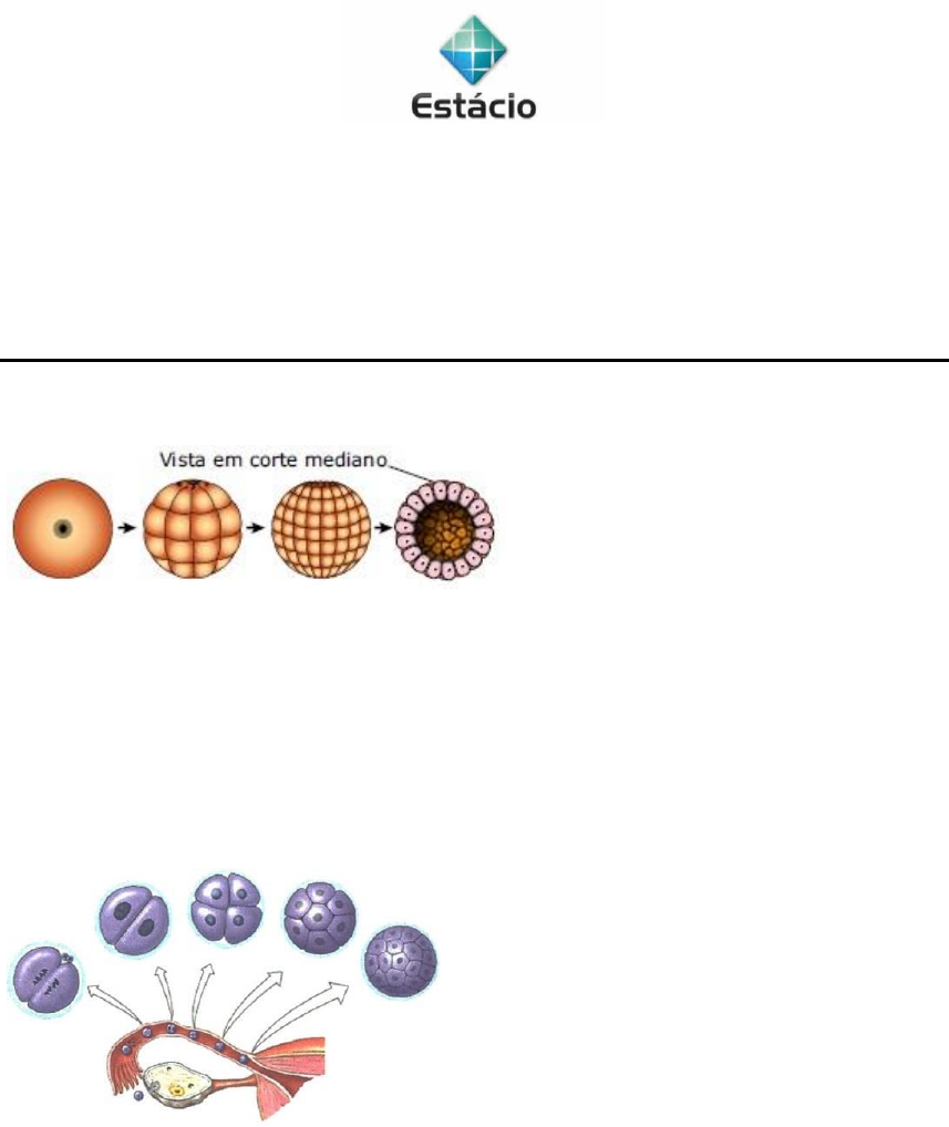 Centro Universitário Estácio de Sá – Juiz de Fora /MG Atividades revisionais 2024.1 Disciplina: Embriologia e Histologia Professor: Dr Bruno Esteves Conde Monitora: Michele Souza Sangy 1) A figura mostra o desenvolvimento inicial de um animal: Pela figura, o desenvolvimento foi mostrado até a fase de a) zigoto. b) mórula. c) gástrula. d) blástula. e) nêurula. 2) ) Analise a figura a seguir e marque a alternativa correta. a) A neurulação, quando se acentuam ainda mais o crescimento e diferenciação celular, com a formação do mesoderma e de outras estruturas. b) O processo de segmentação ou clivagem, que é a série de divisões mitóticas a partir do zigoto, resultando na formação da mórula. c) A implantação ou nidação, que é a fixação à parede do útero, dando início ao desenvolvimento intrauterino do embrião. d) A gastrulação, que se caracteriza por acentuado crescimento e diferenciação das células em tecidos ou folhetos embrionários, resultando na gástrula. 3) Considere os esquemas, numerados de 1 a 6, que mostram os diferentes estágios que ocorrem durante o processo de clivagem. Observe que eles não estão na sequência correta de acontecimentos. Centro Universitário Estácio de Sá – Juiz de Fora /MG Em qual alternativa o desenvolvimento embrionário está em ordem sequencial totalmente correta? a) 3 - 6 - 1 - 4 - 5 - 2. b) 5 - 3 - 1 - 4 - 6 - 2. c) 3 - 5 - 2 - 1 - 6 - 4. d) 1 - 3 - 5 - 6 - 4 - 2. e) 3 - 1 - 5 - 2 - 6 - 4. 4) O desenvolvimento embrionário é diversificado entre os diferentes grupos animais, e ocorre, de maneira geral, em três fases consecutivas. Assinale a alternativa correta quanto ao desenvolvimento embrionário dos anfioxos. a) A organogênese é a fase em que o arquêntero, ou intestino primitivo, é formado a partir da blastocele. b) A gastrulação é o processo de formação dos órgãos, sendo possível visualizar o tubo neural e o intestino, ao final dessa fase. c) A organogênese é o processo de transformação da blástula em gástrula. d) A segmentação é um processo em que o zigoto sofre clivagens (divisões), originando os blastômeros. e) A neurulação é o início da formação dos folhetos embrionários denominados ectoderme e endoderme, a partir da gástrula. 5) Observe o esquema que representa parte do sistema reprodutor feminino. Momentos após a ejaculação, vários espermatozoides percorrem a mucosa do útero e dirigem-se para uma das trompas. Parte desses espermatozoides encontra o óvulo e libera enzimas que enfraquecem as barreiras que o envolvem. Um espermatozoide entra em contato com a superfície do óvulo, e as membranas celulares e os núcleos de ambos se fundem. Centro Universitário Estácio de Sá – Juiz de Fora /MG a) Quais são os fenômenos ocorridos em I e II, respectivamente? b) Qual o nome da fase do desenvolvimento embrionário representado em III? E qual o processo de divisão celular ocorrido até a implantação observada em IV? 6) No desenvolvimento embrionário de certa espécie,um embrião de 30 horas é constituído por centenas de pequenas células que limitam uma cavidade preenchida por um líquido. Isto significa que, nesse intervalo de tempo, o embrião terminou a fase de: a) clivagem e chegou à fase de mórula. b) mórula e chegou à fase de blástula. c) mórula e chegou à fase de gástrula. d) blástula e chegou à fase de gástrula. e) blástula e chegou à fase de clivagem 7) Um embrião esférico, constituído por uma única camada de pequenas células que circunda uma cavidade preenchida por um líquido, está na fase de: a) zigoto. b) mórula. c) gástrula. d) nêurula. e) blástula. 8) Nos seres humanos, por volta do quarto ou quinto dia de desenvolvimento, observa-se a formação de uma cavidade cheia de líquido no embrião. O surgimento dessa cavidade marca o início da fase de: a) gástrula. b) clivagem. c) nêurula. d) blástula. e) feto. 9) O momento da implantação do embrião no útero ocorre aproximadamente: a) 3 dias após a fecundação no estágio de mórula. b) 5 dias após a fecundação no estágio de gástrula. c) 6 dias após a fecundação no estágio de blastocisto. d) 12 dias após a fecundação no estágio de blástula. e) 2 dias após a fecundação no estágio de mórula. 10) O desenvolvimento embrionário corresponde a todas as transformações que o zigoto sofre até que se torne um indivíduo. Uma das fases desse desenvolvimento caracteriza-se pela ocorrência de diversas divisões e o surgimento de uma estrutura chamada blastocisto. Entre as alternativas a seguir, marque aquela que apresenta corretamente o nome dessa fase. a) Gastrulação. b) Neurulação. c) Segmentação. d) Organogênese. e) NDA 11) Na fase de gastrulação ocorre uma importante etapa do desenvolvimento embrionário. Marque a alternativa que apresenta essa etapa: Centro Universitário Estácio de Sá – Juiz de Fora /MG a) Na gastrulação, ocorre a formação da mórula, um grupo maciço de células. b) Na gastrulação, ocorre a fixação do embrião no útero da mulher. c) Na gastrulação, são formados os folhetos germinativos. d) Na gastrulação, forma-se o tubo neural. e) Na gastrulação, todos os órgãos do embrião formam-se. 12) No final do processo de desenvolvimento embrionário, observa-se a formação de tecidos e órgãos. Essa fase é conhecida como: a) Gastrulação. b) Clivagem c) Segmentação. d) Organogênese. 13) Após a fecundação do óvulo pelo espermatozoide, é formado o zigoto, que passará por sucessivas etapas de divisões mitóticas e diferenciação celular, até formar um indivíduo propriamente dito. Esses eventos são denominados embriogênese, ou desenvolvimento embrionário, e suas etapas são: segmentação, gastrulação e organogênese. As figuras a seguir mostram algumas fases do desenvolvimento embrionário humano. A formação da blástula, fase que marca o término da segmentação e antecede a gastrulação,