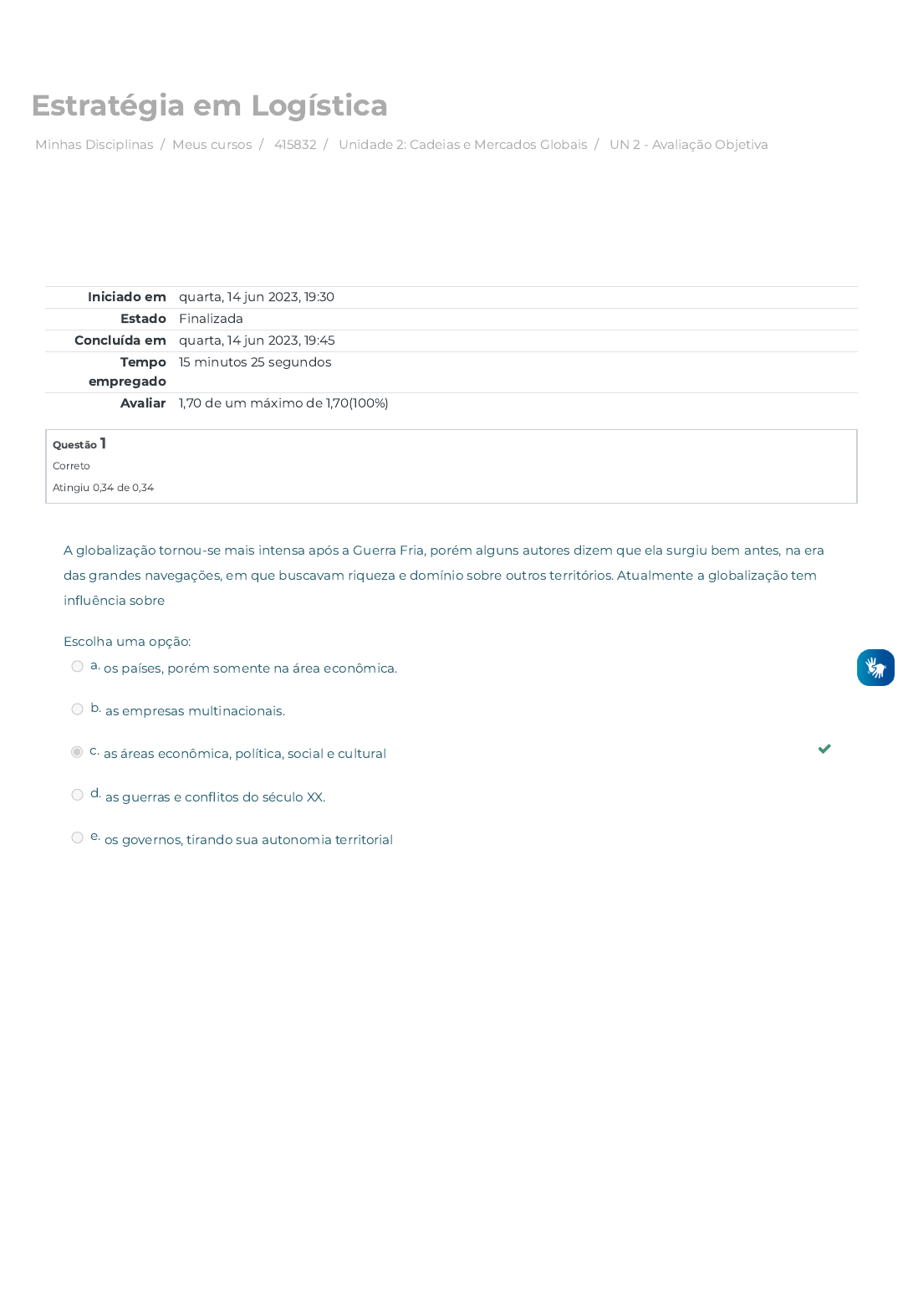 Minhas Disciplinas / Meus cursos / 415832 / Unidade 2: Cadeias e Mercados Globais / UN 2 - Avaliação Objetiva Estratégia em Logística Iniciado em quarta, 14 jun 2023, 19:30 Estado Finalizada Concluída em quarta, 14 jun 2023, 19:45 Tempo empregado 15 minutos 25 segundos Avaliar 1,70 de um máximo de 1,70(100%) Questão 1 Correto Atingiu 0,34 de 0,34 A globalização tornou-se mais intensa após a Guerra Fria, porém alguns autores dizem que ela surgiu bem antes, na era das grandes navegações, em que buscavam riqueza e domínio sobre outros territórios. Atualmente a globalização tem in�uência sobre Escolha uma opção: a. os países, porém somente na área econômica. b. as empresas multinacionais. c. as áreas econômica, política, social e cultural d. as guerras e con�itos do século XX. e. os governos, tirando sua autonomia territorial https://avap.multivix.edu.br/my/ https://avap.multivix.edu.br/course/view.php?id=20133 https://avap.multivix.edu.br/course/view.php?id=20133§ion=3 https://avap.multivix.edu.br/mod/quiz/view.php?id=1310818 Questão 2 Correto Atingiu 0,34 de 0,34 Questão 3 Correto Atingiu 0,34 de 0,34 Apesar do grande �uxo de mercadorias trocadas entre países, podem existir barreiras que impedem a importação de produtos estrangeiros para garantir a proteção dos produtores nacionais. Como exemplo de uma barreira podemos citar Escolha uma opção: a. os documentos de embarque b. os contratos de câmbio c. as �liais no país importador d. os transportes e. a exigência de conteúdo local Entre as vantagens do livre comércio, estão o aumento da produção, do consumo e do bem-estar dos cidadãos residentes nos países que participam do bloco formado, porém mesmo com o objetivo comum de aumentar o desenvolvimento econômico, há várias di�culdades e são formados diversos tipos de blocos com níveis diferentes de integração. São exemplos dos diversos tipos de relação comercial entre os países Escolha uma opção: a. a união bilateral b. a união dos meios de produção e zona de comércio c. a união aduaneira e acordo setorial d. a união total e mercado comum e. a união empresarial e tarifária Questão 4 Correto Atingiu 0,34 de 0,34 Questão 5 Correto Atingiu 0,34 de 0,34 Com a transformação das relações comerciais e a globalização cada vez mais presente em todas as áreas da sociedade, são necessárias operações diferenciadas no �uxo de mercadorias e informações. Esse dinamismo exige gestão de ponta a ponta da cadeia de suprimentos, ou seja, do fornecedor ao cliente. Neste cenário, identi�que algumas das características da cadeia de suprimentos integrada: Escolha uma opção: a. Foco em processos internos e externos e empresas parceiras terceirizadas. b. Mão de obra quali�cada e uso de empresas próprias. c. Uso de indicadores de desempenho e gestão dos processos internos. d. Uso de tecnologia e gestão de operações isoladas. e. Uso de frota própria e adoção de qualidade total. Com o �m da II Guerra Mundial, foram criados o FMI (Fundo Monetário Internacional), o BIRD (Banco Internacional de Reconstrução e Desenvolvimento) e o GATT (Acordo Geral sobre Tarifas e Comércio), os países começaram a recuperação econômica e era fundamental aumentar o comércio e o desenvolvimento econômico. O dólar americano se tornou mais forte e passou a ser a moeda de referência para muitos países. Uma das preocupações do GATT era Escolha uma opção: a. evitar impostos na importação de produtos em mercados subdesenvolvidos b. propor regras e normas no comércio internacional e reduzir barreiras para que houvesse mais igualdade entre os países. c. regulamentar as transferências �nanceiras geradas no comércio internacional. d. reduzir a pobreza e garantir o desenvolvimento com equidade em todos os países e. promover a liberdade e a paz entre os países. ◀ Conteúdo online Seguir para... Conteúdo online ▶ https://avap.multivix.edu.br/mod/scorm/view.php?id=1310817&forceview=1 https://avap.multivix.edu.br/mod/scorm/view.php?id=1310819&forceview=1
