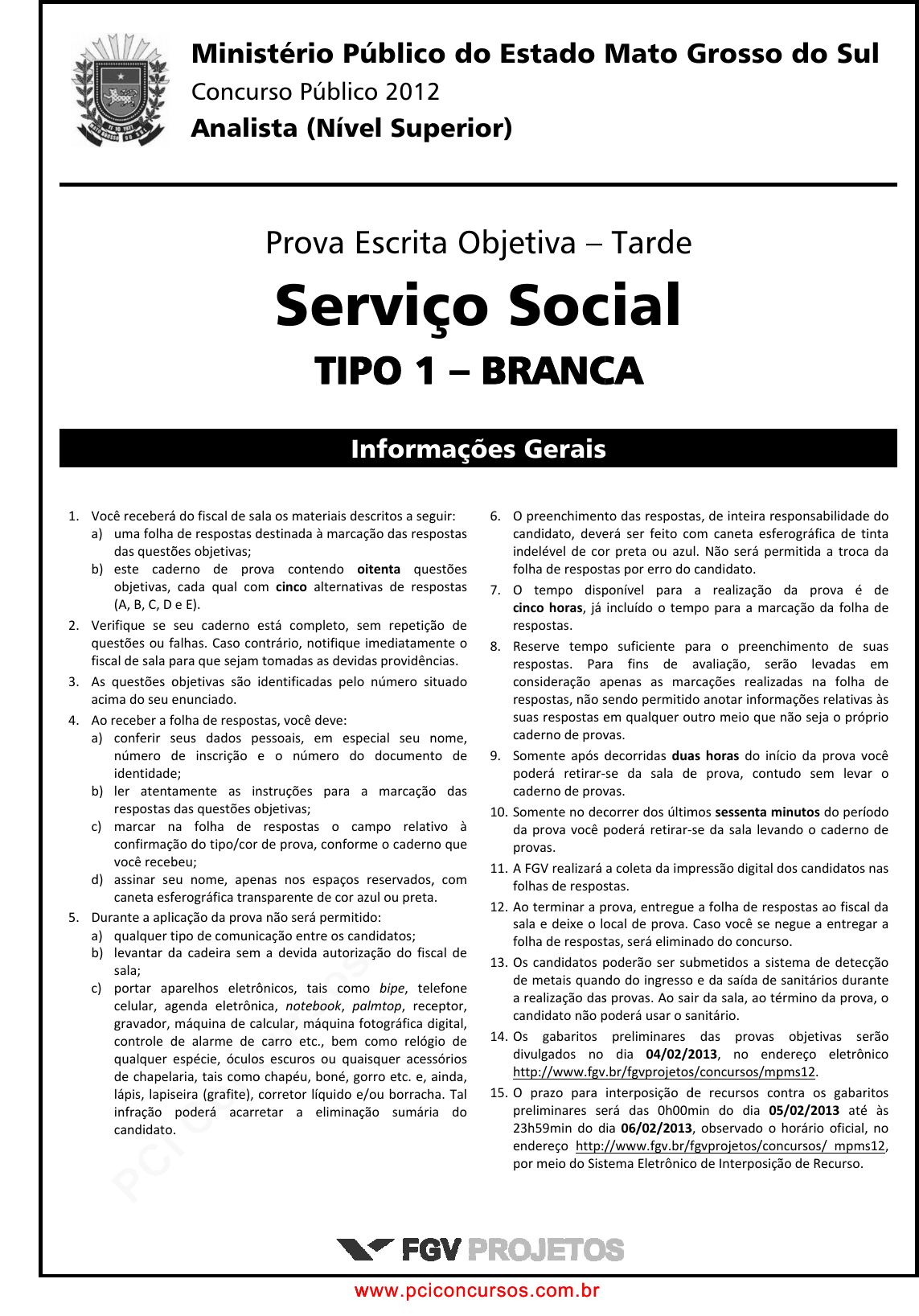pcimarkpci MDAwMDowMDAwOjAwMDA6MDAwMDowMDAwOmZmZmY6YzgwOTo0MzQ5:V2VkLCAwNiBOb3YgMjAyNCAxNjowNToxOSAtMDMwMA== www.pciconcursos.com.br 1. 2. 3. 4. 5. Você receberá a) uma folha das questõ b) este cad objetivas, (A, B, C, D Verifique se questões ou f fiscal de sala p As questões o acima do seu e Ao receber a f a) conferir s número d identidade b) ler atenta respostas c) marcar n confirmaç você receb d) assinar se caneta esf Durante a apli a) qualquer t b) levantar d sala; c) portar ap celular, ag gravador, controle d qualquer de chapela lápis, lapis infração candidato Minis Concu Analis á do fiscal de sa de respostas d ões objetivas; erno de pro cada qual com e E). seu caderno e falhas. Caso co para que sejam objetivas são i enunciado. folha de respos seus dados p de inscrição e e; amente as in das questões o na folha de ão do tipo/cor beu; eu nome, apen ferográfica tran icação da prova tipo de comuni da cadeira sem parelhos eletrô genda eletrôni máquina de ca de alarme de espécie, óculos aria, tais como seira (grafite), c poderá acarr . stério P rso Públ sta (Nív Prova Se TI ala os materiais destinada à ma ova contendo m cinco altern está completo ntrário, notifiq tomadas as de identificadas p tas, você deve: essoais, em e e o número nstruções para objetivas; respostas o de prova, conf nas nos espaç nsparente de co a não será perm cação entre os m a devida auto ônicos, tais co ica, notebook, alcular, máquin carro etc., be s escuros ou q o chapéu, boné corretor líquido etar a elimin Público ico 2012 vel Sup Escrit rviç PO 1 Inform s descritos a seg rcação das resp oitenta que nativas de resp , sem repetiçã ue imediatame evidas providên elo número si : especial seu n do document a a marcação campo relati forme o cadern os reservados, or azul ou preta mitido: candidatos; orização do fisc omo bipe, tel palmtop, rece na fotográfica d m como relóg quaisquer aces , gorro etc. e, a o e/ou borrach nação sumári o do Es 2 perior) a Obje ço S – BR mações guir: postas estões postas ão de ente o cias. tuado nome, to de o das ivo à no que , com a. cal de efone eptor, digital, gio de sórios ainda, ha. Tal a do 6. O c in fo 7. O c re 8. R re c re s c 9. S p c 10. S d p 11. A fo 12. A s fo 13. O d a c 14. O d h 15. O p 2 e p stado etiva – Soc RANC Gerais O preenchiment andidato, deve ndelével de co olha de respost O tempo disp inco horas, já espostas. Reserve tempo espostas. Par onsideração a espostas, não s uas respostas e aderno de prov Somente após d poderá retirar‐ aderno de prov Somente no dec da prova você p provas. A FGV realizará olhas de respos Ao terminar a p ala e deixe o lo olha de respost Os candidatos p de metais quan a realização das andidato não p Os gabaritos divulgados no http://www.fgv O prazo para preliminares se 23h59min do d endereço http:/ por meio do Sist Mato G Tarde cial CA s to das resposta erá ser feito co r preta ou azu tas por erro do ponível para incluído o tem o suficiente p ra fins de apenas as ma sendo permitid em qualquer ou vas. decorridas dua se da sala de vas. correr dos últim poderá retirar‐ a coleta da imp stas. prova, entregue ocal de prova. tas, será elimin poderão ser su do do ingresso s provas. Ao sa poderá usar o sa preliminares dia 04/02/2 .br/fgvprojetos interposição d erá das 0h00m ia 06/02/2013 //www.fgv.br/f tema Eletrônico Grosso as, de inteira re om caneta esfe ul. Não será pe candidato. a realização mpo para a mar para o preenc avaliação, se rcações realiza o anotar inform utro meio que as horas do iní e prova, cont mos sessenta m se da sala leva pressão digital d e a folha de res Caso você se n ado do concurs ubmetidos a sis o e da saída de ir da sala, ao té anitário. das provas 2013, no end s/concursos/mp de recursos co min do dia 05 3, observado o fgvprojetos/con o de Interposiçã o do Su esponsabilidade erográfica de t ermitida a troca da prova é rcação da folha chimento de s rão levadas adas na folha mações relativa não seja o pró ício da prova v udo sem leva minutos do perí ando o caderno dos candidatos spostas ao fisca negue a entreg so. stema de detec sanitários dura érmino da prov objetivas se dereço eletrô pms12. ontra os gabar 5/02/2013 até horário oficial ncursos/ mpm ão de Recurso. ul e do tinta a da de a de suas em de as às óprio você ar o íodo o de s nas al da gar a cção ante va, o erão nico ritos é às , no s12, www.pciconcursos.com.br www.pciconcursos.com.br www.pciconcursos.com.br www.pciconcursos.com.br pcimarkpci MDAwMDowMDAwOjAwMDA6MDAwMDowMDAwOmZmZmY6YzgwOTo0MzQ5:V2VkLCAwNiBOb3YgMjAyNCAxNjowNToxOSAtMDMwMA== www.pciconcursos.com.br Ministério Público do Mato Grosso do Sul – MPMS FGV ‐ Projetos Analista de Nível Superior Serviço Social (Tarde) – Tipo 1 Cor Branca – Página 2 Língua Portuguesa Texto I Consumo impróprio? Não existe, provavelmente porque seria inútil, um levantamento sobre formas e maneiras de combater o tráfico e o uso de drogas no Brasil. A proposta mais recente, que deve ser votada pelo Congresso em fevereiro, tem defensores e críticos. Se transformada em lei, criará a internação compulsória em comunidades terapêuticas para quem for apanhado com drogas. Alguns adversários acham que é castigo excessivo; os que a defendem sustentam que é isso mesmo que a sociedade deseja, mas não há provas disso. O principal problema parece ser a dificuldade de distinguir entre viciados e traficantes. Uma especialista da ONU, Ilona Szabo, lembra que a quantidade de drogas em poder do cidadão não prova coisa alguma: apenas cria para o traficante a necessidade de ter estoques do produto escondidos e só levar consigo pequenas quantidades de cada vez. Nada mais simples. Os números da repressão são pouco animadores. Uma pesquisa recente mostrou que, num período de um ano e meio, 66% dos presos com drogas eram réus primários, e quase metade carregava menos de cem g
