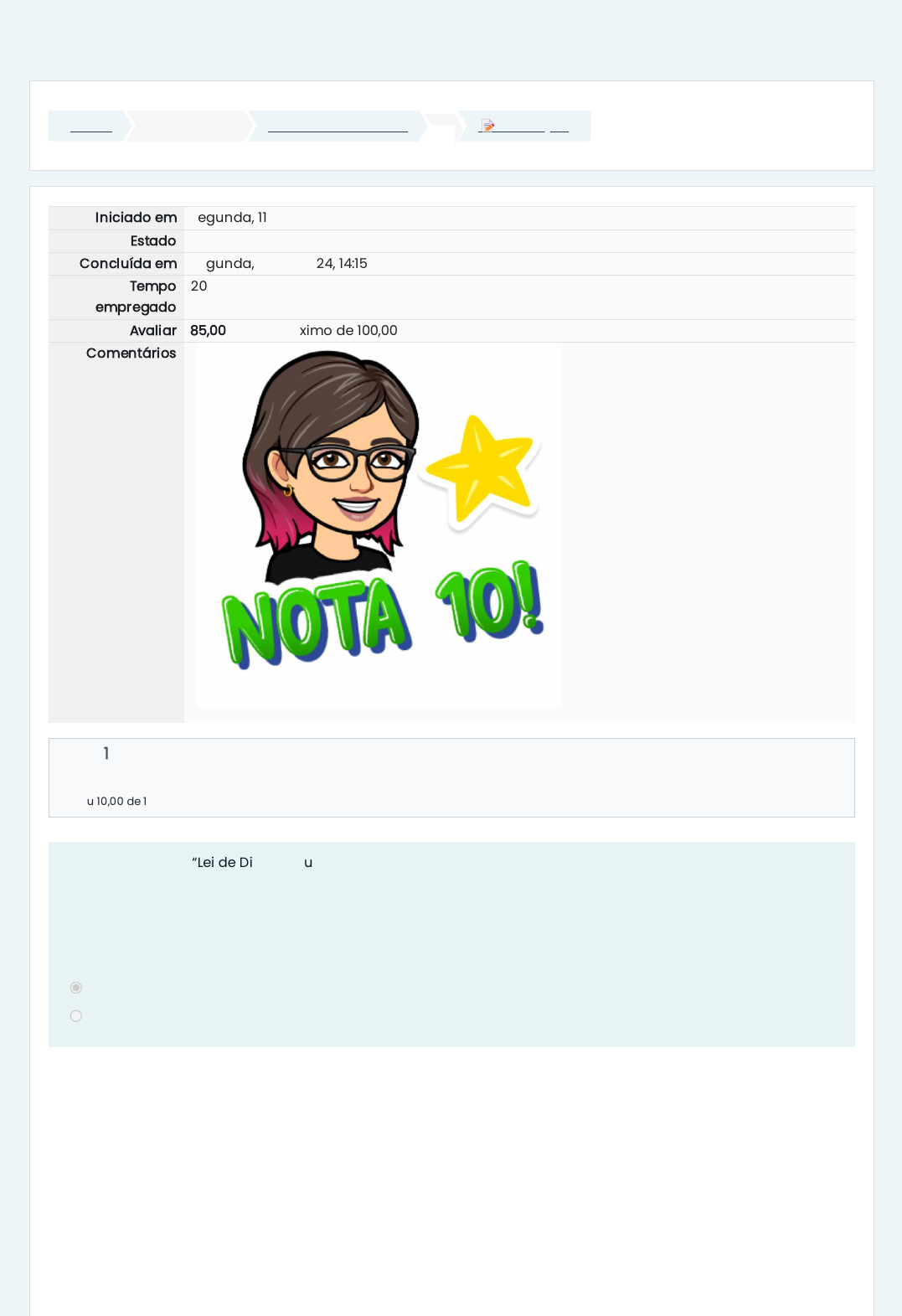 Painel Meus cursos 10152007-T01-2024-2 📝 Avaliação Iniciado em segunda, 11 nov 2024, 13:55 Estado Finalizada Concluída em segunda, 11 nov 2024, 14:15 Tempo empregado 20 minutos 6 segundos Avaliar 85,00 de um máximo de 100,00 Comentários Questão 1 Correto Atingiu 10,00 de 10,00 A lei 9610/1998 é a “Lei de Direitos Autorais” (LDA) que regulamenta a questão dos direitos autorais em nosso país. De acordo com o artigo 1 da referida lei, o direito autoral é definido como "direitos de autor" e os que lhes são conexos, ou seja, são os direitos que o criador de uma obra (livro, música, obra artística, vídeo etc.) tem sobre ela. Escolha uma opção: Verdadeiro Falso https://ava.ufms.br/my/ https://ava.ufms.br/course/view.php?id=63914 https://ava.ufms.br/mod/quiz/view.php?id=926875 Questão 2 Incorreto Atingiu 0,00 de 10,00 Questão 3 Correto Atingiu 10,00 de 10,00 Questão 4 Correto Atingiu 10,00 de 10,00 O domínio público é uma condição jurídica na qual uma obra não possui o elemento do direito real ou de propriedade que tem o direito autoral, não havendo, assim, restrição de uso de uma obra por qualquer um que queira utilizá-la. Do ponto de vista econômico, uma obra em domínio público não é livre e gratuita. Escolha uma opção: Verdadeiro Falso Assinale as alternativas corretas que se referem às características dos REAs: Obs.: Cada alternativa errada que for marcada anula a pontuação que seria recebida por uma alternativa correta. Escolha uma ou mais: a. Podem se restringir a poucas temáticas ou áreas do conhecimento ou disciplinas. b. Podem ter diferentes tamanhos ou granularidades: conteúdos atômicos independentes, lições, aulas completas, capítulos, livros). c. Podem atender a diferentes níveis de público: educação básica, educação superior, ensino técnico e uso empresarial. d. Podem ter diferentes formatos, tais como textos, imagens, vídeos, áudios, páginas web etc. Em relação à Universidade Aberta do Brasil (UAB), assinale a alternativa INCORRETA: Escolha uma opção: a. As universidades abertas como a Universidade Aberta do Brasil ocupam um papel crucial no que se refere à oferta da educação aberta, no entanto, atualmente, a UAB não é mais responsável pela melhoria da educação a distância no Brasil e expansão nas universidades públicas. b. A Universidade Aberta do Brasil (UAB) foi criada no Brasil em 2005 consiste na primeira experiência de educação a distância de grande envergadura, em nível nacional. c. A Universidade Aberta do Brasil (UAB) promove o acesso gratuito à educação mediante a rede pública de educação a distância. d. A Universidade Aberta do Brasil (UAB) resulta de uma parceria entre o Ministério da Educação (MEC), instituições públicas de ensino superior e governos locais (municípios e estados, mantenedores de Polos de Apoio Presencial). Questão 5 Correto Atingiu 10,00 de 10,00 Questão 6 Correto Atingiu 10,00 de 10,00 Questão 7 Parcialmente correto Atingiu 5,00 de 10,00 Assinale a alternativa INCORRETA em relação às licenças Creative Commons (CC): Escolha uma opção: a. As licenças Creative Commons (CC) têm reconhecimento internacional e são válidas em todos os países em que estejam inseridas. Os autores podem autorizar previamente e de forma expressa o uso amplo para que outras pessoas possam usar as suas obras a fim de que sejam copiadas, distribuídas, editadas e remixadas etc. e, neste caso, uso dos CCs substitui as leis de direito autoral de cada país. b. As licenças Creative Commons (CC) são licenças públicas. São exemplos de licenças públicas, as licenças Creative Commons e as licenças de Software Livre. c. A Creative Commons (CC) é uma organização sem fins lucrativos que permite o compartilhamento e uso da criatividade e do conhecimento através de instrumentos jurídicos gratuitos. d. Essa organização atua em parceria com universidades e com instituições de memória, como museus e arquivos, e com movimentos de pessoas e coletivos ligados à cultura e ao conhecimento livres. No universo dos direitos autorais, há diferentes formas de proteção e licenciamento de obras, permitindo tanto a reprodução exclusiva quanto a livre distribuição e modificação por terceiros. Esses conceitos são essenciais para entender como as obras intelectuais podem ser gerenciadas pelo autor. Com base nas definições abaixo, associe corretamente os termos com suas respectivas descrições. Consiste no direito exclusivo do autor de reproduzir sua obra (literária, artística ou científica). Se refere a uma forma de licenciar uma obra a qual o autor oferece a terceiros o direito de usar, modificar e compartilhar cópias do trabalho original. Copyright Copyleft O termo educação aberta é polissêmico, porém apresenta algumas características comuns. Assinale as alternativas corretas: Obs.: Cada alternativa errada que for marcada anula a pontuação que seria recebida por uma alternativa correta. Escolha uma ou mais: a. A cobrança de taxas de matrícula e custos que impedem a democratização da educação formal. b. O estudante tem a liberdade de decidir o local em que pretende estudar. c. A falta de acessibilidade dos cursos para pessoas com deficiência ou vulnerabilidade social e econômica. d. O estudante pode estudar por módulos, acúmulo de créditos ou qualquer modalidade que personalize e flexibilize o aprendizado de acordo com as suas necessidades. Questão 8 Correto Atingiu 10,00 de 10,00 Questão 9 Correto Atingiu 10,00 de 10,00 Questão 10 Correto Atingiu 10,00 de 10,00 Na interface entre a educação aberta e as tecnologias digitais surgem os Recursos Educacionais Abertos (REAs), marcada por dois movimentos: 1) Processo que parte do livre acesso aos conteúdos para as práticas educativas em ambientes digitais abertos e, em particular, para as implicações institucionais, culturais e pedagógicas dos modelos educativos abertos (Aires, 2016); 2) 