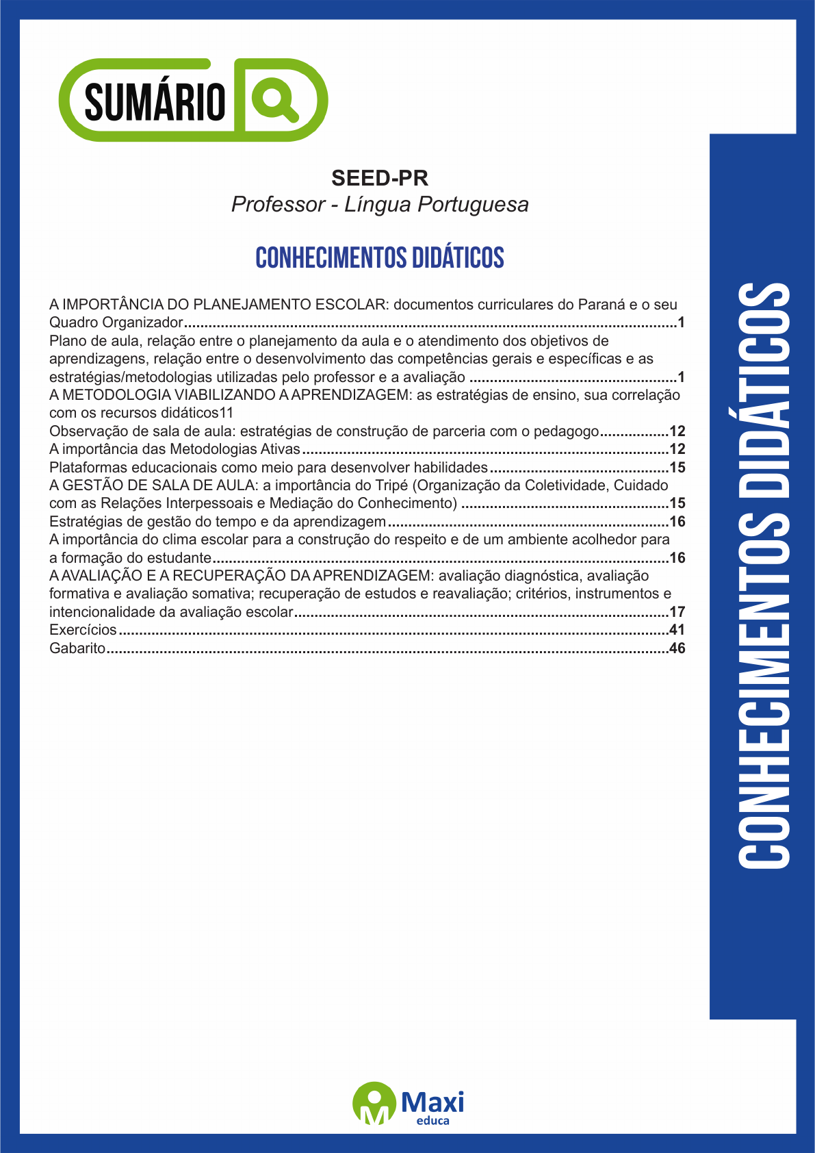 Co nh ec im en to s D id át ic osA IMPORTÂNCIA DO PLANEJAMENTO ESCOLAR: documentos curriculares do Paraná e o seu Quadro Organizador .........................................................................................................................1 Plano de aula, relação entre o planejamento da aula e o atendimento dos objetivos de aprendizagens, relação entre o desenvolvimento das competências gerais e específicas e as estratégias/metodologias utilizadas pelo professor e a avaliação ...................................................1 A METODOLOGIA VIABILIZANDO A APRENDIZAGEM: as estratégias de ensino, sua correlação com os recursos didáticos11 Observação de sala de aula: estratégias de construção de parceria com o pedagogo .................12 A importância das Metodologias Ativas ..........................................................................................12 Plataformas educacionais como meio para desenvolver habilidades ............................................15 A GESTÃO DE SALA DE AULA: a importância do Tripé (Organização da Coletividade, Cuidado com as Relações Interpessoais e Mediação do Conhecimento) ...................................................15 Estratégias de gestão do tempo e da aprendizagem .....................................................................16 A importância do clima escolar para a construção do respeito e de um ambiente acolhedor para a formação do estudante ................................................................................................................16 A AVALIAÇÃO E A RECUPERAÇÃO DA APRENDIZAGEM: avaliação diagnóstica, avaliação formativa e avaliação somativa; recuperação de estudos e reavaliação; critérios, instrumentos e intencionalidade da avaliação escolar ............................................................................................17 Exercícios .......................................................................................................................................41 Gabarito ..........................................................................................................................................46 SEED-PR Professor - Língua Portuguesa Conhecimentos Didáticos Apostila gerada especialmente para: FERNANDA ZIMMER 951.932.609-00 1 A IMPORTÂNCIA DO PLANEJAMENTO ESCOLAR: documentos curriculares do Paraná e o seu Quadro Organizador Prezado(a), Para estudo do tópico solicitado pelo edital, indicamos que verifique o material complementar, que pode ser encontrado em: http://www.referencialcurriculardoparana.pr.gov.br/# A indicação se dá devido ao formato e extensão do material em questão, que não cabe na estrutura de nos- sas apostilas. Por isso, e para manter protegido os direitos de autor do conteúdo, sugerimos acesso direto na fonte oficial e estudo do documento tal como solicitado pelo edital. Bons estudos! plano de aula, relação entre o planejamento da aula e o atendimento dos objetivos de aprendizagens, relação entre o desenvolvimento das competências gerais e específicas e as estratégias/metodologias utilizadas pelo professor e a avaliação Um plano de aula está diretamente relacionado ao plano de ensino1, mas descreve uma sequência didática a ser seguida para o desenvolvimento integral e integrado da aprendizagem, diariamente, em cada aula ou atividade prática (laboratório, estágio, visita). Facilita a visualização da dinâmica da aula ou atividade, contribui para que outro docente possa utilizar-se desta referência, em caso de impossibilidade ou ausência do docente responsável2. — Elaboração de um plano de aula Para Libâneo, “o planejamento escolar é uma tarefa docente que inclui tanto a previsão das atividades didáticas em termos de organização e coordenação em face dos objetivos propostos, quanto a sua revisão e adequação no decorrer do processo de ensino”. Portanto, o planejamento de aula é um instrumento essencial para o professor definir as estratégias pedagógicas, conforme o objetivo a ser alcançado, criteriosamente adequado para as diferentes turmas, com flexibilidade suficiente, caso necessite de alterações. Na elaboração do plano de aula devemos nos atentar para: – Clareza e objetividade; – Atualização do plano periodicamente; – Conhecimento dos recursos disponíveis da escola; – Noção do conhecimento que os alunos já possuem sobre o conteúdo abordado; – Articulação entre a teoria e a prática; – Utilização de metodologias diversificadas, inovadoras e que auxiliem no processo de ensino-aprendizagem; – Sistematização das atividades de acordo com o tempo disponível (dimensione o tempo/carga horária, segundo cada etapa da aula/atividade); – Flexibilidade frente a situações imprevistas; – Realização de pesquisas buscando diferentes referências, como revistas, jornais, filmes entre outros; – Elaboração de aulas de acordo com a realidade sociocultural dos estudantes. Ao elaborar o plano, faça um diagnóstico inicial, respondendo a questões: 1 Um plano de ensino é aquele que compreende todo o processo ensino aprendizagem durante o ano letivo, explicitando todas as disciplinas ou módulos do curso. É o documento que o aluno recebe no primeiro dia de aula descrevendo: identificação da disciplina, carga horária, objetivos, cronograma de atividades (conteúdos), instrumentos de avaliativos, bibliografia recomendada. Eventualmente o educador não tem oportunidade de elaborar o plano de ensino, pois, conforme a instituição é previamente elaborado e apresentado, sem espaço para ser revisitado. 2 https://edisciplinas.usp.br/pluginfile.php/4505701/mod_resource/content/2/TEXTO%20PLANO%20DE%20AULA.pdf Apostila gerada especialmente para: FERNANDA ZIMMER 951.932.609-00 2 Para quem vou ensinar? Quem são os estudantes? Quais as características (faixa etária, grau de maturidade, conhecimentos prévios, habilid