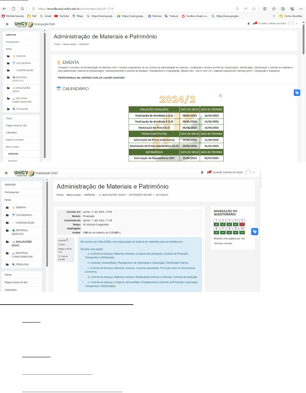 04/2024 ADM DE MATERIAIS E PATRIMONIO - 01 1. Painel 2. Meus cursos 3. AMPADM 4. 📝 AVALIAÇÕES 2024/2 5. ATIVIDADE ONLINE 1 - AV12024/2 Iniciado em quinta, 11 abr 2024, 16:56 Estado Finalizada Concluída em quinta, 11 abr 2024, 17:38 Tempo empregado 42 minutos 5 segundos Avaliar 1,80 de um máximo de 2,00(90%) Parte superior do formulário Questão 1 Correto Atingiu 0,20 de 0,20 Marcar questão Texto da questão De acordo com Dias (2006), uma organização de sistema de materiais pode ser dividida em: Escolha uma opção: a. Controle de estoque; Materiais diversos; Compras não planejada; Controle de Produção; Transportes e Distribuição. b. Compras; Almoxarifado; Planejamento de Importação e Exportação; Distribuição Interna. c. Controle de Estoque; Materiais diversos; Compras planejadas; Produção externa; Documentos pendentes. d. Controle de estoque; Materiais diversos; Distribuições internas e externas; Controle de produção. e. Controle de estoque; Compras; Almoxarifado; Planejamento e Controle de Produção; Importação; Transportes e Distribuição. Questão 2 Correto Atingiu 0,20 de 0,20 Marcar questão Texto da questão Como gestores precisamos entender nossas funções, sobretudo quando atuamos com recursos materiais que envolvem desembolso e erros podem ser muito prejudiciais. Para Chiavenato (2005, p. 37-38) “a administração de materiais consiste em ter os materiais necessários na quantidade certa, no local certo e no tempo certo à disposição”. O autor ainda cita que esta gestão “refere-se à totalidade das funções relacionadas com os materiais”. Neste sentido temos 4 premissas sequenciais básicas, assinale a alternativa correta. Escolha uma opção: a. Orçamento, armazenagem, codificação e entrega. b. Programação, armazenagem, codificação e distribuição. c. Programação, estocagem, armazenagem e codificação. d. Armazenagem, compra, distribuição e estocagem. e. Programação, compra, estocagem e distribuição. Questão 3 Correto Atingiu 0,20 de 0,20 Marcar questão Texto da questão Atualmente, temos revoluções na tentativa de promoção de clima de aliança e confiança mútua entre a empresa e o cliente, em parcerias nas quais ambas as competências saem ganhando. O grau de entendimento entre as duas partes não acontece de uma hora para outra, é necessário um amadurecimento da relação e para o cliente é importante conhecer previamente a capacidade do fornecedor. Como empresa, é preciso de custos reduzidos e de crédito; além, para estabelecer parcerias, é necessário avaliar os candidatos a fornecimento. Pontuando algumas avaliações a serem feitas, temos: I. Custo: verificar se os custos são compatíveis com o mercado. II. Qualidade: ter parâmetros para avaliação desta qualidade. III. Pontualidade: O cumprimento de prazos, deve ser visto como obrigação. IV. Produtividade: é a relação output sobre input, ou ainda valor do produto/serviço sobre o custos dos insumos. Sobre estes itens, assinale a opção que associa todos os CORRETOS: Escolha uma opção: a. Os itens I e II. b. Apenas IV. c. Os itens II e IV. d. Apenas I. e. Os itens I, II, III e IV. Questão 4 Correto Atingiu 0,20 de 0,20 Marcar questão Texto da questão Um termo moderno que se usa para designar o ápice da qualidade nesta relação cliente fornecedor é comakership que significa que foi atingido um excelente grau de confiança e entendimento entre ambos. Muitas condições de compra podem ser interessantes se ou mais adequadas, flexíveis caso exista este tipo de relacionamento entre cliente e fornecedor. Sobre esta relação cliente-fornecedor e as formas de avaliar estes, assinale a alternativa INCORRETA: Escolha uma opção: a. Verificar se o fornecedor dispõe de uma estrutura organizacional definida, saber sobre as decisões além, é claro, de saber se há capacidade financeira saudável para atender as nossas solicitações. b. Tanto cliente como fornecedor devem trabalhar a melhoria contínua nos seus processos de produção, mapeando, diagnosticando, e redesenhando processos para corrigir falhas; c. O Fornecedor precisa entregar preço e qualidade, mas manter seu processo produtivo como está, dispensando inovação; d. Como clientes-compradores, devemos saber como avaliar esta qualidade, ter parâmetros; e. Se foi prometido um prazo, cumpri-lo não é um bônus, mas uma obrigação; Questão 5 Incorreto Atingiu 0,00 de 0,20 Marcar questão Texto da questão Conforme Martins (2009) Os recursos materiais, entendidos como os itens ou componentes utilizados pela empresa nas operações do dia-a-dia, com o qual se forma os estoques e se fabrica os produtos são classificados como: I. Materiais auxiliares ou indiretos/não produtivos: produtos que se incorporam ao produto final durante todo o processo de produção. II. Matéria-prima: Materiais que se incorporam ao produto final, incluindo a embalagem. III. Produtos em processo: Não se incorporam ao produto final (material de escritório e manutenção). IV. Produtos acabados: São produtos prontos a serem comercializados. As relações CORRETAS são feitas: Escolha uma opção: a. Nos itens II e IV; b. Nos itens III e IV; c. Apenas II. d. Nos itens II e III; e. Nos itens I, II e IV; Questão 6 Correto Atingiu 0,20 de 0,20 Marcar questão Texto da questão O conceito da gestão sustentável da cadeia de suprimentos é composto por outros conceitos que podem, também, ser tratados de forma mais específica, como a Logística reversa. Sobre tal ponto é incorreto afirmar que: Escolha uma opção: a. A logística reversa tem como visão que o produto (ou parte dele) possa ser reciclado, remanufaturado e reutilizado na cadeia de valor. b. A logística reversa tem como objetivo reduzir os impactos ambientais da produção. c. A logística reversa padroniza todos os produtos finais para que o consumidor daquele produto se fidelize a compra sempre com a mesma empresa. d. O alcance do ob