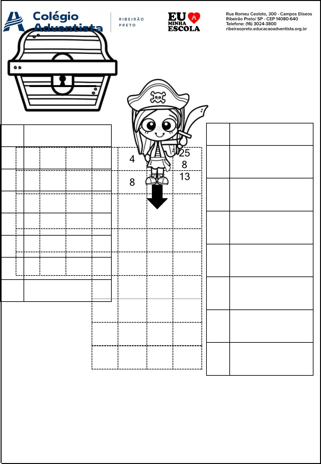 NOME: _______________________ Data: ________ D I V I S ÃO 1. SIGA A ORDEM DOS RESULTADOS DAS DIVISÕES PARA LEVAR A PIRATA ATÉ O TESOURO: 1º 126 ÷ 7 = 2º 248 ÷ 8 = 3º 360 ÷ 5 = 4º 774 ÷ 3 = 5º 144 ÷ 9 = 6º 580 ÷ 4 = 7º 870 ÷ 3 = 8º 730 ÷ 2 = 9º 946 ÷ 2 = 10º 171 ÷ 3 = 11º 528 ÷ 4 = 12º 315 ÷ 5 = 13º 204 ÷ 6 = 14º 852 ÷ 2 = 15º 465 ÷ 3 = 16º 688 ÷ 4 = 83 72 31 18 84 335 258 27 258 37 48 78 954 135 492 16 145 290 365 473 57 951 17 435 258 123 146 132 19 354 147 369 753 64 63 172 155 426 34 156 743 135 165 776 851 369 120 264 276 138 170 2. FAÇA A PROVA REAL DAS OPERAÇÕES ABAIXO E SINALIZE SE ESTÃO CERTAS OU ERRADAS.472 ÷ 2 = 236 PROVA REAL 2 3 6 X 2 4 7 2 576 ÷ 3 = 191 PROVA REAL 365 ÷ 5 = 74 PROVA REAL 584 ÷ 4 = 146 PROVA REAL 984 ÷ 2= 492 PROVA REAL 780 ÷ 3 = 261 PROVA REAL 343 ÷ 7 = 49 PROVA REAL 768 ÷ 6 = 129 PROVA REAL image3.png image1.png image2.png image4.png