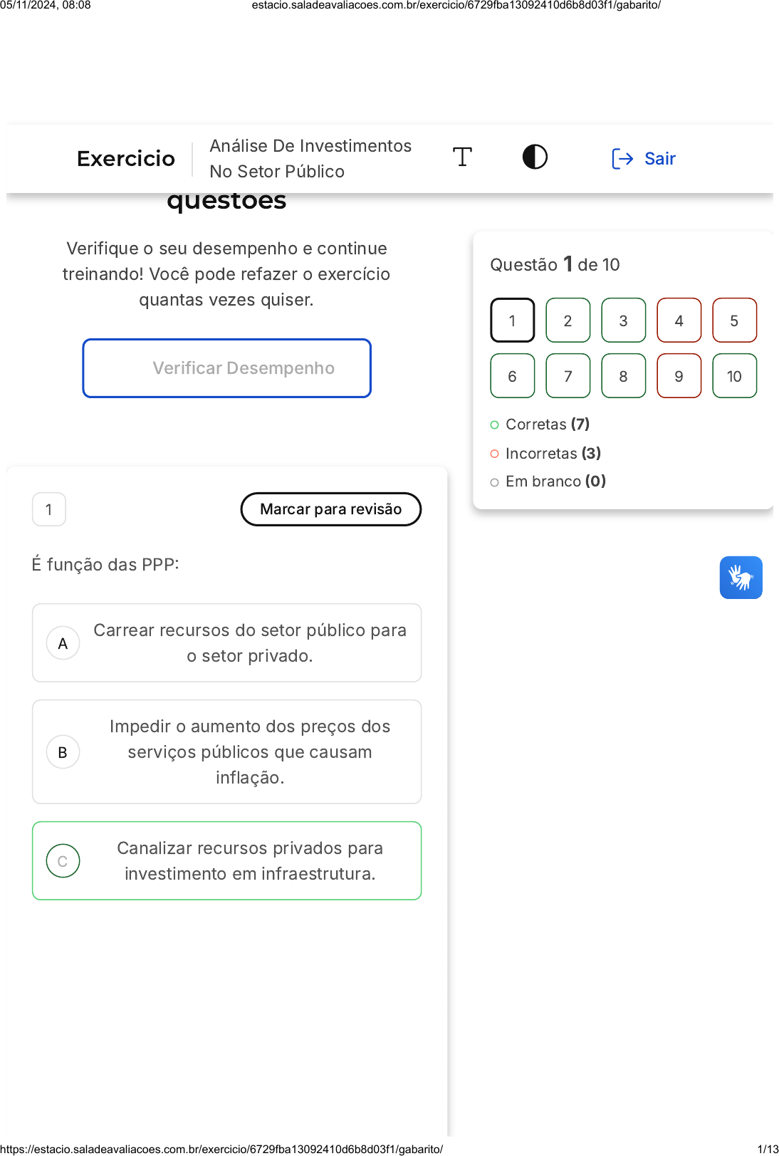 Você acertou 7 de 10 questões Verifique o seu desempenho e continue treinando! Você pode refazer o exercício quantas vezes quiser. Verificar Desempenho A B C 1 Marcar para revisão É função das PPP� Carrear recursos do setor público para o setor privado. Impedir o aumento dos preços dos serviços públicos que causam inflação. Canalizar recursos privados para investimento em infraestrutura. Questão 1 de 10 Corretas �7� Incorretas �3� Em branco �0� 1 2 3 4 5 6 7 8 9 10 Exercicio Análise De Investimentos No Setor Público Sair 05/11/2024, 08:08 estacio.saladeavaliacoes.com.br/exercicio/6729fba13092410d6b8d03f1/gabarito/ https://estacio.saladeavaliacoes.com.br/exercicio/6729fba13092410d6b8d03f1/gabarito/ 1/13 D E Aumentar a eficiência do setor privado, por meio do uso de mão de obra do setor público. Promover o desenvolvimento do setor público por meio dos valores reduzidos da mão de obra privada. Resposta correta Parabéns, você selecionou a alternativa correta. Confira o gabarito comentado! Gabarito Comentado As Parcerias Público-Privadas �PPP) são contratos de prestação de serviços de médio e longo prazo, firmados entre empresas do setor privado e o poder público. Uma das principais funções das PPPs é justamente canalizar recursos privados para investimentos em infraestrutura, que são áreas de interesse público. Portanto, a função das PPPs não é carrear recursos do setor público para o privado, impedir o aumento dos preços dos serviços públicos, aumentar a eficiência do setor privado através da mão de obra do setor público ou promover o desenvolvimento do setor público por meio de valores reduzidos da mão de obra privada. 2 Marcar para revisão Uma cidade brasileira firmou uma PPP para a construção de um novo hospital público. A SPE 05/11/2024, 08:08 estacio.saladeavaliacoes.com.br/exercicio/6729fba13092410d6b8d03f1/gabarito/ https://estacio.saladeavaliacoes.com.br/exercicio/6729fba13092410d6b8d03f1/gabarito/ 2/13 A B C D E designada focou em garantir que o projeto atendesse aos altos padrões de qualidade e eficiência, visando melhorar a assistência à saúde da população local. Qual é um dos principais objetivos de uma PPP na construção de um hospital público? Reduzir a participação de profissionais de saúde qualificados. Priorizar tratamentos de saúde de alto custo. Assegurar altos padrões de qualidade e eficiência. Limitar o acesso público ao novo hospital. Focar apenas em tecnologias de saúde importadas. Resposta correta Parabéns, você selecionou a alternativa correta. Confira o gabarito comentado! Gabarito Comentado Em projetos de PPP para a construção de hospitais públicos, garantir altos padrões de qualidade e eficiência é crucial. Isso implica na implementação de práticas e tecnologias avançadas em saúde, visando melhorar a assistência e os serviços 05/11/2024, 08:08 estacio.saladeavaliacoes.com.br/exercicio/6729fba13092410d6b8d03f1/gabarito/ https://estacio.saladeavaliacoes.com.br/exercicio/6729fba13092410d6b8d03f1/gabarito/ 3/13 A B C D E prestados à comunidade, além de otimizar os recursos envolvidos. 3 Marcar para revisão Um município estabeleceu uma PPP para construir uma nova rodovia. A SPE responsável pelo projeto enfatizou a importância de alinhar os interesses do setor público e privado, garantindo benefícios mútuos e sustentabilidade a longo prazo. No contexto de uma PPP para construção de rodovias, qual fator é crucial para o sucesso do projeto? Independência total do setor público. Foco exclusivo no retorno financeiro imediato. Alinhamento de interesses entre setores público e privado. Redução da participação comunitária. Concentração de todas as operações na esfera privada. Resposta correta Parabéns, você selecionou a alternativa correta. Confira o gabarito comentado! 05/11/2024, 08:08 estacio.saladeavaliacoes.com.br/exercicio/6729fba13092410d6b8d03f1/gabarito/ https://estacio.saladeavaliacoes.com.br/exercicio/6729fba13092410d6b8d03f1/gabarito/ 4/13 A B C Gabarito Comentado Em Parcerias Público-Privadas, especialmente na construção de rodovias, o alinhamento de interesses entre o setor público e privado é vital. Esse alinhamento assegura que tanto o governo quanto a empresa privada trabalhem em conjunto para o sucesso do projeto, equilibrando objetivos financeiros, operacionais e sociais, o que contribui para a sustentabilidade e eficácia do projeto a longo prazo. 4 Marcar para revisão As parcerias público-privadas se dividem em duas categorias: concessão patrocinada e concessão administrativa. Sobre a concessão patrocinada, pode-se afirmar que: Cabe ao agente privado cobrar a tarifa que cubra os custos. Cabe ao agente privado arcar com os custos de construção e implementação do empreendimento. O agente particular constrói e administra o empreendimento. 05/11/2024, 08:08 estacio.saladeavaliacoes.com.br/exercicio/6729fba13092410d6b8d03f1/gabarito/ https://estacio.saladeavaliacoes.com.br/exercicio/6729fba13092410d6b8d03f1/gabarito/ 5/13 D E O setor público remunera o empreendimento sem cobrança de tarifa. Não se enquadra nas categorias de PPP. Resposta incorreta Opa! A alternativa correta é a letra B. Confira o gabarito comentado! Gabarito Comentado Na modalidade de concessão patrocinada, a responsabilidade de arcar com os custos de construção e implementação do empreendimento recai sobre o agente privado, conforme indicado na alternativa B. Além disso, o setor público tem a responsabilidade de cobrar uma tarifa que seja capaz de cobrir os custos operacionais e de manutenção, a amortização do investimento e a taxa de retorno do negócio. Por outro lado, na concessão administrativa, o agente particular é responsável por construir e administrar o empreendimento, sendo remunerado pelo setor público sem a cobrança de tarifa. Um exemplo típico dessa modalidade são os presídios construídos e administrados por parti