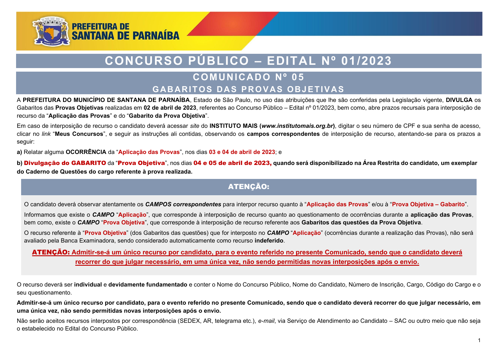 pcimarkpci MDAwMDowMDAwOjAwMDA6MDAwMDowMDAwOmZmZmY6YjM2YjpmZWEz:TW9uLCAxMSBOb3YgMjAyNCAxOToyMToxMiAtMDMwMA== www.pciconcursos.com.br 1 CONCURSO PÚBLICO – EDITAL Nº 01/2023 COMUNICADO Nº 0 5 G AB AR I T O S D A S PR O V AS OB J ET I V A S A PREFEITURA DO MUNICÍPIO DE SANTANA DE PARNAÍBA, Estado de São Paulo, no uso das atribuições que lhe são conferidas pela Legislação vigente, DIVULGA os Gabaritos das Provas Objetivas realizadas em 02 de abril de 2023, referentes ao Concurso Público – Edital nº 01/2023, bem como, abre prazos recursais para interposição de recurso da “Aplicação das Provas” e do “Gabarito da Prova Objetiva”. Em caso de interposição de recurso o candidato deverá acessar site do INSTITUTO MAIS (www.institutomais.org.br), digitar o seu número de CPF e sua senha de acesso, clicar no link “Meus Concursos”, e seguir as instruções ali contidas, observando os campos correspondentes de interposição de recurso, atentando-se para os prazos a seguir: a) Relatar alguma OCORRÊNCIA da “Aplicação das Provas”, nos dias 03 e 04 de abril de 2023; e b) Divulgação do GABARITO da “Prova Objetiva”, nos dias 04 e 05 de abril de 2023, quando será disponibilizado na Área Restrita do candidato, um exemplar do Caderno de Questões do cargo referente à prova realizada. ATENÇÃO: O candidato deverá observar atentamente os CAMPOS correspondentes para interpor recurso quanto à “Aplicação das Provas” e/ou à “Prova Objetiva – Gabarito”. Informamos que existe o CAMPO “Aplicação”, que corresponde à interposição de recurso quanto ao questionamento de ocorrências durante a aplicação das Provas, bem como, existe o CAMPO “Prova Objetiva”, que corresponde à interposição de recurso referente aos Gabaritos das questões da Prova Objetiva. O recurso referente à “Prova Objetiva” (dos Gabaritos das questões) que for interposto no CAMPO “Aplicação” (ocorrências durante a realização das Provas), não será avaliado pela Banca Examinadora, sendo considerado automaticamente como recurso indeferido. ATENÇÃO: Admitir-se-á um único recurso por candidato, para o evento referido no presente Comunicado, sendo que o candidato deverá recorrer do que julgar necessário, em uma única vez, não sendo permitidas novas interposições após o envio. O recurso deverá ser individual e devidamente fundamentado e conter o Nome do Concurso Público, Nome do Candidato, Número de Inscrição, Cargo, Código do Cargo e o seu questionamento. Admitir-se-á um único recurso por candidato, para o evento referido no presente Comunicado, sendo que o candidato deverá recorrer do que julgar necessário, em uma única vez, não sendo permitidas novas interposições após o envio. Não serão aceitos recursos interpostos por correspondência (SEDEX, AR, telegrama etc.), e-mail, via Serviço de Atendimento ao Candidato – SAC ou outro meio que não seja o estabelecido no Edital do Concurso Público. pcimarkpci MDAwMDowMDAwOjAwMDA6MDAwMDowMDAwOmZmZmY6YjM2YjpmZWEz:TW9uLCAxMSBOb3YgMjAyNCAxOToyMToxMiAtMDMwMA== www.pciconcursos.com.br 2 Não serão apreciados os recursos que forem apresentados em desacordo com normas e os procedimentos dos recursos contidos no Capítulo dos Recursos, do Edital do Concurso Público As decisões dos recursos serão dadas a conhecer, coletivamente, aos pedidos deferidos e indeferidos, por meio dos sites do INSTITUTO MAIS (www.institutomais.org.br) e da PREFEITURA DO MUNICÍPIO DE SANTANA DE PARNAÍBA/SP (www.santanadeparnaiba.sp.gov.br), bem como as respostas aos recursos, serão encaminhadas diretamente aos candidatos, , na data prevista de 21 de abril de 2023. O Resultado Provisório das Provas Objetivas, para os cargos de nível fundamental, está previsto para ser divulgado até a data de 21 de abril de 2023. O Resultado Provisório das Provas Objetivas, Dissertativa (Assistente Técnico Jurídico), de Títulos e de Tempo de Experiência Profissional, para os cargos de nível médio, médio/técnico e superior, está previsto para ser divulgado até a data de 12 de maio de 2023. E, para que ninguém possa alegar desconhecimento, é expedido o presente Comunicado. Santana de Parnaíba/SP, 03 de abril de 2023. PREFEITURA DO MUNICÍPIO DE SANTANA DE PARNAÍBA/SP R E A L I Z A Ç Ã O : pcimarkpci MDAwMDowMDAwOjAwMDA6MDAwMDowMDAwOmZmZmY6YjM2YjpmZWEz:TW9uLCAxMSBOb3YgMjAyNCAxOToyMToxMiAtMDMwMA== www.pciconcursos.com.br 3 CONCURSO PÚBLICO – EDITAL Nº 01/2023 GABARITOS DAS PROVAS OBJETIVAS 101 – Agente de Limpeza Pública 1 2 3 4 5 6 7 8 9 10 11 12 13 14 15 16 17 18 19 20 21 22 23 24 25 26 27 28 29 30 D A B C A D B C B C D B A D D A C D C A D B A C D A C C A B 102 – Agente de Serviços de Alimentação 1 2 3 4 5 6 7 8 9 10 11 12 13 14 15 16 17 18 19 20 21 22 23 24 25 26 27 28 29 30 31 32 33 34 35 36 37 38 39 40 D A B C A D B C B C B D A D B C C A D C A C C A B D C A B D A B C B C D A B D C 103 – Agente de Serviços Gerais 1 2 3 4 5 6 7 8 9 10 11 12 13 14 15 16 17 18 19 20 21 22 23 24 25 26 27 28 29 30 D A B C A D B C B C D B A D D A C D C A D B A C D A C C A B 104 – Agente de Serviços Públicos 1 2 3 4 5 6 7 8 9 10 11 12 13 14 15 16 17 18 19 20 21 22 23 24 25 26 27 28 29 30 B D C D A C A C C B C A B D D B A B C B A D A D B D C A A B 105 – Operador de Máquinas - Tratorista 1 2 3 4 5 6 7 8 9 10 11 12 13 14 15 16 17 18 19 20 21 22 23 24 25 26 27 28 29 30 31 32 33 34 35 36 37 38 39 40 B D C D A C A C C B C C B B A D B A D B D C A A B D D D C C A A B D D B A C D B 106 – Motorista 1 2 3 4 5 6 7 8 9 10 11 12 13 14 15 16 17 18 19 20 21 22 23 24 25 26 27 28 29 30 31 32 33 34 35 36 37 38 39 40 A D B B C C A D B C D B A C B D B C A D D D C B A D C A D D C A D D C C B A D B 107 – Agente de Atendimento 1 2 3 4 5 6 7 8 9 10 11 12 13 14 15 16 17 18 19 20 21 22 23 24 25 26 27 28 29 30 31 32 33 34 35 36 37 38 39 40 D B B D C C C A A B D A C D B C C A D B D B C C A D A C D D A C C A A A B C A C 108 – Agente de 