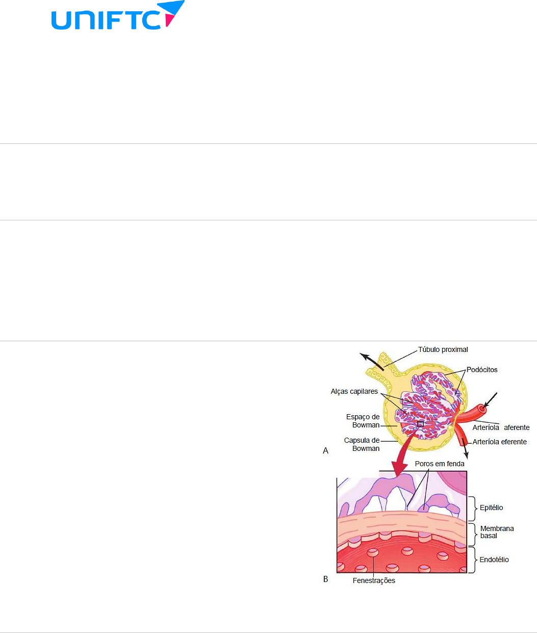 Prof. Luiz Quintanilha Filtração glomerular Introdução As intensidades com que as diferentes substâncias são excretadas na urina representam a soma de três processos renais: (1) filtração glomerular, (2) reabsorção de substâncias dos túbulos renais para o sangue e (3) secreção de substâncias do sangue para os túbulos renais(1). Aqui falaremos especificamente sobre a filtração glomerular. Composição do filtrado glomerular A formação da urina começa com a filtração de grandes quantidades de líquido, por meio dos capilares glomerulares para a cápsula de Bowman. Esses capilares glomerulares são impermeáveis às proteínas, desse modo, o filtrado glomerular) é basicamente livre de proteínas e de elementos celulares como as hemácias. As concentrações de outros constituintes do filtrado glomerular são similares às concentrações no plasma. Algumas poucas substâncias de baixo peso molecular são exceções: cálcio e ácidos graxos, que não são livremente filtradas por estarem parcialmente ligadas às proteínas plasmáticas(1). Membrana capilar glomerular A membrana capilar glomerular é semelhante à encontrada em outros capilares, exceto por ter três (e não duas) camadas principais: (1) o endotélio capilar, (2) a membrana basal e (3) a camada de células epiteliais (podócitos)(1). A alta intensidade da filtração pela membrana capilar glomerular é devido a um endotélio capilar fenestrado, semelhantes aos capilares fenestrados encontrados no fígado. E mesmo que as fenestrações sejam relativamente grandes, as células endoteliais são ricamente dotadas de cargas fixas negativas que repelem as proteínas plasmáticas. A membrana basal, que reveste o endotélio, por sua vez, evita de modo eficiente a filtração das proteínas plasmáticas, também, em parte, devido a fortes cargas elétricas negativas associadas aos proteoglicanos. A última parte da membrana glomerular é a camada de células epiteliais que recobre a superfície externa do glomérulo. Essas células não são contínuas, mas têm longos processos semelhantes a pés (podócitos) que revestem a superfície externa dos capilares(1). Determinantes da FG Mas o que determina a filtração glomerular? A FG é determinada por: 1. balanço das forças hidrostáticas e coloidosmóticas, atuando através da membrana capilar; 2. coeficiente de filtração capilar (Kf): o produto da permeabilidade e da área de superfície de filtração dos capilares(1). A pressão efetiva de filtração representa a soma das forças hidrostáticas e coloidosmóticas que favorecem ou se opõem à filtração através dos capilares glomerulares. Essas forças incluem: 1. a pressão hidrostática, nos capilares glomerulares (PG): promove a filtração; 2. a pressão hidrostática na cápsula de Bowman (PB): se opõe à filtração; 3. a pressão coloidosmótica das proteínas plasmáticas (nG): se opõe à filtração; Prof. Luiz Quintanilha 4. a pressão coloidosmótica das proteínas na cápsula de Bowman (nB): promove a filtração (normalmente é considerada nula)(1). Para melhor compreensão, observe a imagem abaixo: Para raciocinar: aumentando-se a pressão coloidosmótica do plasma arterial, eleva-se a pressão coloidosmótica nos capilares glomerulares, que por sua vez diminui a FG. Aumentando-se a fração de filtração também se concentram as proteínas plasmáticas e se eleva a pressão coloidosmótica glomerular. Como a fração de filtração é definida como FG/fluxo plasmático renal, a fração de filtração pode ser aumentada pelo aumento da FG ou pela redução do fluxo plasmático renal(1). A pressão hidrostática glomerular, por sua vez, é determinada por três variáveis: 1. pressão arterial, 2. resistência arteriolar aferente e 3. resistência arteriolar eferente(1). O aumento da pressão arterial tende a elevar a pressão hidrostática glomerular e, portanto, aumentar a FG. Para raciocinar: a resistência aumentada das arteríolas aferentes reduz a pressão hidrostática glomerular e diminui a FG. O contrário, a dilatação das arteríolas aferentes aumenta tanto a pressão hidrostática glomerular como a FG. A constrição das arteríolas eferentes aumenta a resistência ao fluxo de saída dos capilares glomerulares. Isso eleva a pressão hidrostática glomerular, e, enquanto o aumento da resistência eferente não reduzir demasiadamente o fluxo sanguíneo renal, a FG se elevará discretamente. No entanto, como a constrição arteriolar eferente também reduz o fluxo sanguíneo renal, a fração de filtração e a pressão coloidosmótica glomerular aumentam, à medida que a resistência arteriolar eferente aumenta(1). Se a constrição das arteríolas eferentes é grave (mais que três vezes o normal), a elevação da pressão coloidosmótica excede o aumento na pressão hidrostática capilar glomerular causada pela constrição arteriolar eferente. Quando isto ocorre, a força efetiva de filtração na realidade diminui, causando redução na FG. Assim, a constrição arteriolar eferente tem efeito bifásico na FG(1). Referências: 1. Hall JE. Tratado de Fisiologia Médica [recurso eletrônico]. 12o ed. Rio de Janeiro: Elsevier; 1173 p.