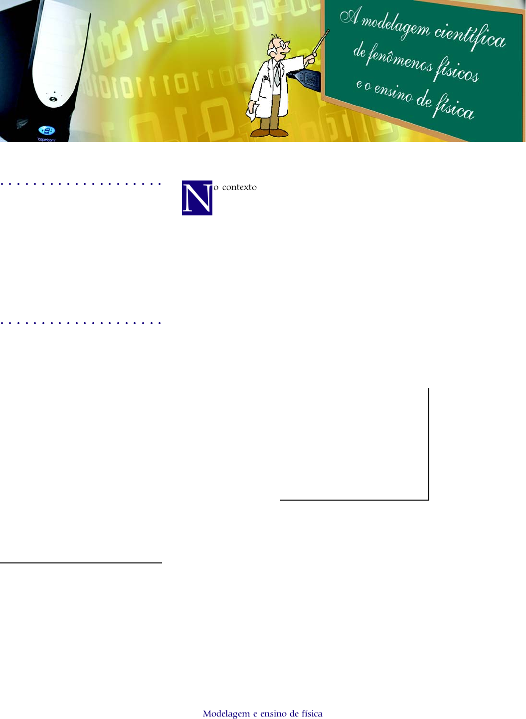 10 Física na Escola, v. 9, n. 1, 2008 ○ ○ ○ ○ ○ ○ ○ ○ ○ ○ ○ ○ ○ ○ ○ ○ ○ ○ ○ ○ ○ ○ ○ ○ ○ ○ ○ ○ ○ ○ ○ ○ ○ ○ ○ ○ ○ ○ ○ ○ Modelagem e ensino de física No contexto científico contempo- râneo, o processo de modelagem assume um papel fundamental na busca por respostas que auxiliam o ho- mem a compreender o mundo em que vi- ve. Já no atual contexto educacional [1-4], tem-se visto que estratégias didáticas baseadas na noção e uso de modelos sur- gem como alternativas para inserção de conteúdos de natureza epistemológica que, imbricados com conteúdos de física, propiciam aos alunos uma visão mais holística sobre a natureza e a construção do conhecimento científico. Nesse contex- to, ao discutir aspectos conceituais da mo- delagem científica, este trabalho pretende fornecer subsídios para a elaboração de estratégias didáticas que permitam aos professores de física caminhar em direção a um ensino que vise a compreensão, em que, como bem salien- tado por Eric Rogers, “saber dar nomes no- vos às coisas é algo bem diferente de com- preendê-las” [5]. Ou seja, é preciso dar sen- tido ao que se estuda: seja por meio da experimentação, seja por meio da conceitualização. Com isso não se quer dizer que o uso da matemática na solução de problemas da física deve ser relegado, senão que a “matematização” da física não deve ser o ponto de partida nem tampouco o objetivo final. Que sen- tido faz para um aluno de ensino médio o problema a seguir, se o mesmo for pen- sado como o ponto de partida no estudo do movimento? Dois móveis, A e B, movimentam-se sobre uma mesma trajetória. As fun- ções horárias do espaço para os movi- mentos são: sA = 20t + t2 e sB = 400 - 10t, com s em metros e t em segundos. Tendo em vista as possíveis melhorias que uma adequada compreensão sobre o processo de mo- delagem científica pode trazer ao ensino de física, no presente trabalho apresentamos algu- mas relações existentes entre teoria e realidade, através do uso de estratégias didáticas baseadas na noção de modelo científico. Para tanto, dis- cutimos a partir de dois problemas típicos de física (cinemática e termodinâmica), encontra- dos em livros de texto de nível médio, algumas das idéias do filósofo da ciência Mario Bunge sobre a construção e a testabilidade de modelos científicos. Rafael Vasques Brandão E-mail: rafael.brandao@ufrgs.br Ives Solano Araujo E-mail: ives@if.ufrgs.br Eliane Angela Veit E-mail: eav@if.ufrgs.br Instituto de Física, Universidade Federal do Rio Grande do Sul, Porto Alegre, RS, Brasil a) Classifique os movimentos dos mó- veis A e B. b) Determine a distância entre A e B no instante t = 0. c) Deter- mine o instante e o espaço em que os móveis se encontram. [6, p. 49] Esta crítica não se refere à tentativa de explicar um fenômeno físico utilizando a matemática, nem toma como alvo o estudo da cinemática, tantas vezes criti- cada de forma injusta. Por este motivo, discutiremos na última seção deste artigo um problema de cinemática para mostrar que, quando ensinada apropriadamente, pode levar o aluno a compreender pontos cruciais da modelagem científica, como as idealizações e as aproximações. Dessa for- ma, nossa crítica se dirige, fundamental- mente, às estratégias didáticas que em mo- mento algum estabe- lecem uma conexão entre o mundo abs- trato (ideal) e o mun- do concreto (real). Esta desconexão entre teoria e realidade é um problema freqüen- temente observado, chegando a gerar nos alunos posições disparatadas, como a apontada por Mazur [7, p. 4], em um diálogo com um aluno seu: Professor Mazur, como eu de- vo responder estas questões? De acordo com o que você nos ensinou, ou da forma que eu penso sobre estas coisas? A passagem acima evidencia um obs- táculo a ser superado no ensino de ciências em geral e da física em particular, seja ela clássica ou moderna: a incomensurabili- dade entre as visões de mundo que insis- tem em coabitar a mente do aluno. Uma sendo formada por concepções científicas que parecem ter pouco a ver com a realidade Estratégias didáticas baseadas na noção e uso de modelos surgem como alternativas para inserção de conteúdos de natureza epistemológica que, imbricados com conteúdo de física, propiciam aos alunos uma visão mais holística sobre a natureza e a construção do conhecimento científico 11Física na Escola, v. 9, n. 1, 2008 Modelagem e ensino de física e a outra que, embora constituída de concepções alternativas às científicas, for- nece explicações para muitas das situações do dia-a-dia. O desafio que se impõe a nós educadores está em reduzir o papel desem- penhado pelas concepções alternativas em favor das científicas. Nesse sentido, acreditamos que a modelagem, mais do que uma ferramenta útil para a resolução de problemas, pode contribuir de forma signi- ficativa para uma visão de ciência adequada à prática científica moderna, cuja essência está na criação de modelos [8-10], e que foi bem exemplificada por Moreira [11] no artigo sobre os 50 anos do modelo da dupla hélice para a estrutura do DNA. A modelagem científica Nos referimos à modelagem científica como um processo de criação de modelos com a finalidade de compreender a reali- dade. A Fig. 1 ilustra de forma esquemá- tica as relações entre os diversos elementos envolvidos no processo de modelagem. Na parte superior esquerda do mapa conceitual, vê-se que a modelagem cientí- fica é, antes de tudo, um processo de busca por respostas. Assim, os cientistas pro- duzem conhecimento científico formulan- do questões de pesquisa sobre objetos (ou fatos) reais ou supostos como tais. Por exemplo, átomos, moléculas, células, sis- temas, processos, máquinas e sociedades, etc. Nesse processo, eles formulam hipó- teses e elaboram modelos conceituais que, encaixados em 