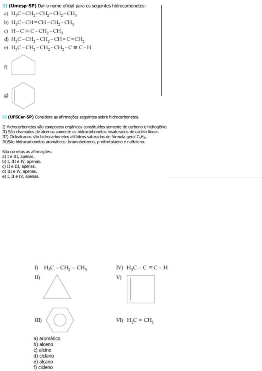 05) Na estrutura do 1,3-pentadieno, o número de carbonos insaturados é: a) 1 b) 2 c) 3 d) 4 06) Dê a fórmula molecular e o nome oficial do hidrocarboneto abaixo: C = C – C = C – C – C 07) Relacionar as estruturas dos hidrocarbonetos aos nomes abaixo: 03) Anos atrás, três tanques contendo 250 toneladas de um gás derivado do petróleo usado na fabricação de borracha sintética foram destruídos em incêndio no Rio de Janeiro. Esse gás, um hidrocarboneto de cadeia aberta com 4 átomos de carbono e 2 ligações duplas é: a) C4H8 b) C4H6 c) C4H10 d) C4H11 e) C4H12 04) Qual o nome do segundo composto da série dos alcenos? a) Eteno b) Etino c) Propeno d) Butano e) but-1-eno 08) dê o nome oficial dos compostos abaixo: 10) Os biodigestores possibilitam o reaproveitamento de detritos para gerar gás e adubos. Geralmente são alimentados com restos de alimentos e fezes de animais, acrescidos de água. Dentro do aparelho, esses detritos entram em decomposição pela ação de bactérias anaeróbicas. Durante o processo, todo material orgânico acaba convertido em gás metano, que é utilizado como combustível em fogões de cozinha ou geradores de energia elétrica. O resíduo sólido que sobra no biodigestor também pode ser aproveitado com fertilizante. Em relação ao meio ambiente e ao processo relacionado com o biodigestor afirma-se: a) Contribui para aumentar a poluição no solo. b) As bactérias do lixo fixam no gás produzido e, junto com o vapor d’água, produz a chuva ácida. c) A energia liberada na combustão do gás metano pode ser utilizado para cozimento de alimentos, evitando assim que árvores sejam cortadas para que, em uma combustão, fornecessem energia calorífica a fim de cozinhar os alimentos. d) O fertilizante obtido não pode ser utilizado na agricultura, pois se encontra com muitas bactérias. e) O biodigestor não é aconselhável, pois aumenta a quantidade de lixo no meio ambiente. g) h) i) f) 9)