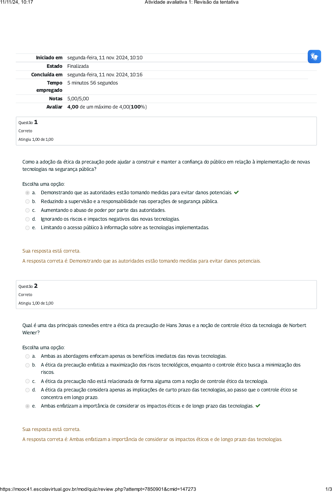 Iniciado em segunda-feira, 11 nov. 2024, 10:10 Estado Finalizada Concluída em segunda-feira, 11 nov. 2024, 10:16 Tempo empregado 5 minutos 56 segundos Notas 5,00/5,00 Avaliar 4,00 de um máximo de 4,00(100%) Questão 1 Correto Atingiu 1,00 de 1,00 Questão 2 Correto Atingiu 1,00 de 1,00 Como a adoção da ética da precaução pode ajudar a construir e manter a con�ança do público em relação à implementação de novas tecnologias na segurança pública? Escolha uma opção: a. Demonstrando que as autoridades estão tomando medidas para evitar danos potenciais. b. Reduzindo a supervisão e a responsabilidade nas operações de segurança pública. c. Aumentando o abuso de poder por parte das autoridades. d. Ignorando os riscos e impactos negativos das novas tecnologias. e. Limitando o acesso público à informação sobre as tecnologias implementadas. Sua resposta está correta. A resposta correta é: Demonstrando que as autoridades estão tomando medidas para evitar danos potenciais. Qual é uma das principais conexões entre a ética da precaução de Hans Jonas e a noção de controle ético da tecnologia de Norbert Wiener? Escolha uma opção: a. Ambas as abordagens enfocam apenas os benefícios imediatos das novas tecnologias. b. A ética da precaução enfatiza a maximização dos riscos tecnológicos, enquanto o controle ético busca a minimização dos riscos. c. A ética da precaução não está relacionada de forma alguma com a noção de controle ético da tecnologia. d. A ética da precaução considera apenas as implicações de curto prazo das tecnologias, ao passo que o controle ético se concentra em longo prazo. e. Ambas enfatizam a importância de considerar os impactos éticos e de longo prazo das tecnologias. Sua resposta está correta. A resposta correta é: Ambas enfatizam a importância de considerar os impactos éticos e de longo prazo das tecnologias. 11/11/24, 10:17 Atividade avaliativa 1: Revisão da tentativa https://mooc41.escolavirtual.gov.br/mod/quiz/review.php?attempt=7850901&cmid=147273 1/3 Questão 3 Correto Atingiu 1,00 de 1,00 Questão 4 Correto Atingiu 1,00 de 1,00 Considerando o exemplo formulado no módulo 02, qual das seguintes diretrizes é uma parte importante do controle ético ao considerar a implementação de sistemas de reconhecimento facial na segurança pública? Escolha uma opção: a. Evitar a supervisão e a responsabilidade humana na operação do sistema. b. Garantir a transparência e o escrutínio público, incluindo consultas, debates abertos e avaliações independentes. c. Ampliar a aplicação do reconhecimento facial para monitorar todos os cidadãos em espaços públicos. d. Minimizar a transparência e manter as intenções em segredo. e. Não se preocupar com a proteção da privacidade e dos dados pessoais. Sua resposta está correta. A resposta correta é: Garantir a transparência e o escrutínio público, incluindo consultas, debates abertos e avaliações independentes. Qual é a área do saber que lida com questões de comportamento humano, valores, moralidade, certo e errado? Escolha uma opção: a. História. b. Ética. c. Matemática. d. Astronomia. e. Biologia. Sua resposta está correta. A resposta correta é: Ética. 11/11/24, 10:17 Atividade avaliativa 1: Revisão da tentativa https://mooc41.escolavirtual.gov.br/mod/quiz/review.php?attempt=7850901&cmid=147273 2/3 Questão 5 Correto Atingiu 1,00 de 1,00 Qual é o conceito central do "Princípio da Responsabilidade" de Hans Jonas e como ele se relaciona com a tomada de decisões tecnológicas? Escolha uma opção: a. O princípio da ética exclusivamente centrada nas relações humanas presentes. b. O princípio da consideração das implicações de longo prazo e a adoção do princípio de precaução na tomada de decisões tecnológicas. c. O princípio da previsibilidade absoluta em relação aos resultados tecnológicos. d. O princípio da ignorância em relação aos efeitos futuros. e. O princípio da e�ciência na tomada de decisões tecnológicas. Sua resposta está correta. A resposta correta é: O princípio da consideração das implicações de longo prazo e a adoção do princípio de precaução na tomada de decisões tecnológicas. 11/11/24, 10:17 Atividade avaliativa 1: Revisão da tentativa https://mooc41.escolavirtual.gov.br/mod/quiz/review.php?attempt=7850901&cmid=147273 3/3
