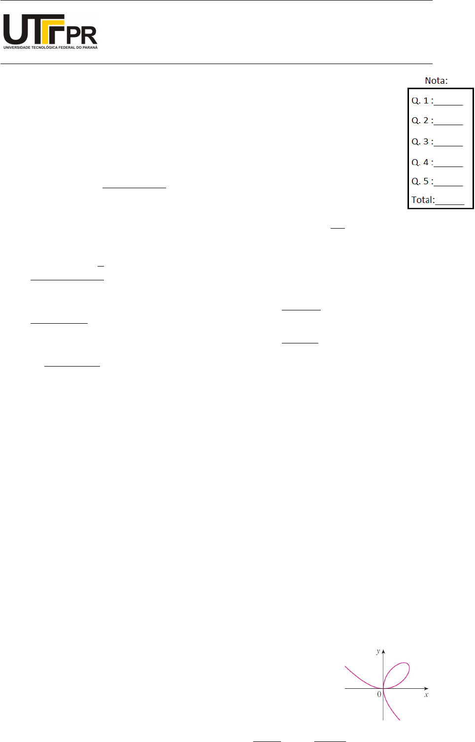 UNIVERSIDADE TECNOLÓGICA FEDERAL DO PARANÁ MA71A – Cálculo Diferencial e Integral I Profa Priscila Savulski Ferreira Avaliação presencial 2 — 27/10/2016 Nome:....................................................................................................................................... Instruções Avaliação individual e sem consulta. Não serão aceitas soluções sem as devidas e corretas justificativas. Durante a prova é vedado: sair da sala, usar aparelhos eletrônicos e calculadora. Formulário: f ′(x) = lim h→0 f(x+ h) − f(x) h . 1. (3) Escolha 3 funções de cada coluna para encontrar y ′ ou f ′(x) ou dy dx : (a) f(x) = (x10 − 4x3)(2x+ 3). (b) y = 45cos(x) + √ x 2x4 . (c) f(x) = x2 ln(x) + 2x. (d) y = x3 + 2x− 2 x2 + 1 . (e) f(x) = ex(tan(x) + 1). (f) f(x) = 7ex x2 + sen(x) . (g) y = (sen(x) + 5)4. (h) y = ln(x2 + 10)3. (i) y = sen(cos(x2)). (j) y = √ e5x 2 + 1. (k) y = ( x2 + ex sen(x) )3 . (l) f(x) = 2x + tan(x+ 1). 2. (2,5) Seja f(x) = x3 − 3x2 + 4. Encontre: (a) os pontos crı́ticos de f, (b) os intervalos de crescimento e decrescimento de f, (c) os intervalos onde f é côncava para cima e côncava para baixo, (d) os pontos de inflexão e pontos maximizadores e minimizadores locais. (e) Esboce o gráfico da curva. 3. (2,5) O folium foi proposto pela primeira vez por Descartes em 1638. A curva tornou-se famosa quando Descartes desafiou Fermat a encontrar a reta tangente à referida curva em um ponto arbitrário, uma vez que Fermat acabara de descobrir um método para encontrar retas tangentes. Fermat resolveu o problema facilmente, algo que Descartes foi incapaz de fazer. Nós sabemos que a inclinação de uma reta tangente pode ser facilmente encontrada através da diferenciação implı́cita. Mostre para Descartes que você também é capaz de encontrar a reta tangente no ponto (1, 1) considerando o seguinte folium: x3 + y3 = 2xy. 4. (2) Use a regra de l’Hôspital para calcular: lim x→0+ ln(x) 2x e lim x→0 ex − 1 sen(x) .