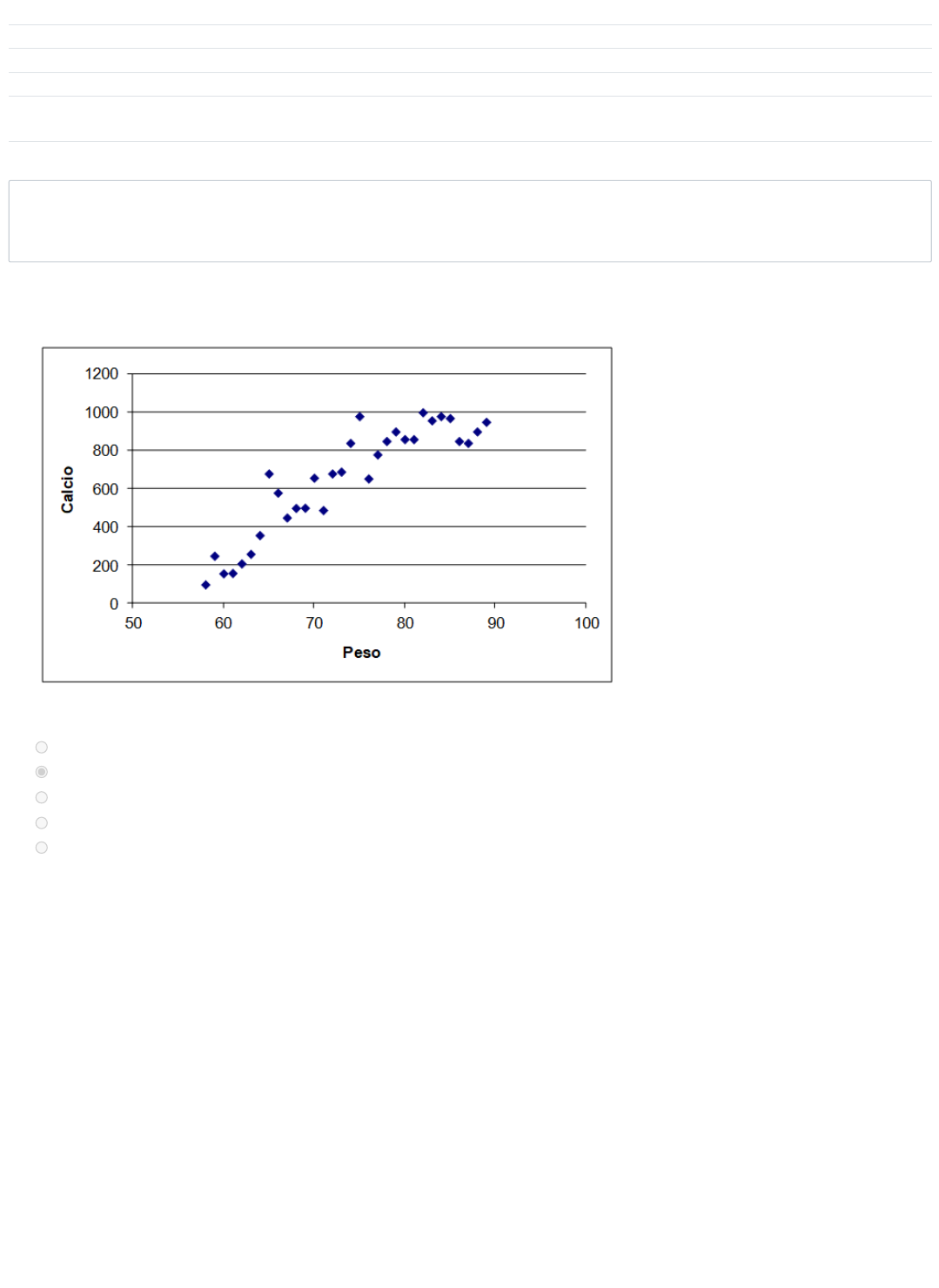 Iniciado em domingo, 10 nov. 2024, 23:56 Estado Finalizada Concluída em segunda-feira, 11 nov. 2024, 00:08 Tempo empregado 12 minutos Avaliar 10,00 de um máximo de 10,00(100%) Questão 1 Completo Atingiu 1,00 de 1,00 O objetivo de uma pesquisa entre obesos era relacionar o peso corporal (kg) com o consumo de cálcio (mg). O gráfico abaixo mostra a relação entre as duas variáveis. Analisando o gráfico, podemos concluir que: a. Quanto menor o consumo de cálcio maior o peso. b. Quanto maior o consumo de cálcio maior o peso. c. A variabilidade do consumo de cálcio é maior que a variabilidade do peso. d. Nâo há relação entre o consumo de cálcio e o peso. e. A média de peso foi de 75 kg, enquanto de consumo de cálcio igual a 600 mg. 11/11/2024, 00:08 Questionário Online: Revisão da tentativa https://ava.aquivocepode.com.br/avauniplan/mod/quiz/review.php?attempt=1283561&cmid=17926 1/6 Questão 2 Completo Atingiu 1,00 de 1,00 Questão 3 Completo Atingiu 1,00 de 1,00 Suponha que você queira fazer uma pesquisa sobre o analfabetismo de mães de crianças menores de um ano e o fato de a criança já ter recebido todas as vacinas indicadas pelo Ministério da Saúde para a idade atual da criança. Após aprovação pelo comitê de ética, foi realizado o estudo em unidade básica de saúde de um determinado município, que apresentou os seguintes resultados: A probabilidade de você sortear uma criança que não recebeu as vacinas de acordo com o calendário do Ministério da Saúde e que tem mãe analfabeta é: a. 31,6% b. 33,3% c. 22,8% d. 45,5% e. 7,6% Suponha que você trabalhe em um hospital e deseje realizar uma pesquisa sobre determinada patologia. Após aprovação pelo comitê de ética, você recebe todos os prontuários de pacientes atendidos no último ano com a patologia de interesse. Do total de 54 prontuários, 15 são do sexo masculino. Qual a probabilidade de sortear um prontuário e este ser do sexo feminino? a. 100% b. 72,2% c. 50% d. 27,7% e. Não há probabilidade. 11/11/2024, 00:08 Questionário Online: Revisão da tentativa https://ava.aquivocepode.com.br/avauniplan/mod/quiz/review.php?attempt=1283561&cmid=17926 2/6 Questão 4 Completo Atingiu 1,00 de 1,00 Questão 5 Completo Atingiu 1,00 de 1,00 Questão 6 Completo Atingiu 1,00 de 1,00 Suponha que tenha sido feito um estudo com 55 crianças recém-nascidas para avaliar se há diferença de peso ao nascer (gramas) entre crianças que foram ou não expostas ao álcool durante a gestação, devido ao consumo da gestante. Foi aplicado o teste de médias T de student, com nível de significância de 5%. Após a realização do teste, a conclusão final é de aceitar a hipótese nula (Ho), portanto podemos afirmar que: a. Não há como avaliar a associação segundo o teste realizado, o ideal seria realizar teste Qui Quadrado. b. A média de peso ao nascer foi maior entre aquelas crianças que foram expostas ao álcool durante a gestação. c. A média de peso ao nascer foi menor entre aquelas crianças que foram expostas ao álcool durante a gestação. d. Não houve diferença de média de peso ao nascer entre aquelas crianças que foram expostas ao álcool durante a gestação. e. A variabilidade de peso ao nascer entre crianças expostas ao álcool durante a gestação foi maior que as não expostas. Em um grupo de quatro pessoas, os valores de glicemia sanguínea foram (mg/dL): 120, 92, 120 e 88. Se uma pessoa com valor de glicemia de 228 mg/dL integrar-se ao grupo, o que ocorrerá com os valores da média, mediana e moda: a. Mediana e média serão os mesmos e a moda aumentará. b. Nenhum dos valores será alterado. c. Moda será a mesma e média e mediana aumentarão. d. Todos os valores aumentarão. e. Moda e mediana serão os mesmos e a média aumentará. Em um determinado estudo com 25.000 indivíduos, observou-se que a média de ingestão de medicamento sólidos por ano foi de 10 g/ano/pessoa, com desvio padrão de 1,5 g/ano/pessoa. Dessa maneira, podemos concluir que a probabilidade de sortear um indivíduo desta população que tenha consumido, no último ano, mais de 10 g de medicamento sólido é de: a. 10% b. 25% c. 50% d. 95% e. 75% 11/11/2024, 00:08 Questionário Online: Revisão da tentativa https://ava.aquivocepode.com.br/avauniplan/mod/quiz/review.php?attempt=1283561&cmid=17926 3/6 Questão 7 Completo Atingiu 1,00 de 1,00 Questão 8 Completo Atingiu 1,00 de 1,00 Suponha que você queira fazer uma pesquisa sobre o analfabetismo de mães de crianças menores de um ano e o fato de a criança já ter recebido todas as vacinas indicadas pelo Ministério da Saúde para a idade atual da criança. Após aprovação pelo comitê de ética, foi realizado o estudo em unidade básica de saúde de um determinado município, que apresentou os seguintes resultados: A probabilidade de você sortear uma criança que não recebeu as vacinas de acordo com o calendário do Ministério da Saúde é: a. 33,3% b. 22,8% c. 7,6% d. 45,5% e. 31,6% Estudo feito por Morosini et al (2011) sobre o tempo de permanência na internação de uma amostra de idosos em hospitais conveniados ao SUS, em Recife, entre 1998 e 2005, apresentou os seguintes resultados: 1998 - 8,7 dias 1999 - 10,6 dias 2000 - 11,4 dias 2001 - 11,3 dias 2002 - 12,1 dias 2003 - 11,9 dias 2004 - 11,8 dias 2005 - 10,7 dias Fonte: Morosini et al. Custo e tempo de permanência hospitalar de idosos residentes em Recife - PE. Geriatria & Gerontologia, v. 5, n. 2, p. 91-8, 2011. Segundo os dados fornecidos, a média e mediana de dias de internação entre 1998 e 2005 dos idosos de Recife foram, respectivamente: a. 11,06 e 11,35. b. 9,51 e 11,35. c. 11,35 e 10,15. d. 11,11 e 10,11. e. 10,19 e 12,18. 11/11/2024, 00:08 Questionário Online: Revisão da tentativa https://ava.aquivocepode.com.br/avauniplan/mod/quiz/review.php?attempt=1283561&cmid=17926 4/6 Questão 9 Completo Atingiu 1,00 de 1,00 Questão 10 Completo Atingiu 1,00 de 1,00 As Olimpíadas são uma opo