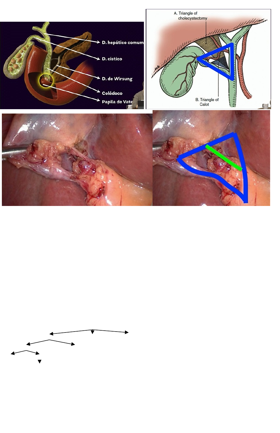 anatomia: Triângulo de Calot: usado para identificar a artéria cística, visualizado após abertura do infundíbulo limite superior: borda inferior do fígado limites laterais: ducto cístico e ducto hepático comum # linfonodo de Mascagni # Válvulas de Heister: presentes no ducto cístico, evitam que os cálculos saiam da vesícula # artéria hepática direita passa por trás do ducto hepático comum e pode dificultar a cirurgia colelitíase: cálculo na vesícula biliar (pode ser assintomática) coledocolitíase: obstrução das vias biliares por um cálculo (pode ser assintomática) colecistite aguda: inflamação na vesícula causada pelo cálculo colangite: inflamação das vias biliares secundária ao cálculo vascularização da vesícula biliar: Tronco Celíaco Artéria Hepática Comum Artéria Esplênica Artéria Gástrica Esquerda Direita Esquerda Artéria Cística Artéria Gastroduodenal Artéria Hepática Própria Bile: produzida no fígado e armazenada por reflux na vesícula maior parte é reabsorvida composta por: ágia, sais biliares, colesterol (maior parte da litíase biliar), bilirrubina, proteínas secreção (contração da vesícula e abertura do esfíncter de Oddi) estimulada por colecistoquinina, secretina e gastrina Clínica Geral: Dor em hipocôndrio direito Icterícia: bilirrubina direta Sinal de Couvervoisier-Terrier (tumores periampulares ex: colangiocarcinoma distal, cabeça do pâncreas, papila duodenal) vesícula aumentada sem dor associada, uma vez que a dilatação do órgão ocorreu de forma gradual e não aguda. normalmente oq causa dor é a dilatação aguda. “Vesícula murcha”: obstrução acima do ducto cístico, bile não chega na vesicula Diagnóstico: USG (top 1, entretanto não avalia bem o colédoco distal) Colangiopancreatografia retrógrada endoscópica CPRE: endoscopia com catéter nas vias biliares, contraste, pode ser terapêutica (drenagem) TC abdome Colangio Ressonância: não precisa de contraste Colelitíase Tipos de Cálculos: · amarelo: estase biliar (colesterol) · preto: hemólise bilirrubina indireta (microcálculos) → sempre operar · marrom: infecção (coledocolitíase primária) Fatores de Risco: 40 anos, mulher, obesidade, ACOs, fibratos, nutrição parenteral Quadro Clínico: dor em HCD e/ou epigástrio, aguda, transitória (intermitente), (cólica biliar), obrigatoriamente até 6 horas Diagnóstico: USG de vias biliares (imagem hiperecogênica + sombra acústica) 80% da população é assintomática Quando tratar? todos os sintomáticos e assintomáticos com chance de complicar (pancreatite, coledocolitíase ou neoplasia) · cálculos grandes > 2,5 / 3 cm (risco de neoplasia) · microcálculos (risco de pancreatite) · vesícula em porcelana (vesícula calcificada após vários processos inflamatórios → risco de neoplasia) · cálculos associados com pólipos grandes (risco de neoplasia) · pólipo isolado se >1cm, 50-60 anos e crescimento) · presença de anomalias congênitas · anemias hemolíticas · pacientes com lesão medular # provas antigas consideram que as cirurgias por pólipos devem ser abertas Colecistite Aguda inflamação aguda da vesícula biliar por impactação do cálculo, normalmente amarelo, no ducto cístico ou no infundíbulo Fisiopatologia: As obstruções provocam distensão da vesícula. a dilatação implica em dificuldade de vascularização da artéria cística e consequente isquemia do órgão. Isquemia e estase biliar evoluem com inflamação e infecção. Clínica: dor abdominal, sinal de Murphy, leucocitose e febre, duração maior que 6 horas. Diagnóstico: USG de vias biliares (cálculos hiperecogênicos com sombra acústica, imóvel, sinais inflamatórios como distensão, espessamento da parede da vesícula, líquido pericolecístico, sinal de Murphy sonográfico) ou cintilografia (padrão ouro, pouco usado) Mnemônico: Sem Mais Ficar Levando Porrada Ufa SUSPEITO: 1A+1B CONFIRMADO 1A+1B+1C Classificação: · Grau III (grave): disfunção orgânica · Grau II (moderado): sem disfunção + leucocitose > 18.000 ou massa palpável e dolorosa em QSD ou evolução>72h ou sinal de complicação local · Grau I (leve): ausência de critérios para moderada e grave Tratamento: internação hidratação analgesia antibióticos (cobertura para Gram negativos, positivo e anaeróbios) (casos leves, ou seja, sem sinais infecciosos, pode-se usar por apenas 24h) colecistectomia videolaparoscópica cirurgia precoce 48h-72h se apresentação tardia, indicar cirurgia em 6-10 semanas da resolução do quadro(caindo em desuso, atualmente se faz a CVL o quanto antes, se paciente não tolerar, realizar colecistostomia percutânea, punção) Guideline de Tokyo: prevê, para o grau III, tratamento conservador até correção da disfunção, seguida por CVL por cirurgião experiente, se necessário usar a colecistostomia. Complicações: Colecistite Enfisematosa: gás na parede da vesícula produzida por bactérias (Clostridium perfringens). maior gravidade. paciente idoso, diabético e imunossuprimido. TC de abdome. tratamento: CVL. usg não avalia gás. Colecistite Alitiásica: vesícula que não se contrai. estase biliar + isquemia. pacientes em dieta zero, NPT, grande queimado. maior gravidade (UTI + febre + leucocitose inexplicada) Fístula Biliar: 1) fístula colecistobiliar/ síndrome de Mirizzi: icterícia progressiva→ colangite de repetição, exames contrastados de vias biliares: CPRE ou CTP (colangiografia transhepática percutânea)--> dilatação intra hepática acima do ponto cístico, confirmação diagnóstica apenas no ato operatório. # colangiografia intraoperatória confirma ou descarta existência de fístulas # rafia = sutura # “mexi em via biliar? botei o dreno de Kehr” dreno em formato de T, uma pontinha pra cima (hepático comum), outra pra baixo (colédoco), e a maior para pele. garante perviedade e é meio de introdução de contraste para exames pós operatórios. r